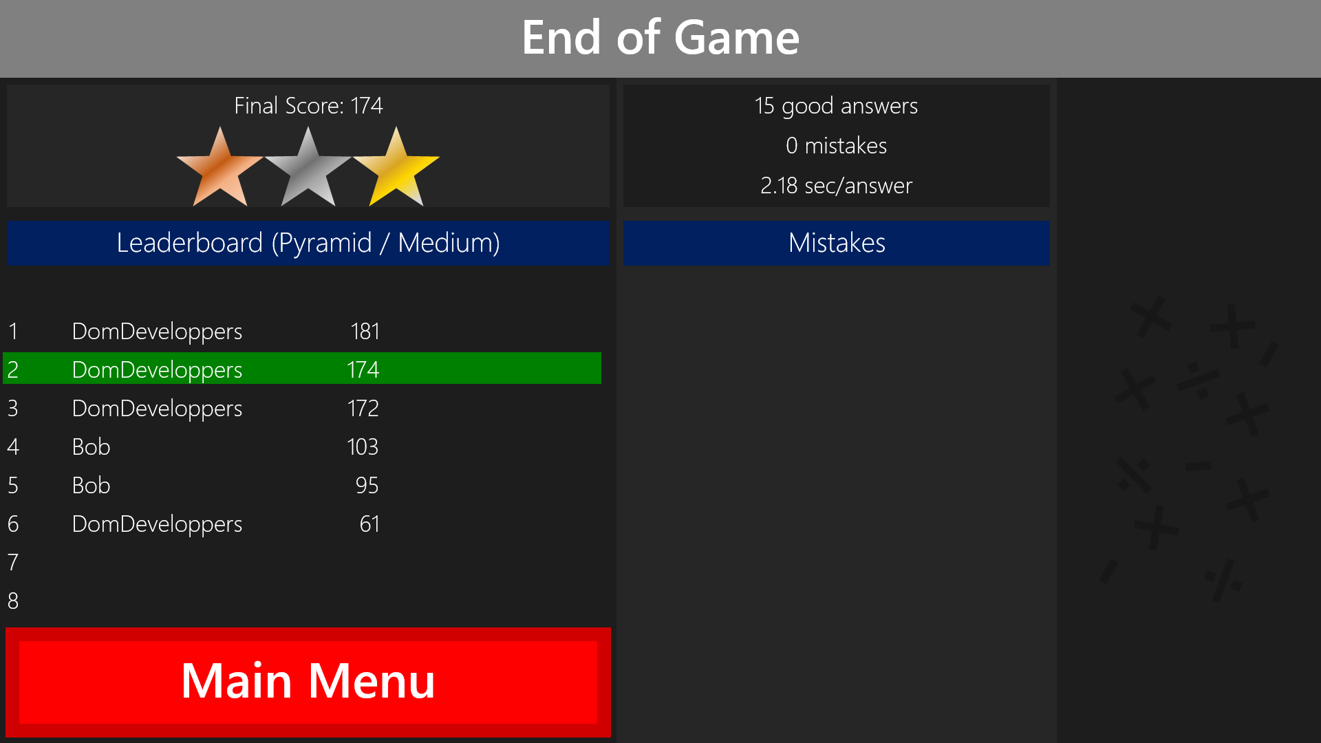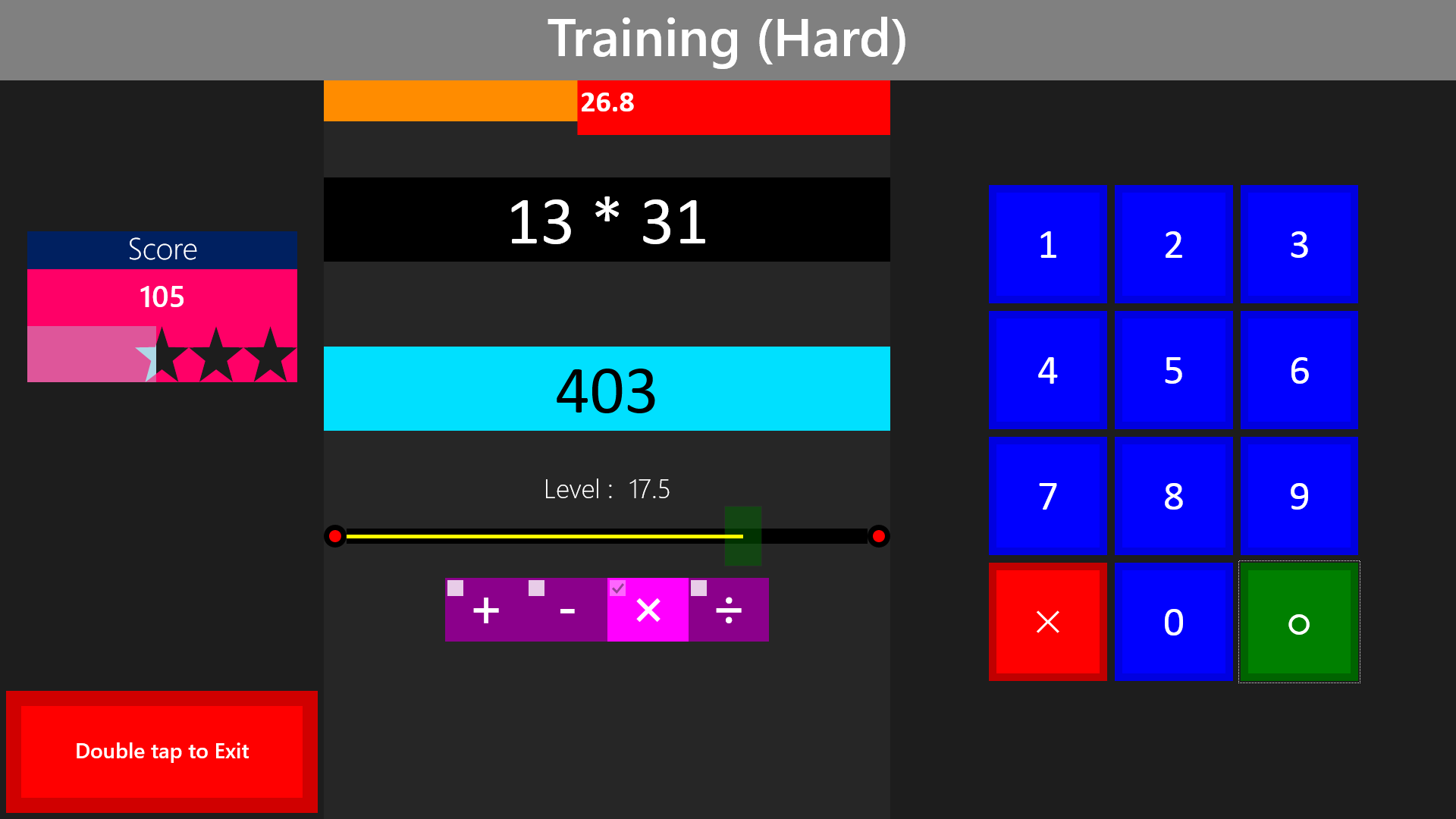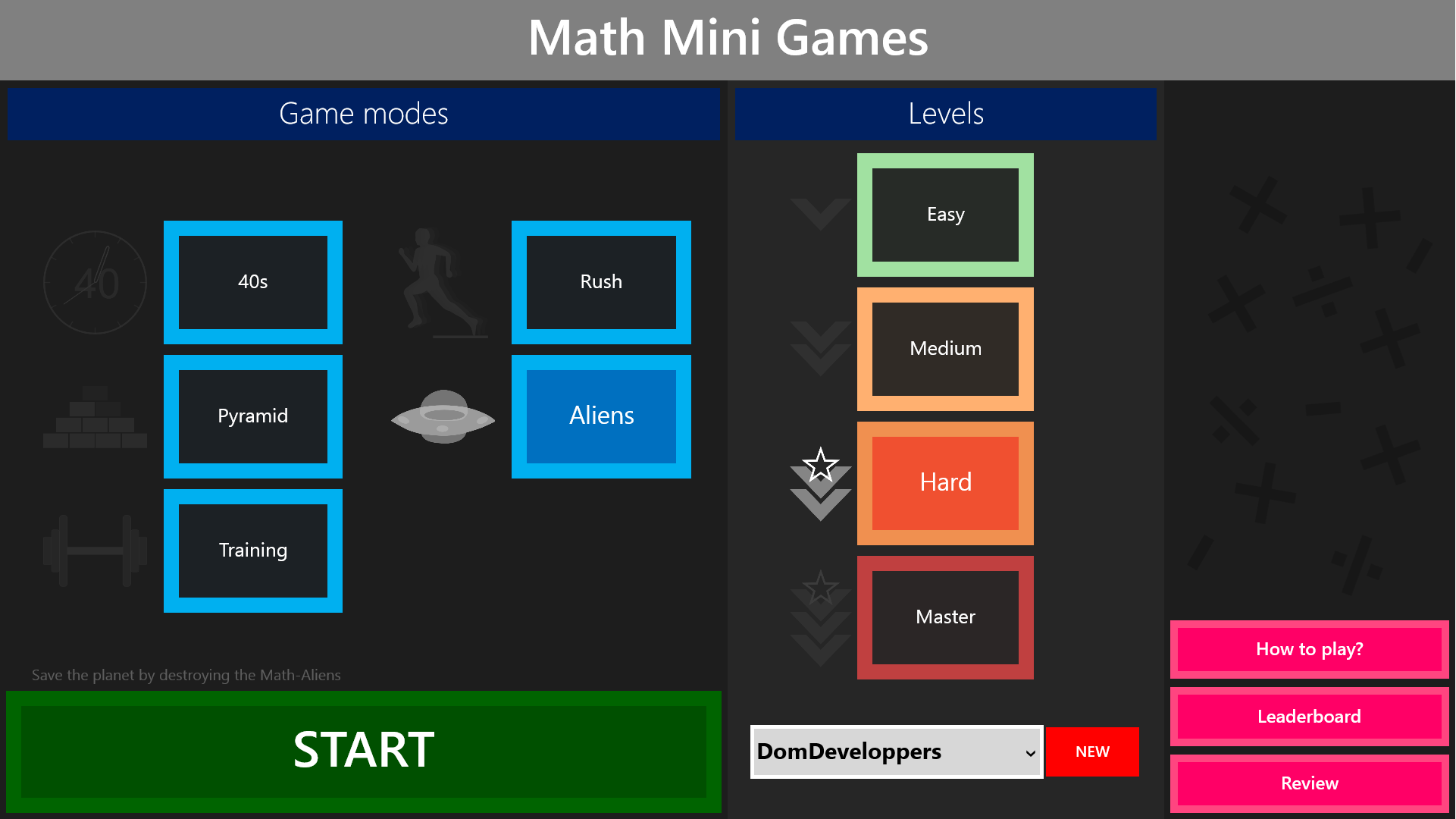 5 different Math challenges - 40s, Rush, Pyramid, Aliens, Training4 different levels - Easy, Medium, Hard, MasterUse of touch, laptop keyboard, desktop keyboard or number padMultiple local user namesKeep track of your leaderboardFun and challenging ways to train your arythmetic skillsMental Math ChallengeAlien InvadersMath GameMath for kidsHuman CalculatorAddition Subtraction Multiplication Division