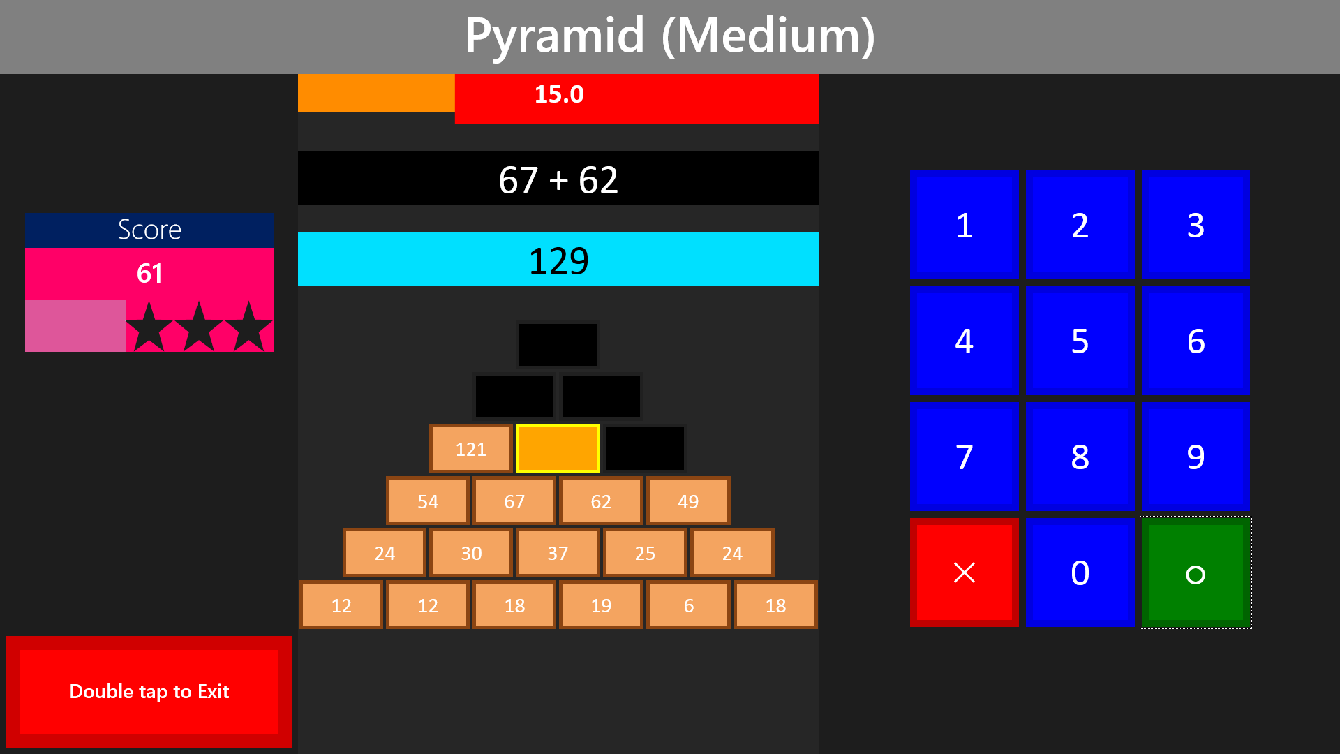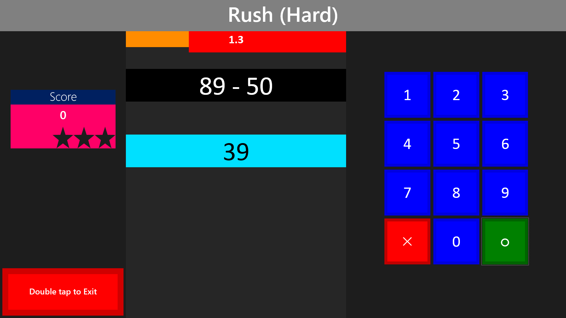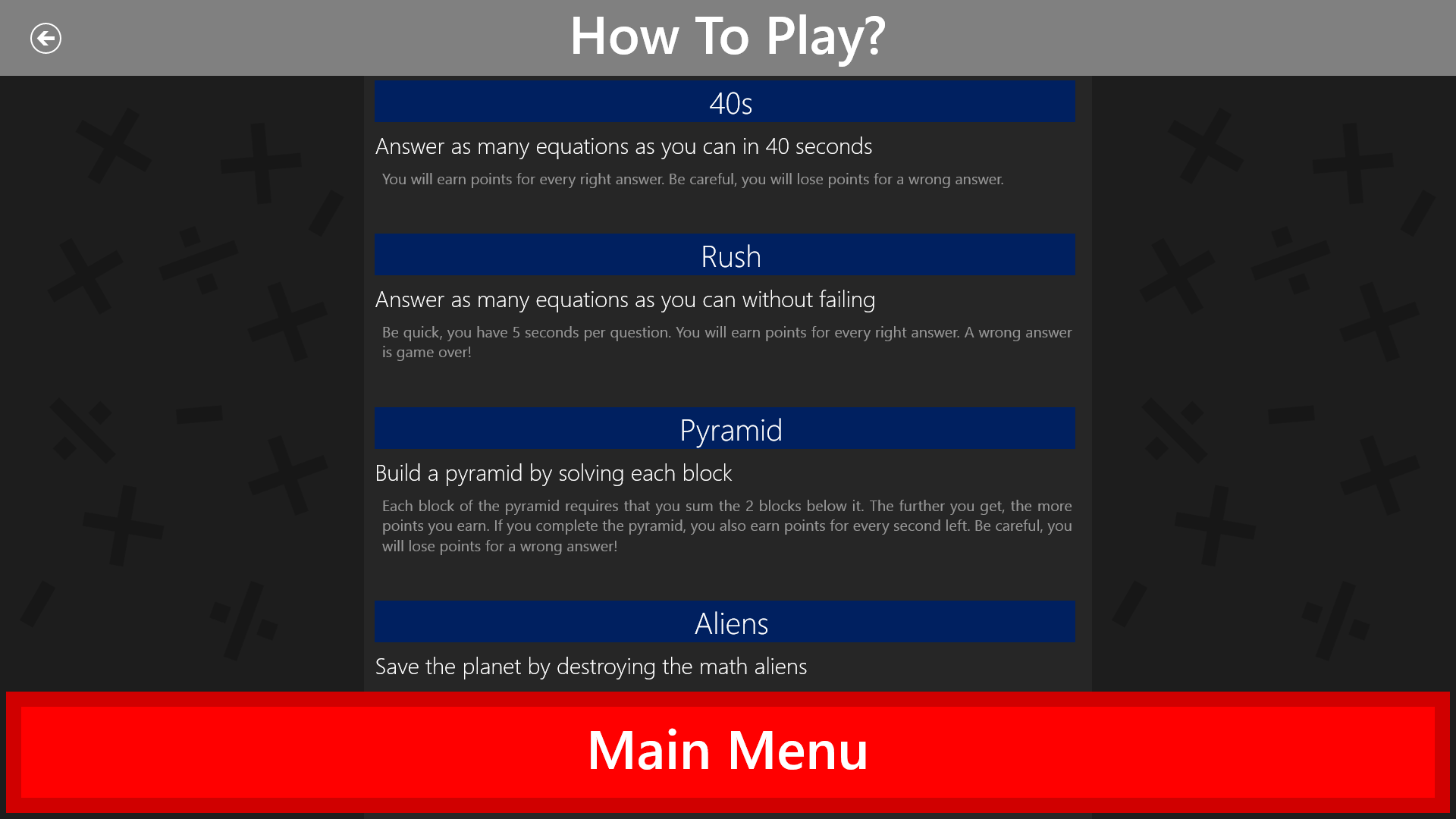 5 different Math challenges - 40s, Rush, Pyramid, Aliens, Training4 different levels - Easy, Medium, Hard, MasterUse of touch, laptop keyboard, desktop keyboard or number padMultiple local user namesKeep track of your leaderboardFun and challenging ways to train your arythmetic skillsMental Math ChallengeAlien InvadersMath GameMath for kidsHuman CalculatorAddition Subtraction Multiplication Division