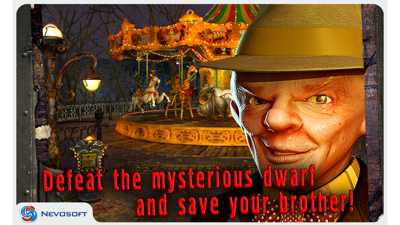Only you can rid the world from his presence, but it won’t be easy. His traps and tests are waiting for you. You'll need to make your way around the park looking for useful things in all the old rides. You'll have to open a number of locks, outsmart the swindlers in the shell game, fire the cannon on the Pirate Ship and blast off to the Moon. There's no turning back. You need to get to the safe where the evil dwarf keeps his contracts for all the lost souls. Contracts that were signed in blood. Moreover, one of these contracts has your younger brother's name on it – and there's another one ready just for you!