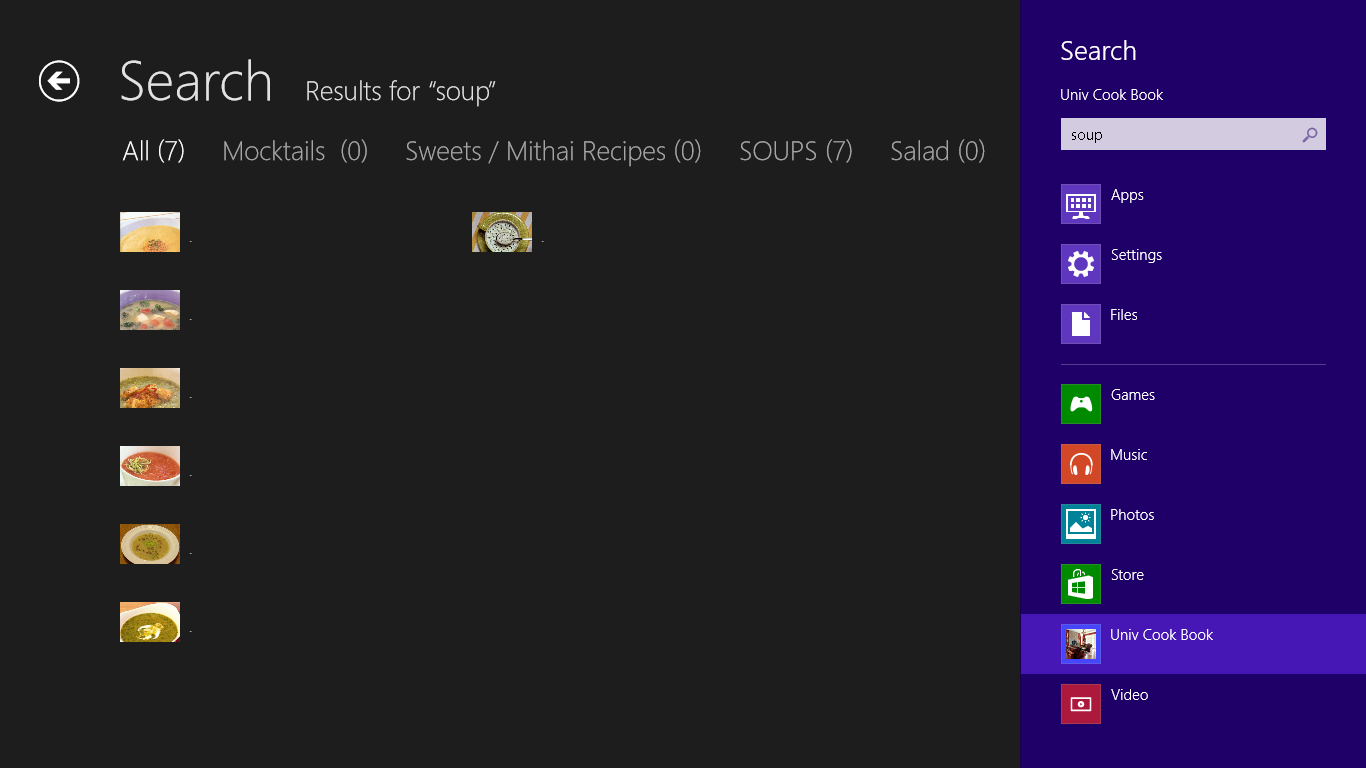 Univ Cook Book is a complete cook book for snacks and refreshing food items.Univ Cook Book has contain different type of items.Univ Cook Book contain following cooking items Mocktails,Sweets / Mithai Recipes,SOUPS,Salad,Cocktail & Snacks.It has different items and cool food.Easy making,lot of items.Univ Cook Book has contain search box and Minimize list controls.