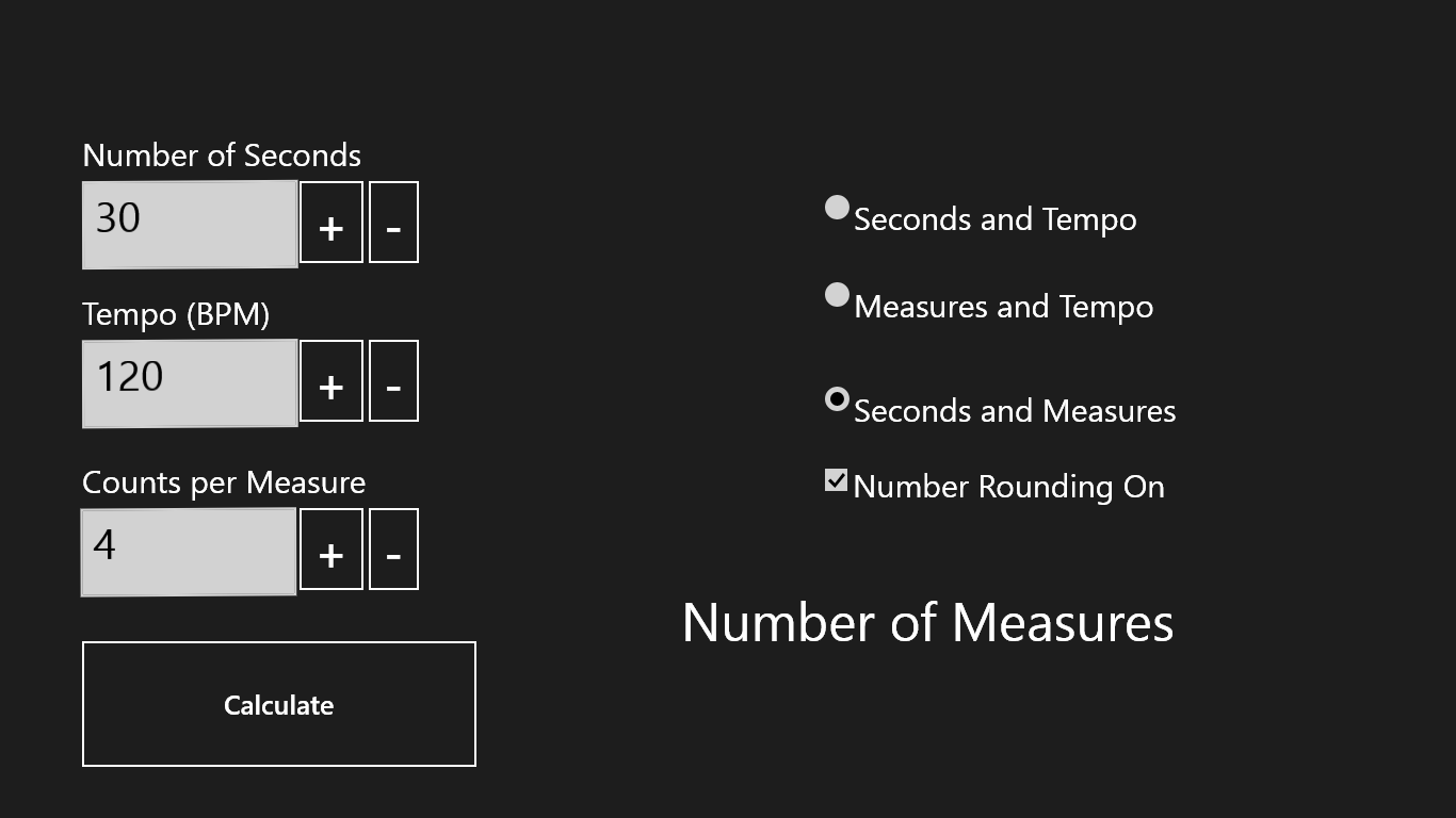 Simple converter between measures, tempo, and time. Useful for composers who need to write a certain amount of music. Note: App does not support portrait orientation.