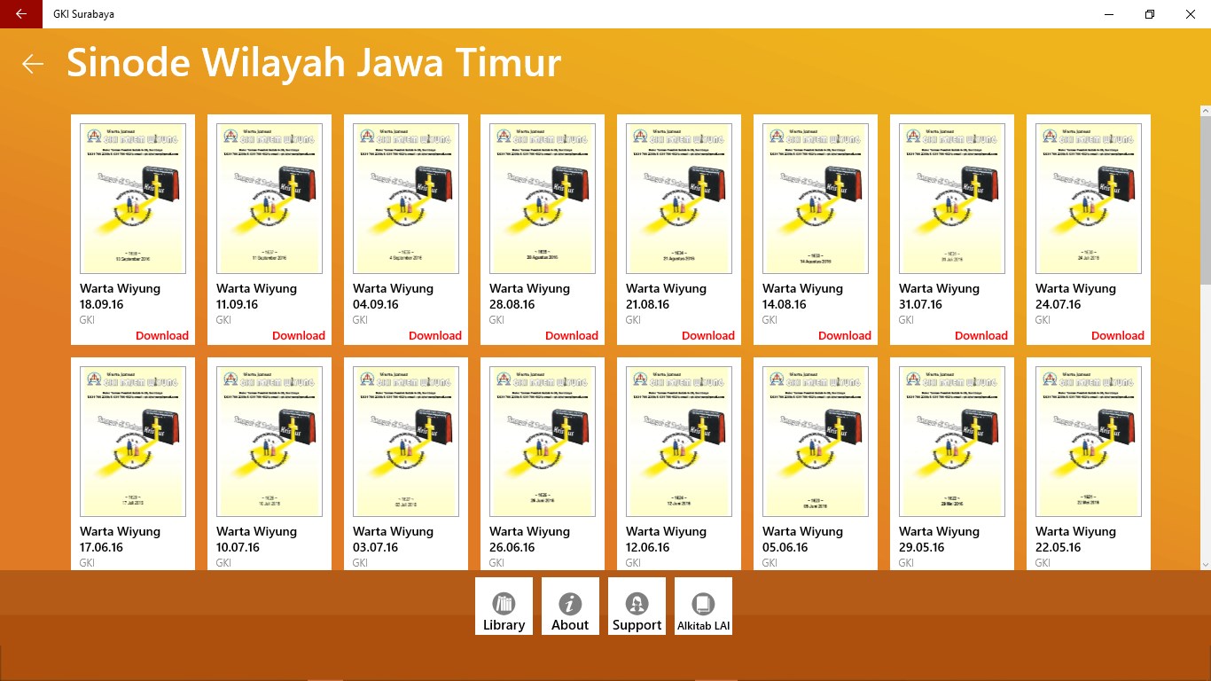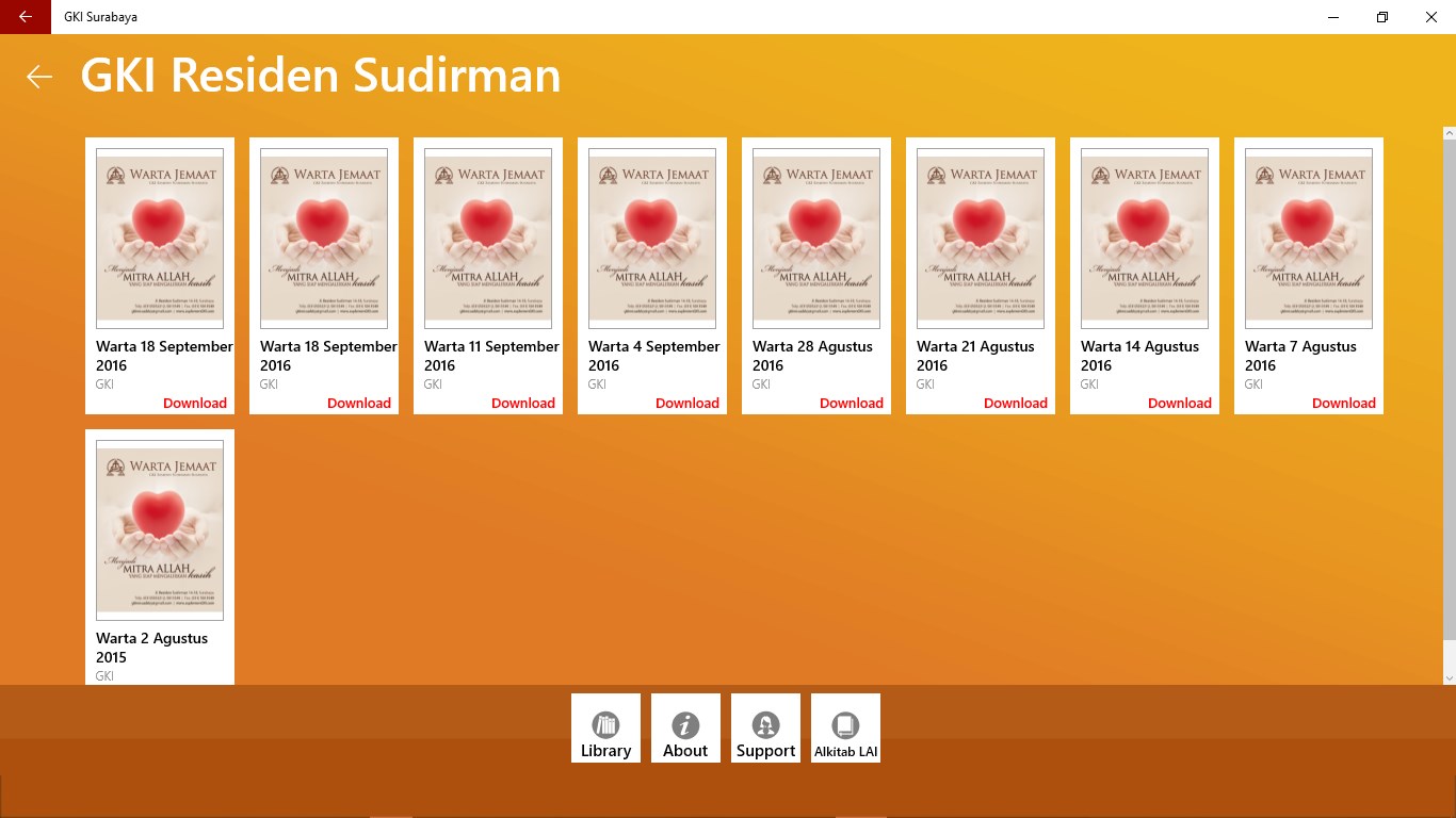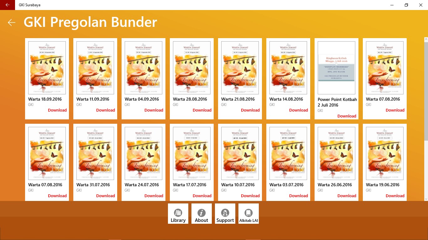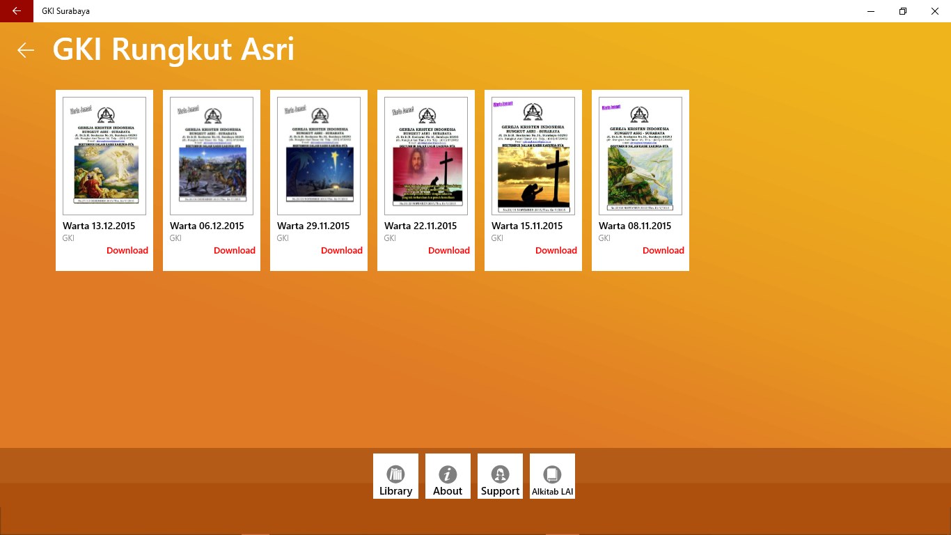 Aplikasi GKI Surabaya merupakan aplikasi yang memuat semua Warta Gereja, Kidung Agung, Info terkini seputar acara yang akan di gelar atau info apapun terkait acara khusus dan atau Ibadah umum di masing-masing Gereja GKI yang ada di Surabaya; yang dimuat secara digital dan bisa didownload gratis di Gadget masing-masing.