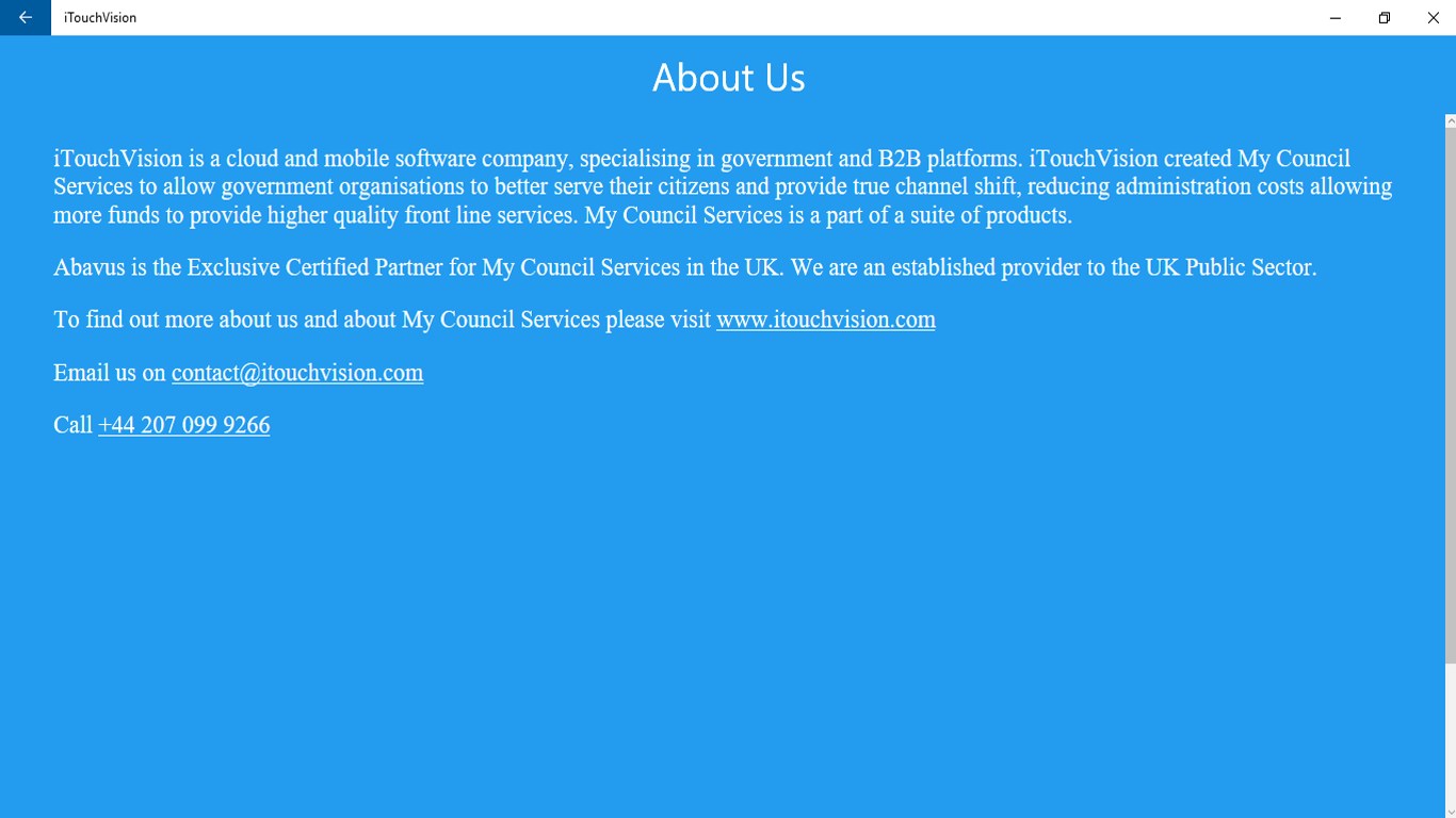 iTouchVision created My Council Services to allow government organisations to better serve their citizens and provide true channel shift, reducing administration costs allowing more funds to provide higher quality front line services. My Council Services is a part of a suite of products.