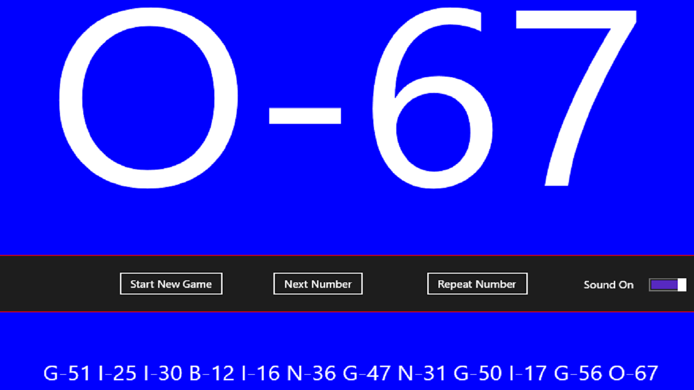 Free Bingo Caller app for Windows and Windows Phones. Great for home games as well as bigger gatherings. Simple and intuitive user interface. Voice narration available on all compatible devices (we are working on adding more devices). Big, easy to see numbers as well as a display of all numbers in the current game sequence for verifying winners.