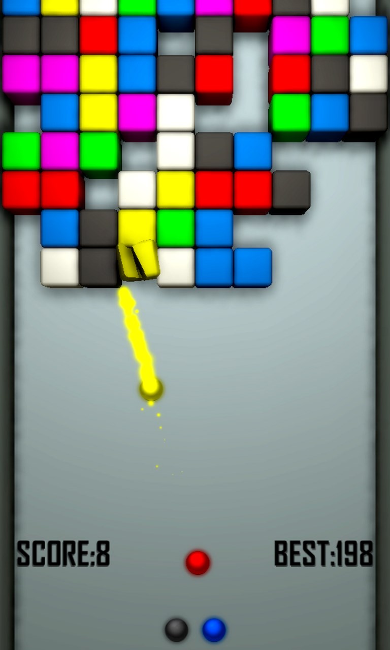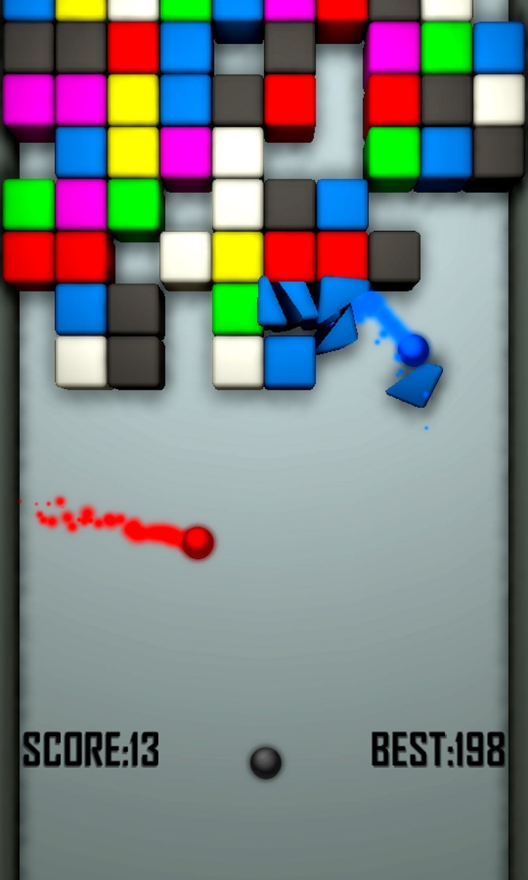 Your goal is to clear all bricks from the board, scoring as many points as possible. You must shoot at them with balls of same color.