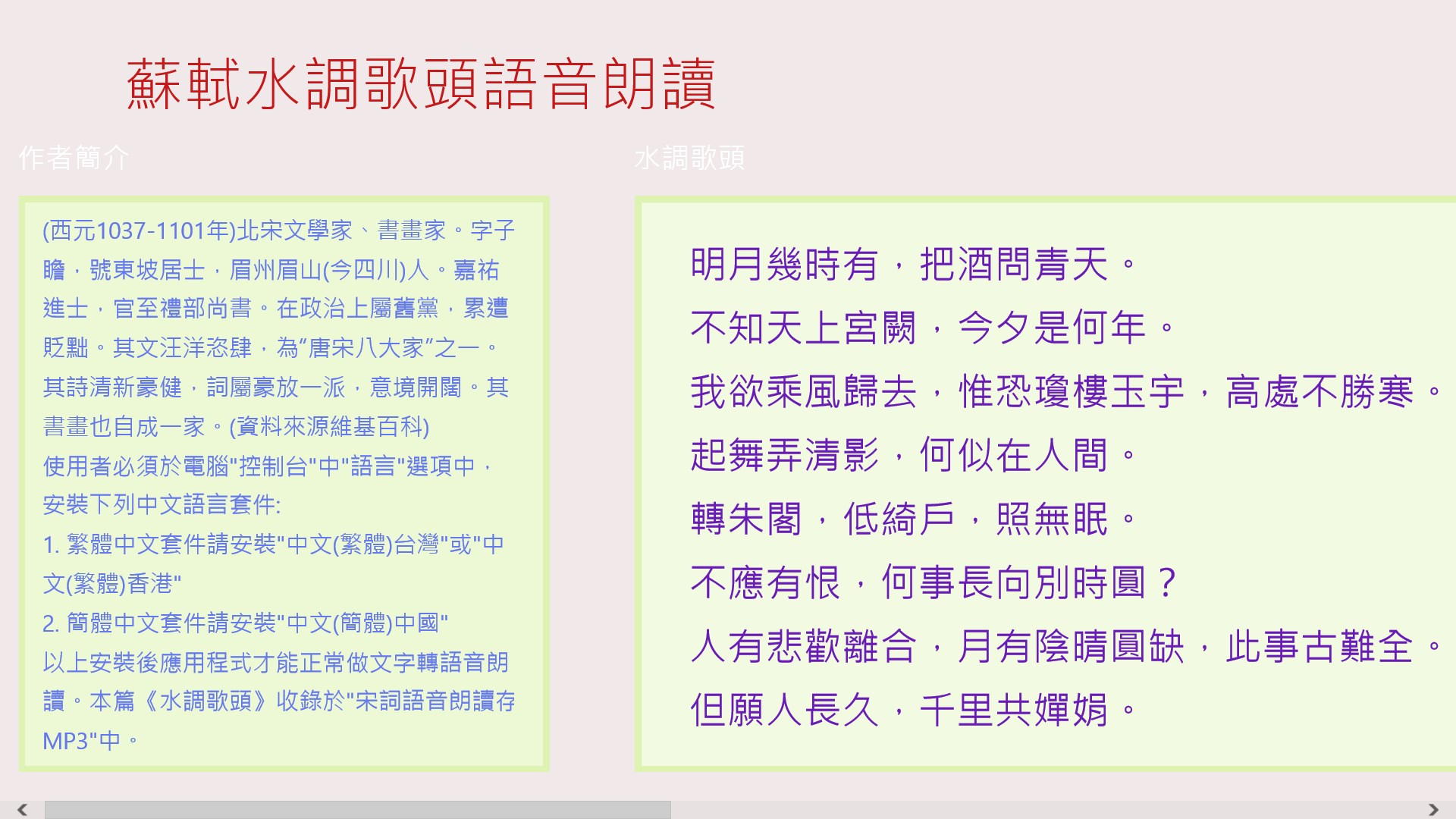 本應用程式展示蘇軾作詞"水調歌頭"全文,內容為正體中文,提供文字轉語音朗讀功能。使用者必須於電腦"控制台"中"語言"選項中,安裝下列中文語言套件: