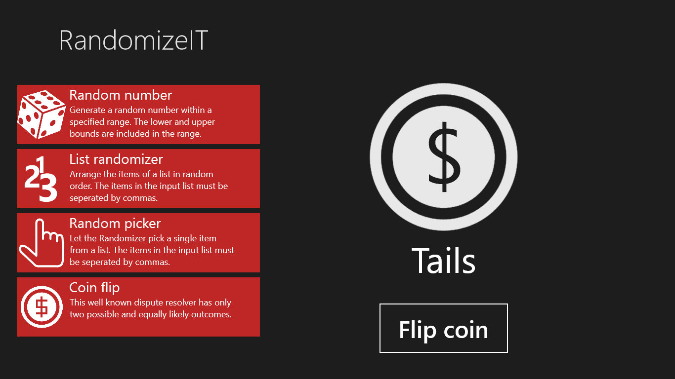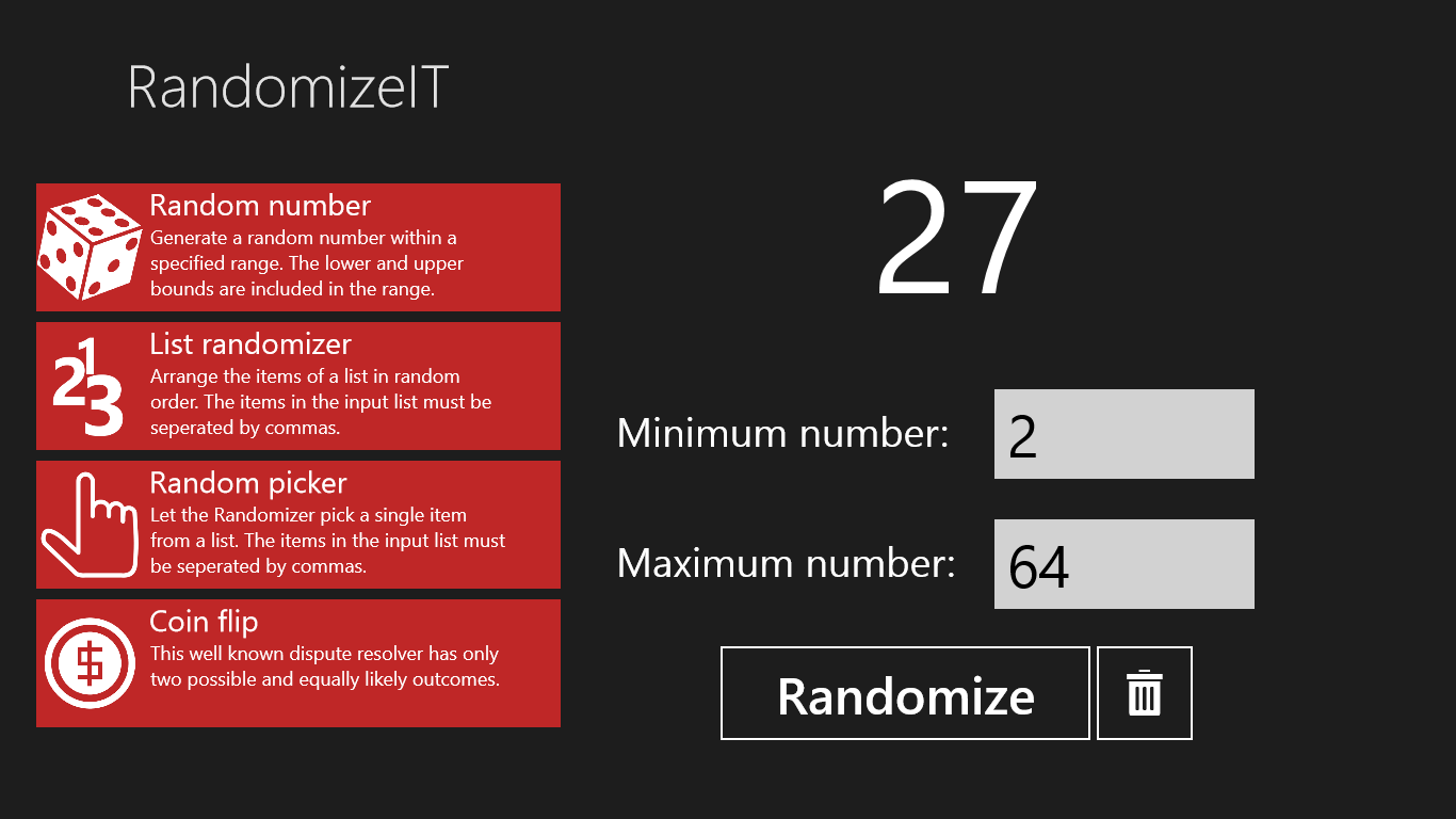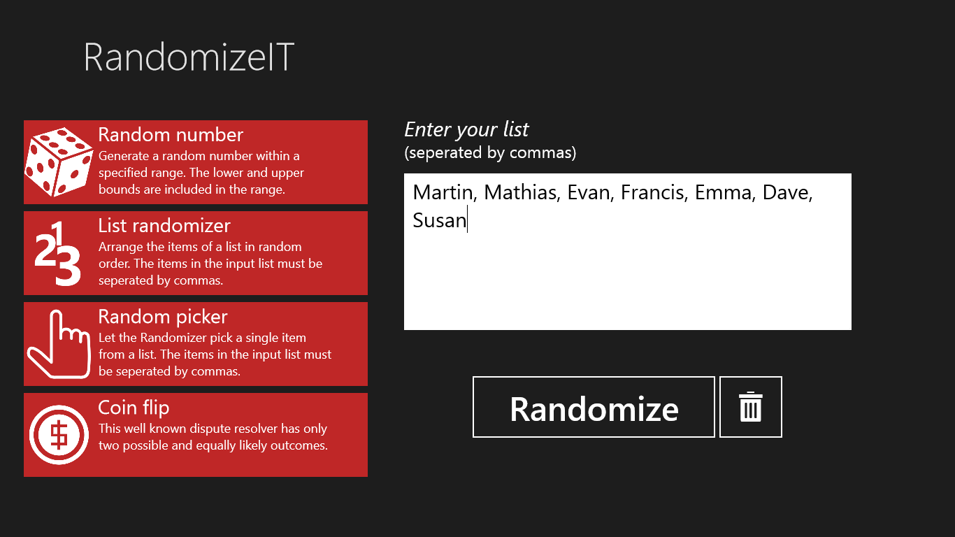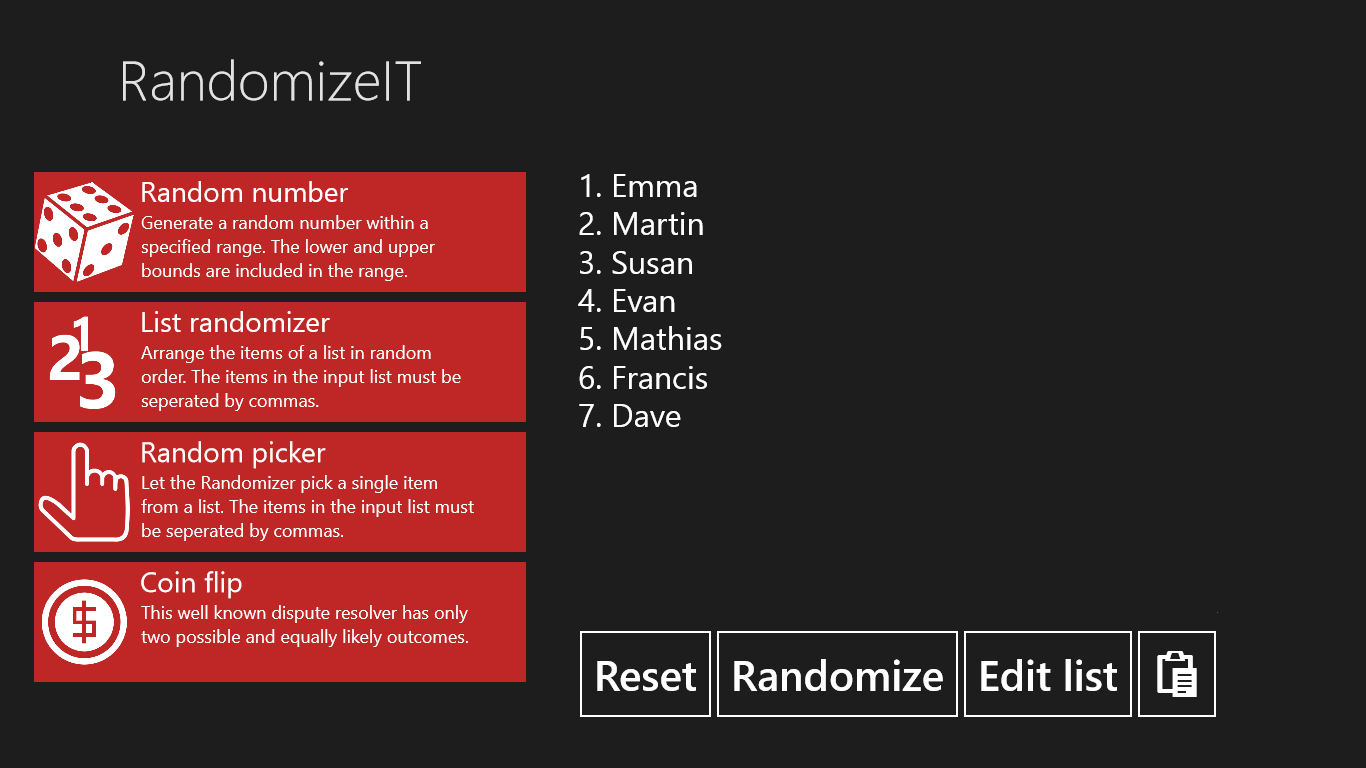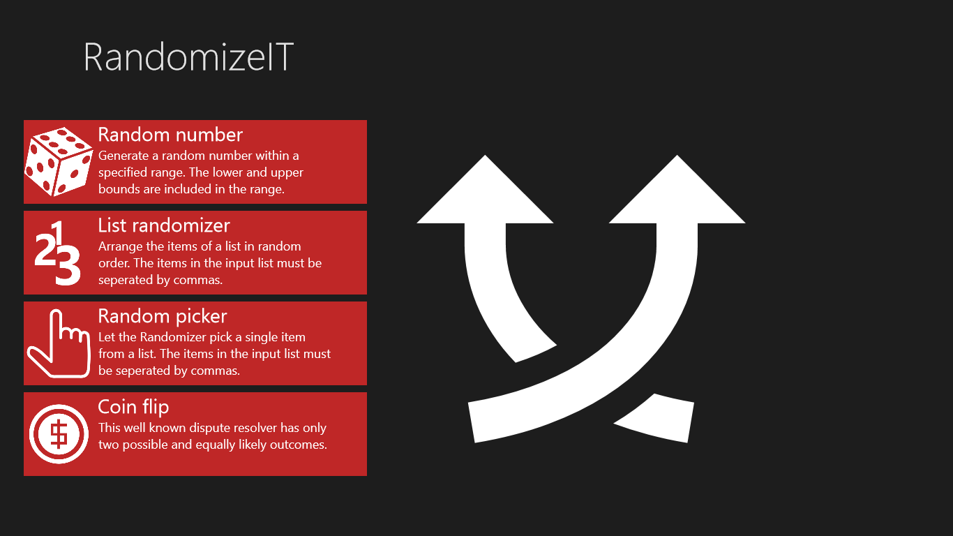 RandomizeIt is a simple multi-tool which can help you make all those tough decisions. What should I have for lunch today? Who should do the dishes? etc. Worry no more, RandomizeIT will choose for you.