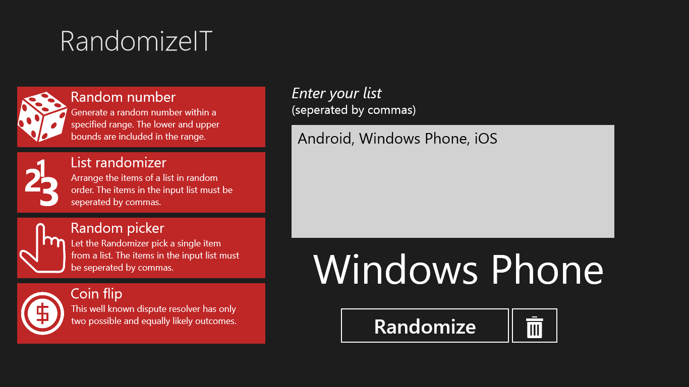 - Random picker: Let RandomizeIT pick a random item from a specified list. Can't decide which movie to see? Enter the options and let RandomizeIT pick one for you.