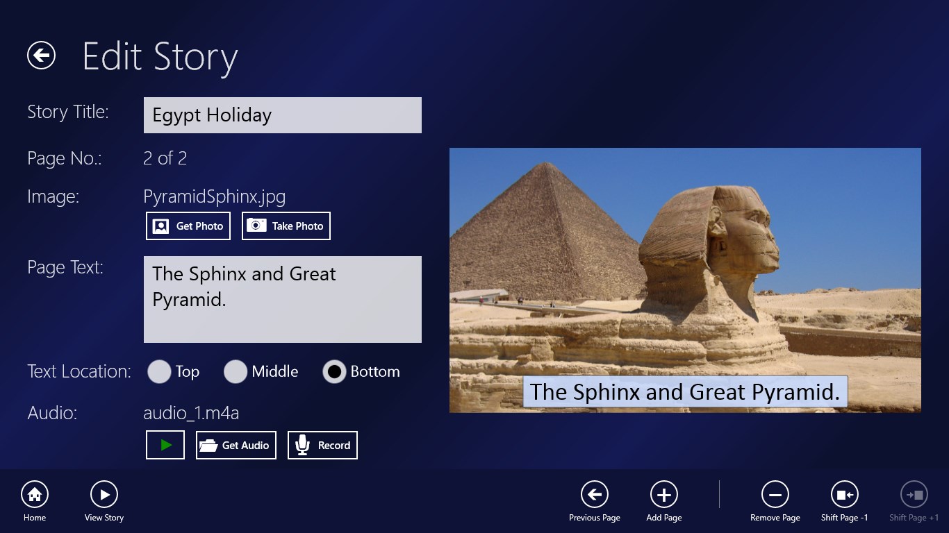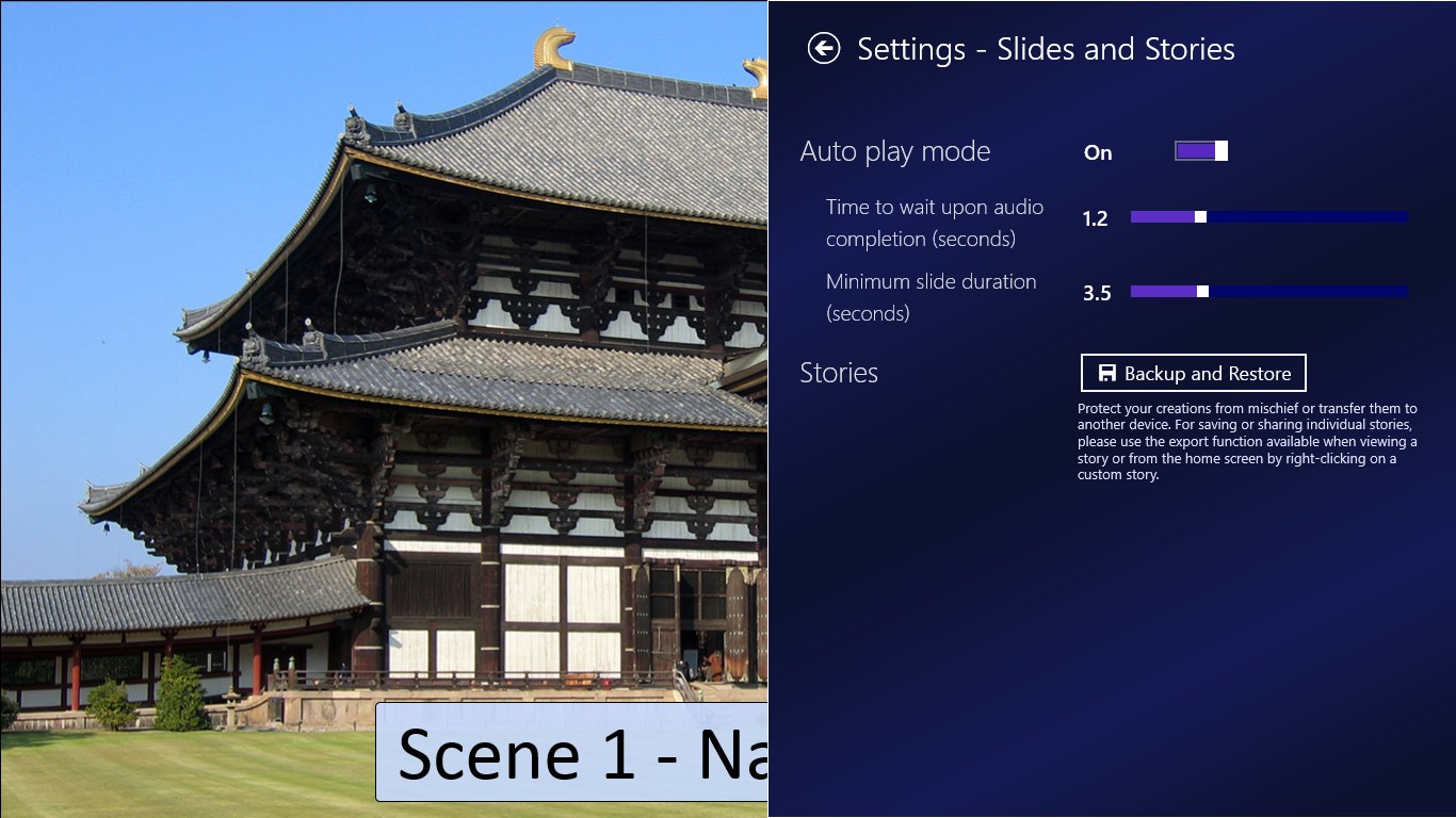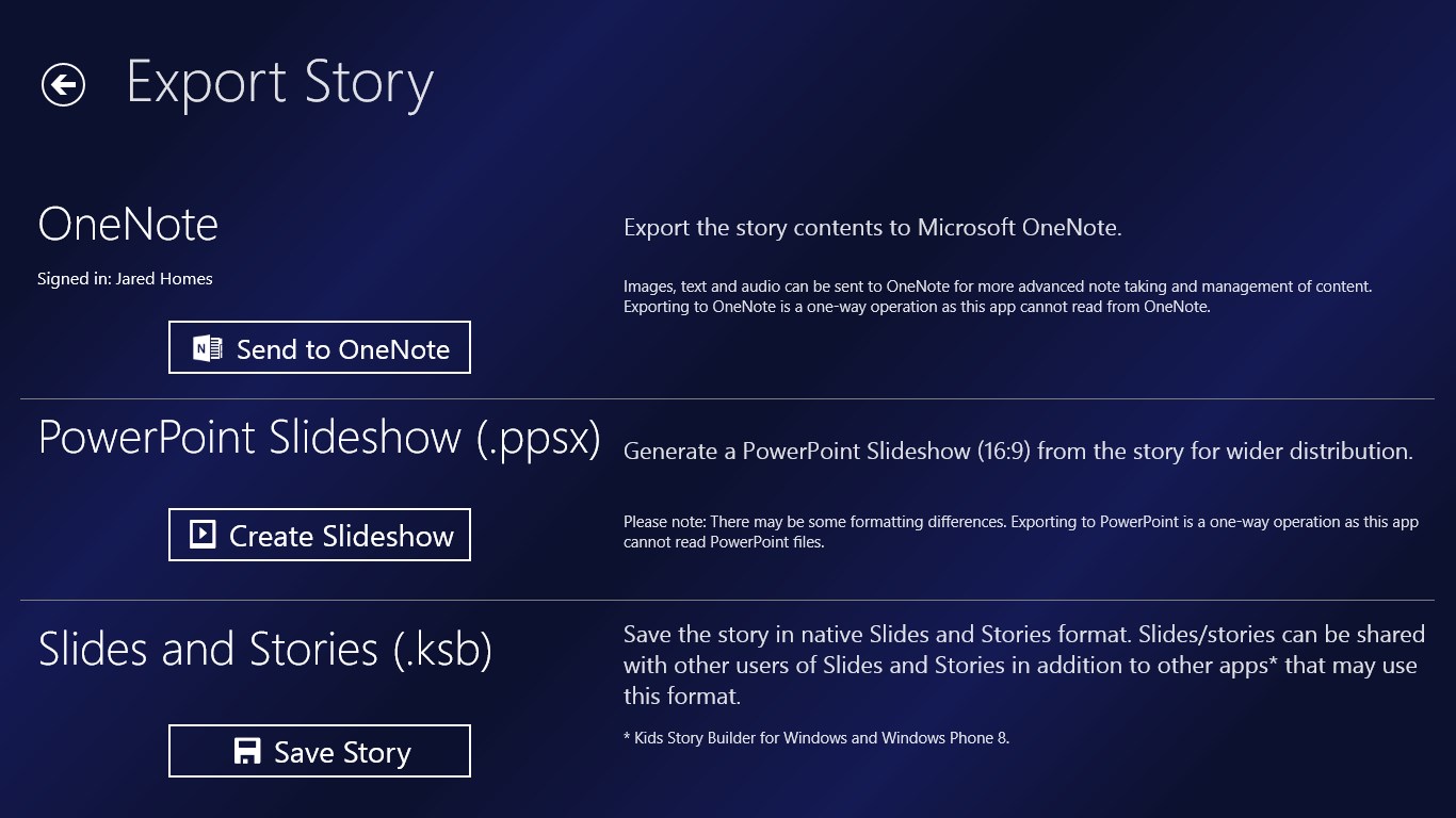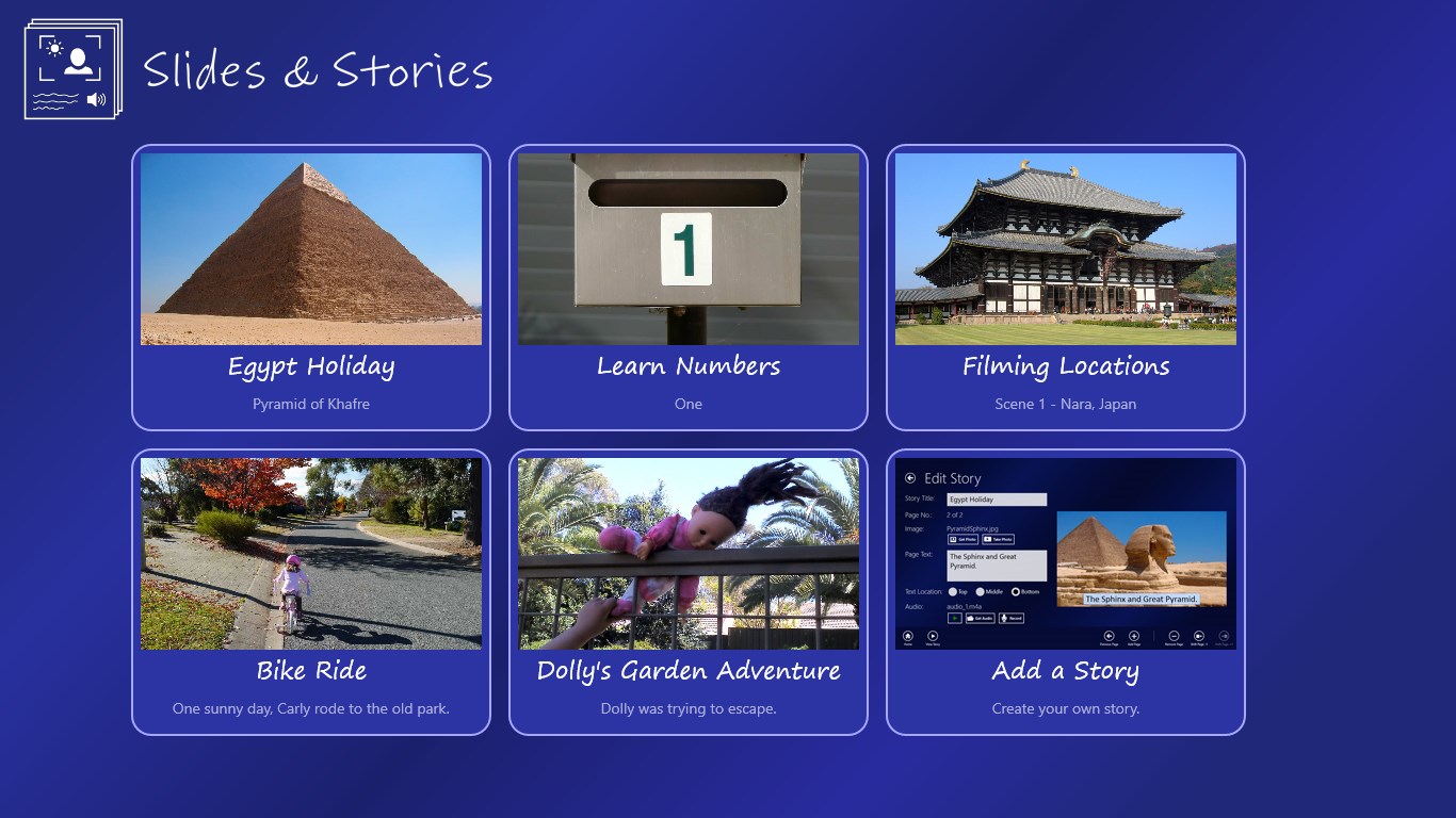 Slides and Stories provides a quick and easy way to build slideshows, stories and photo based notes using images, text and audio. Use the camera and microphone of your device or pick existing content from your libraries.