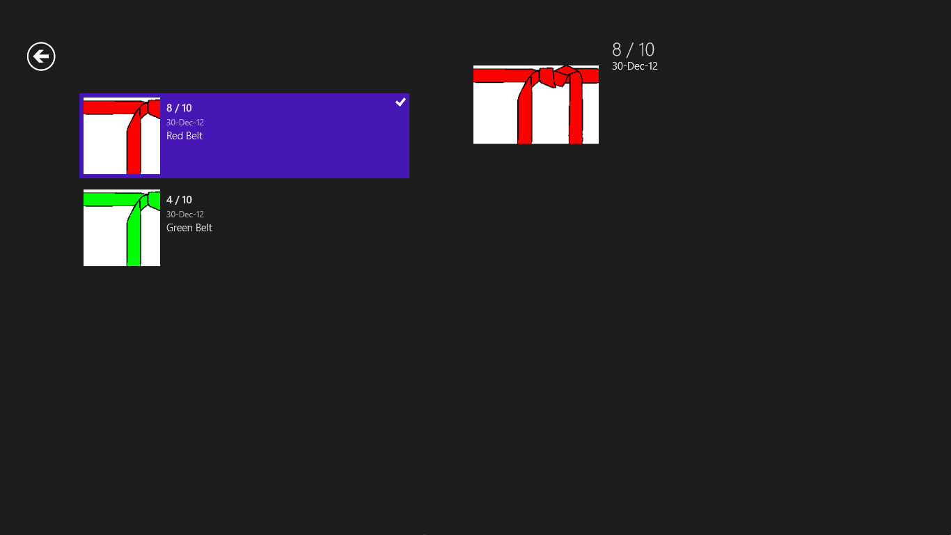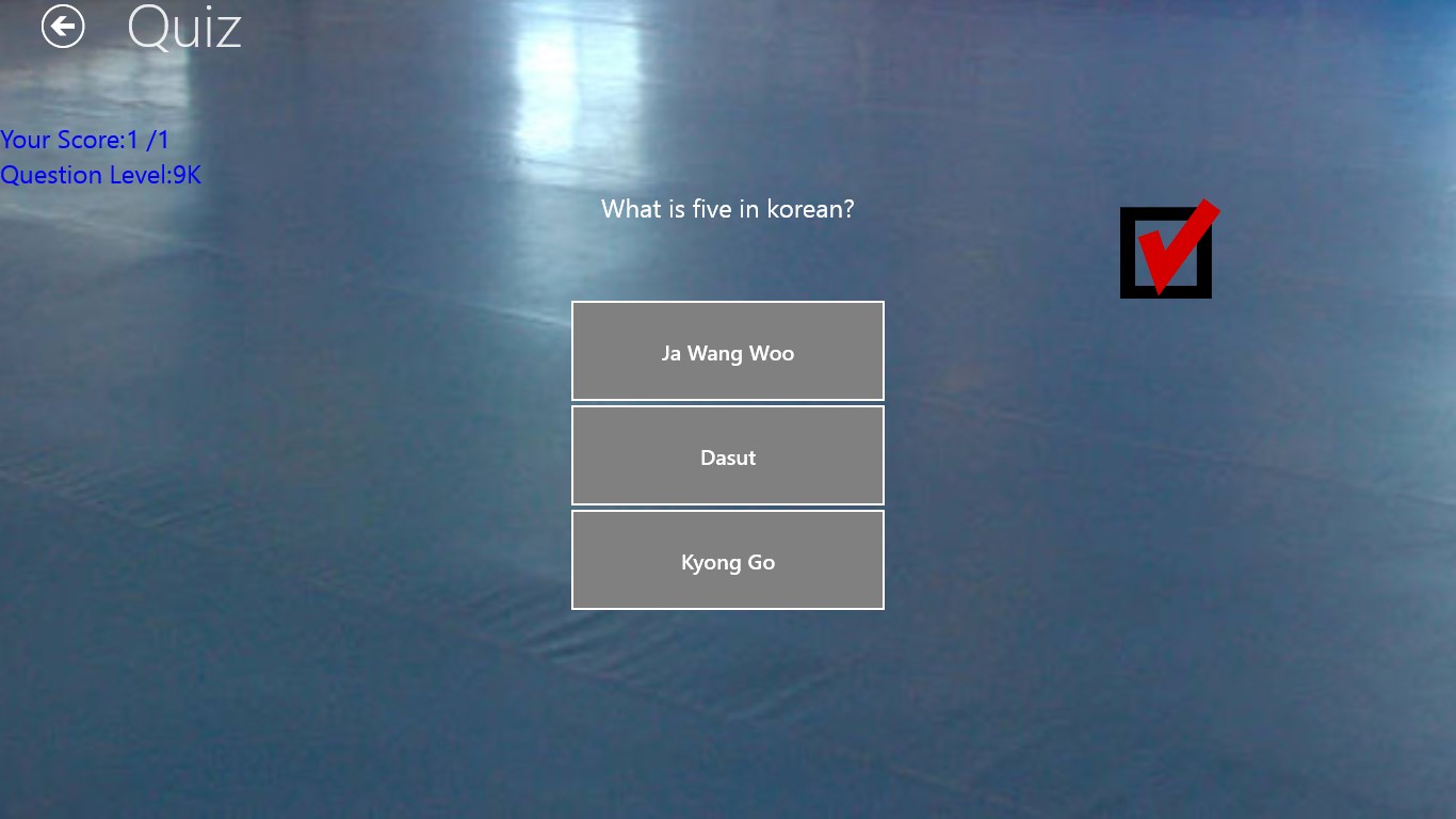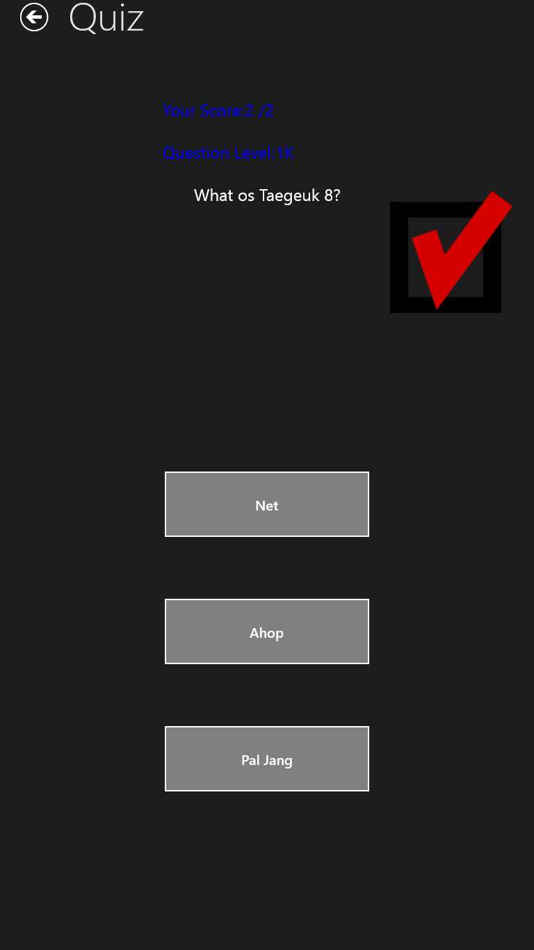 Taekwondo World is an app that tests a student's knowledge of WTF Taekwondo. It is loosely based around the Kukkiwon WTF grading syllabus. It asks random questions about Taekwondo, Korean terms, Taekwondo's meaning and philosophy. It also grades the questions and presents the user with a belt equivalent for their score.