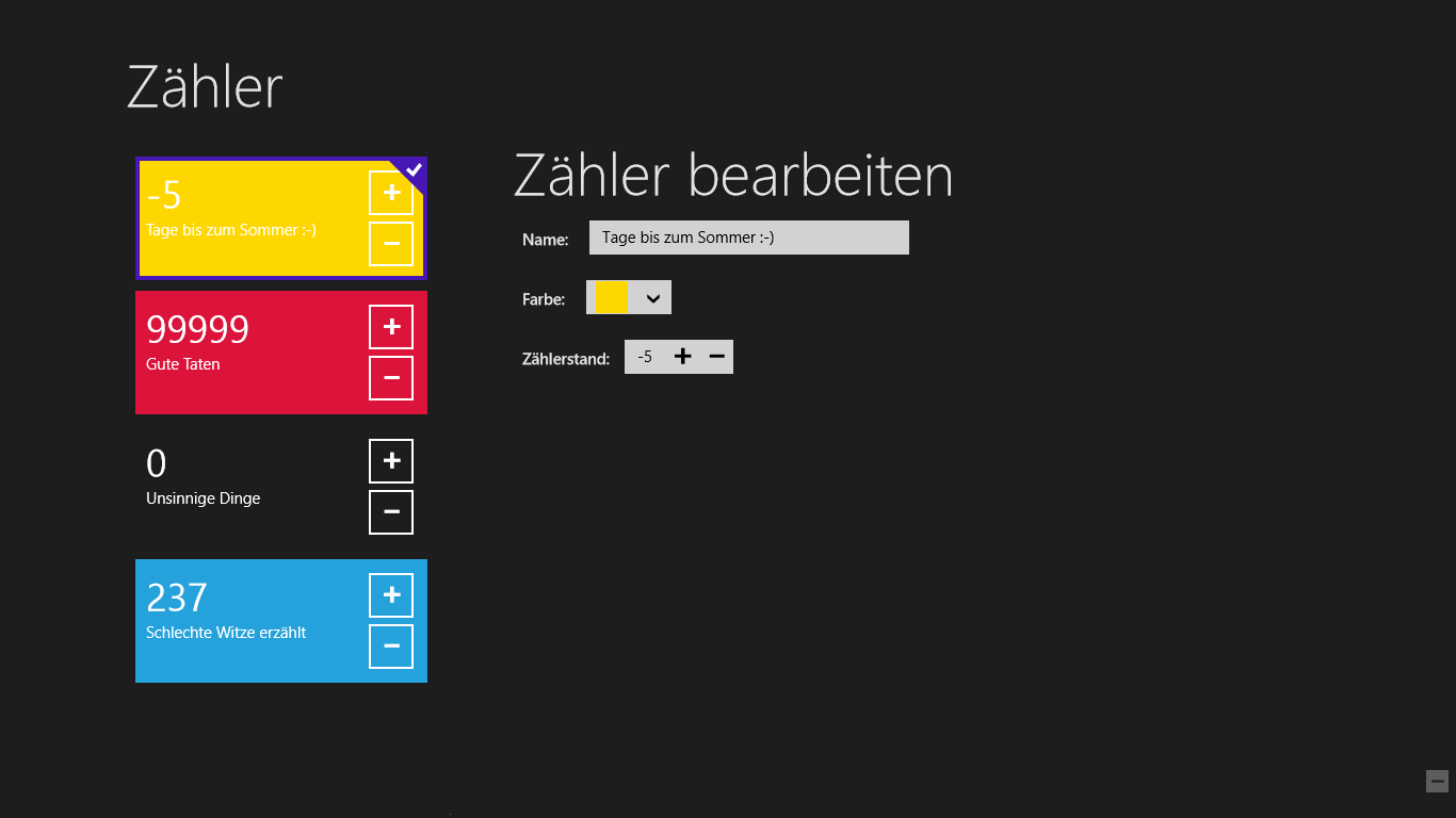 Und dabei ist es völlig egal, was du zählen möchtest oder wie viele Dinge. Du kannst dir so viele Zähler anlegen, wie du brauchst, sie ändern, umbenennen oder ihnen eine passende Farbe zuweisen, damit du sie schnell wiederfindest.