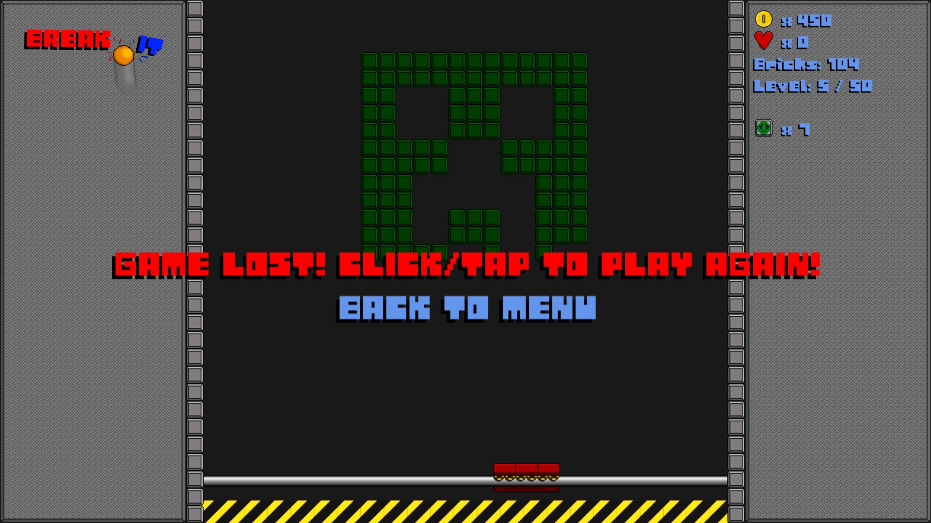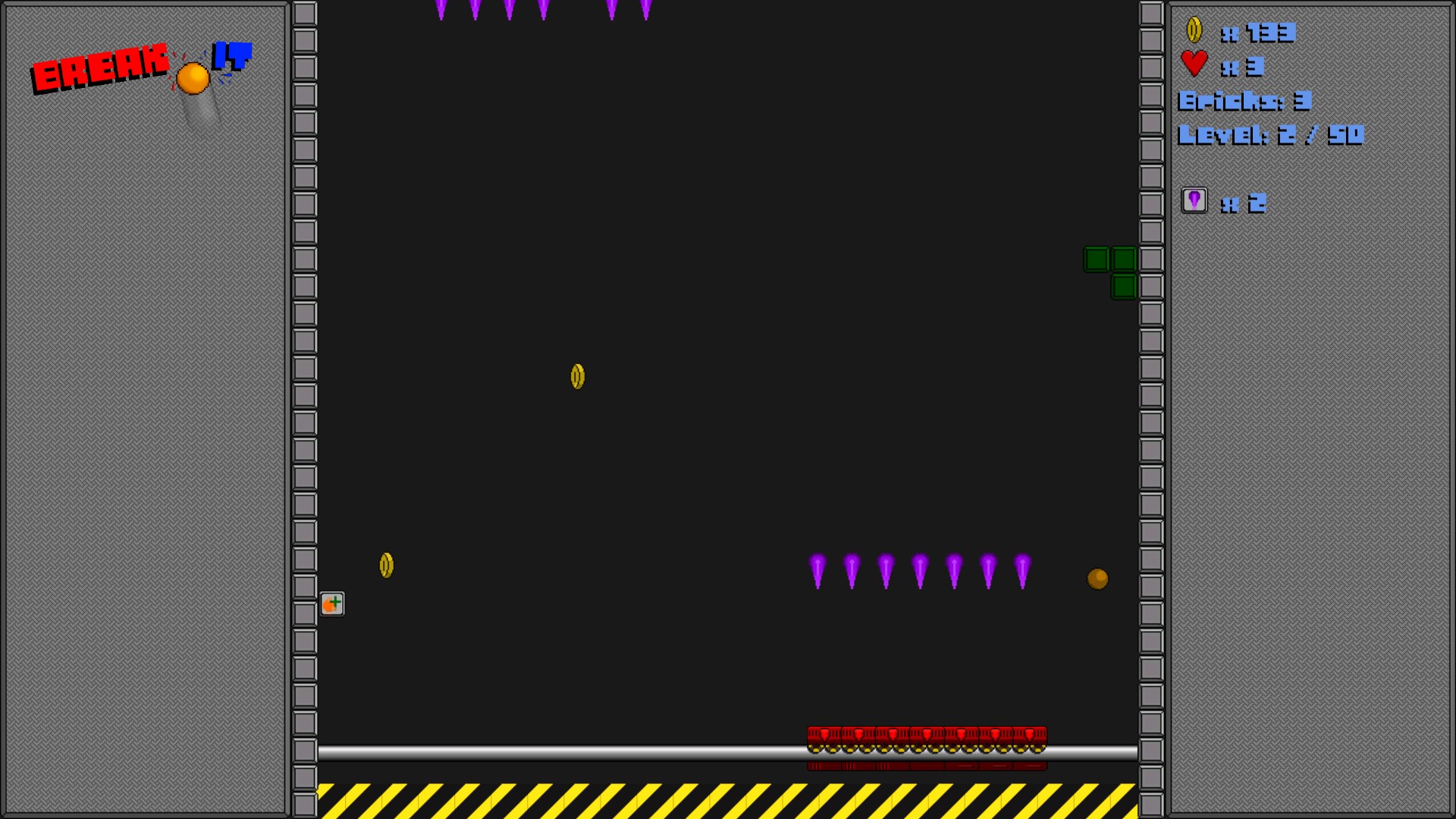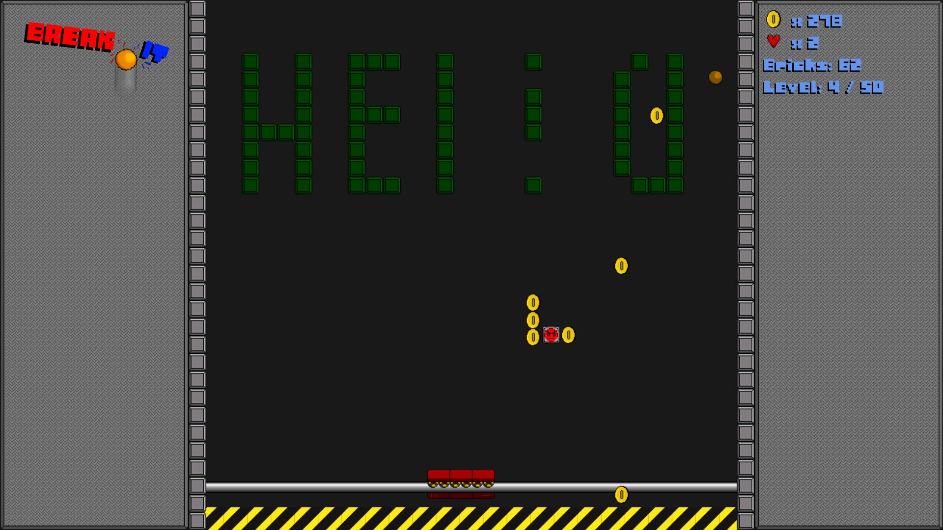 In this game you have to break ALL the bricks on the screen with a powerful ball. You can do that by taking control of a paddle which helps you direct a ball into a certain direction. But beware: Don't let the ball fall into the abyss or you will lose a precious heart! Bricks may also give you coins to boost your score and some power ups to help you destroy more resilient bricks. But remember: Not all power ups are good for you!