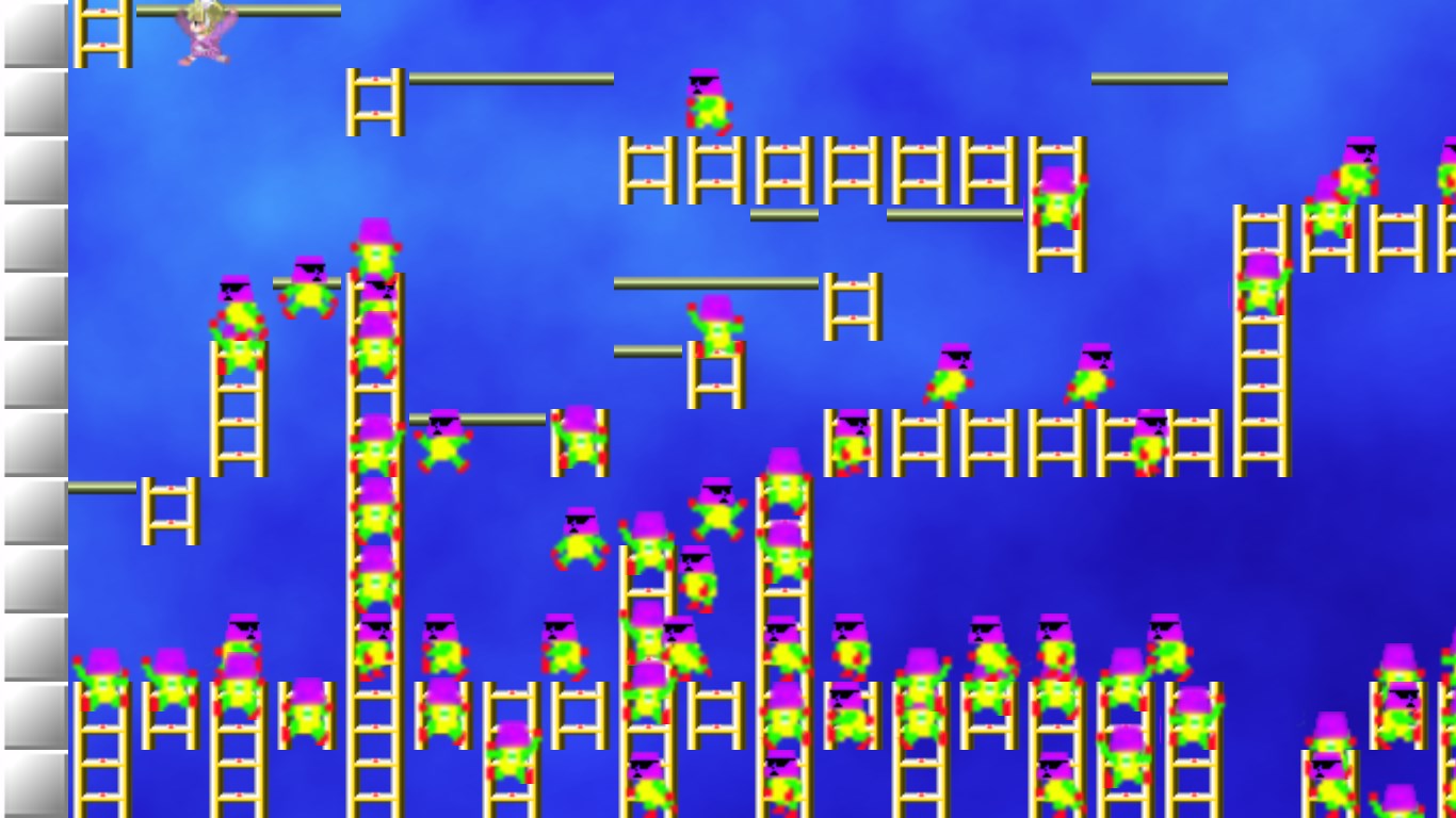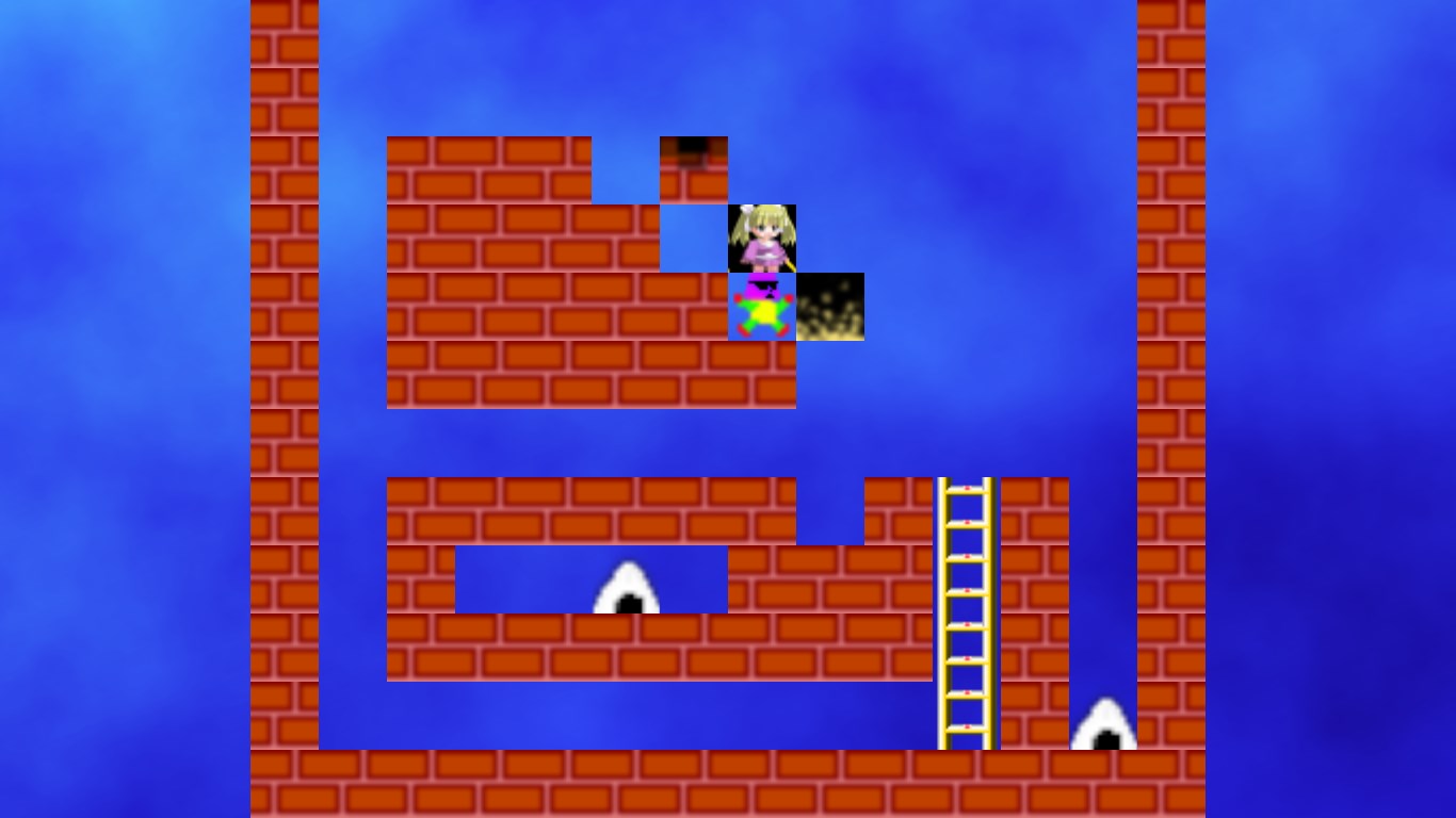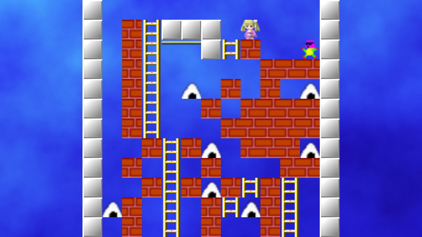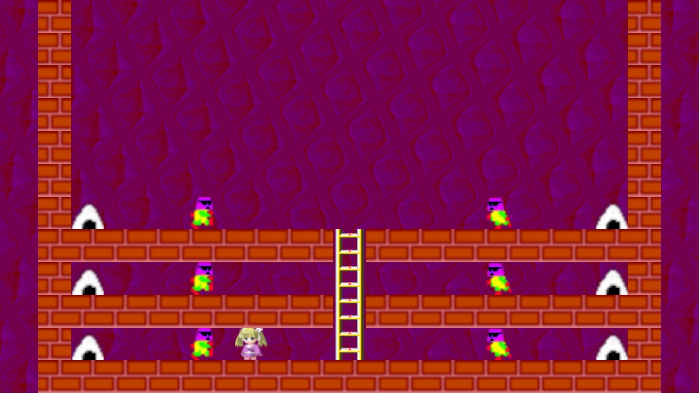 ロードランナー風アクションパズルゲーム。女の子を操作してステージにあるおにぎりを全て取り、ハシゴを登って脱出するゲームです。レンガを掘ったり棒にぶら下がったりと、クラシックなルールそのままに、時にシビアなアクションもあり、熟考を要するパズル要素もあります。ステージは100あり、3歳~初心者が楽しめるものから、腕に覚えアリの強者向けのステージまであります。