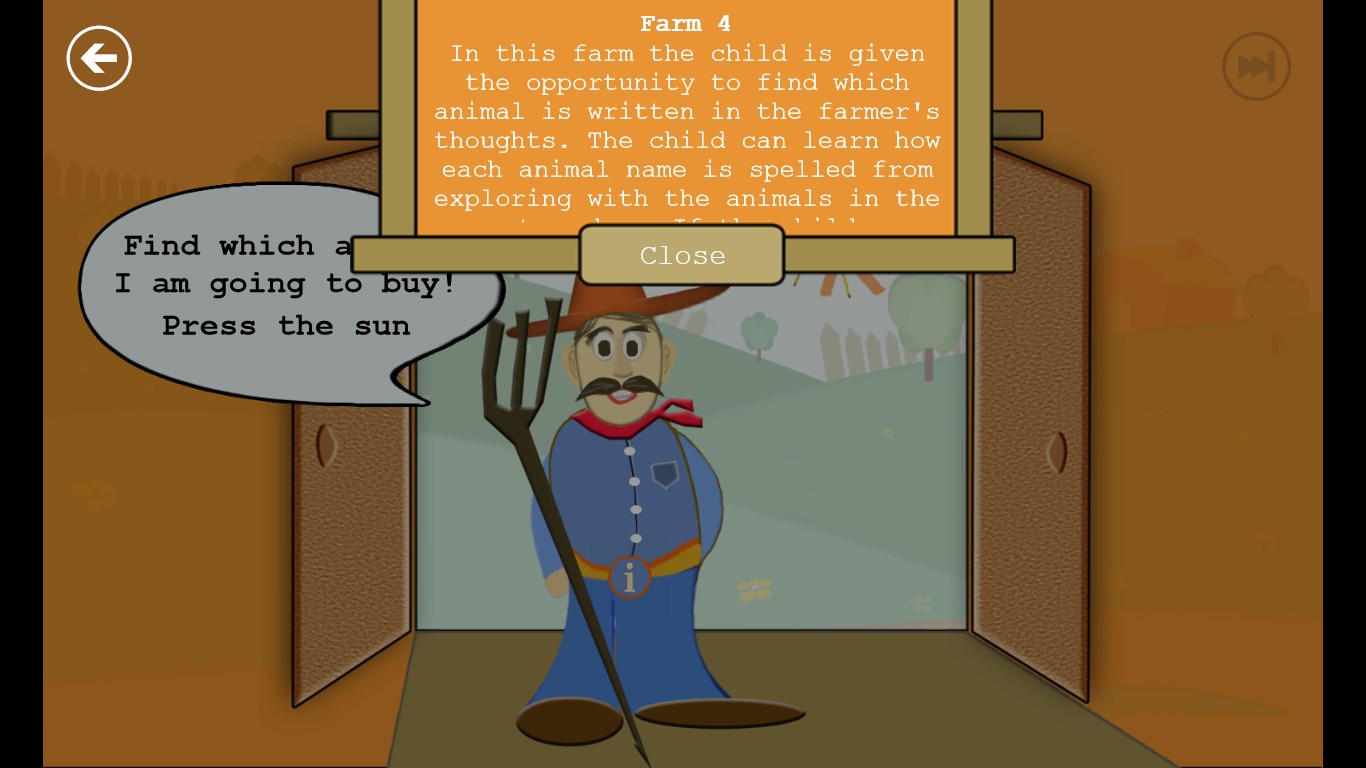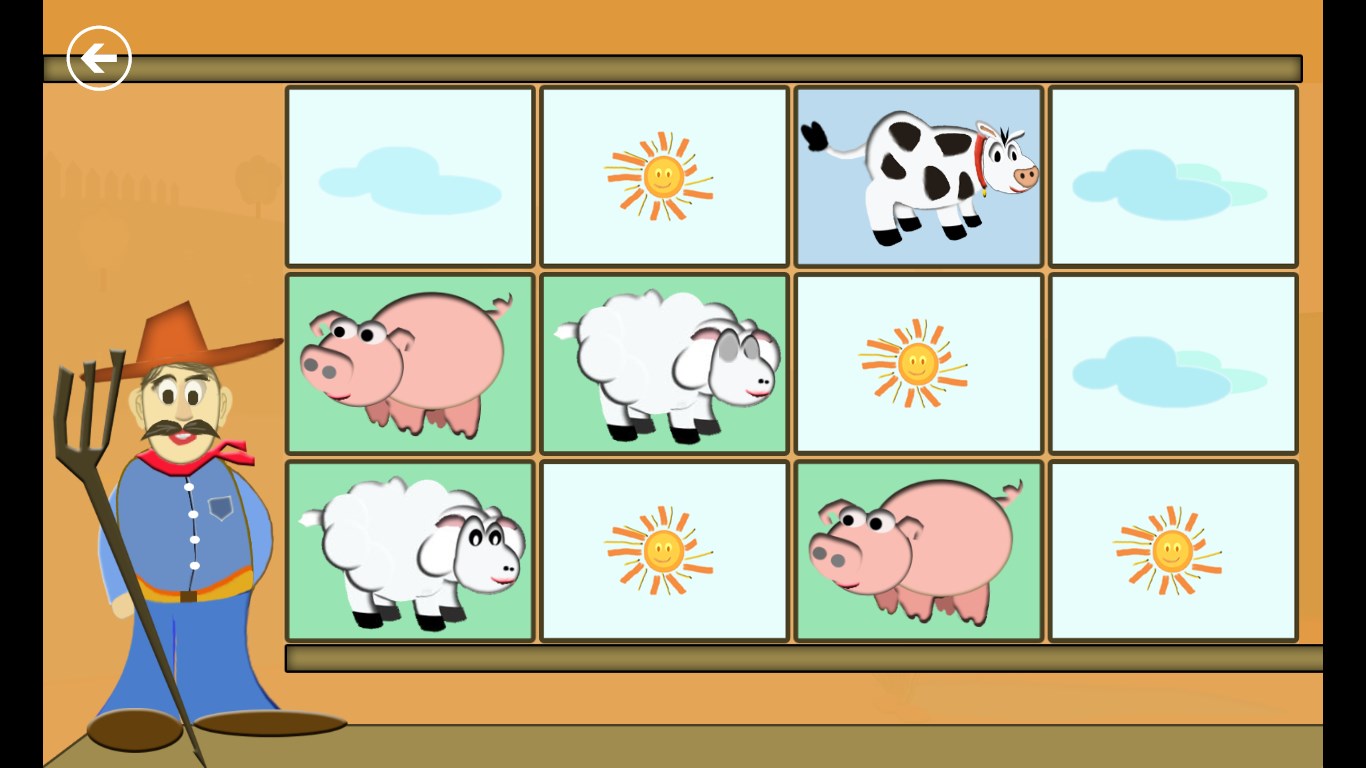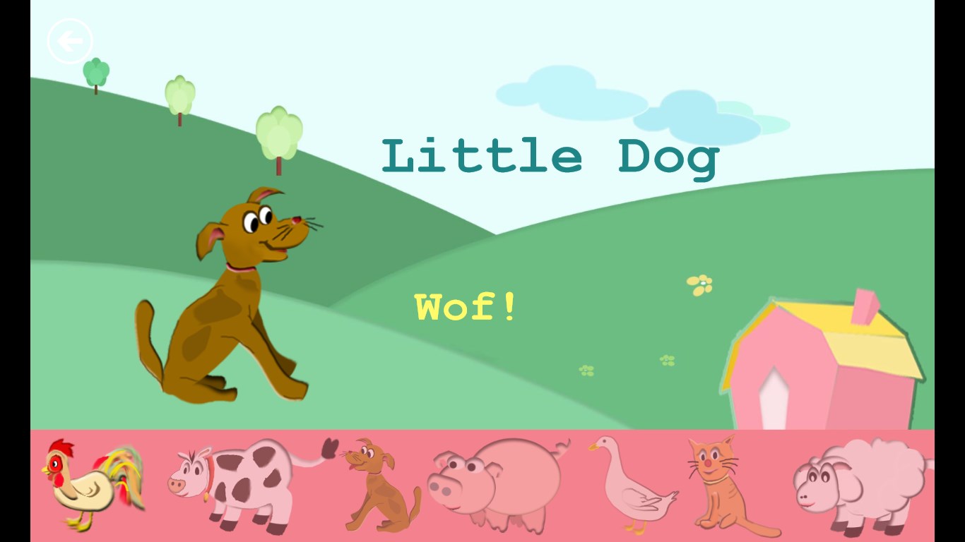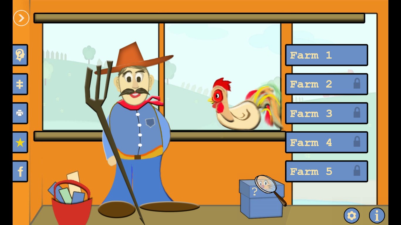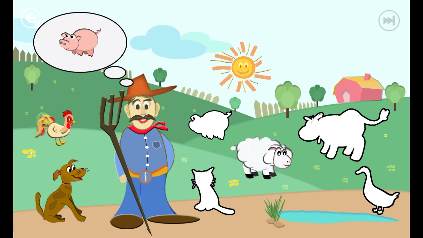 ● Discover 5 different farms and let the child find out which animal the farmer wants to buy through outlines, sounds and words of animals.