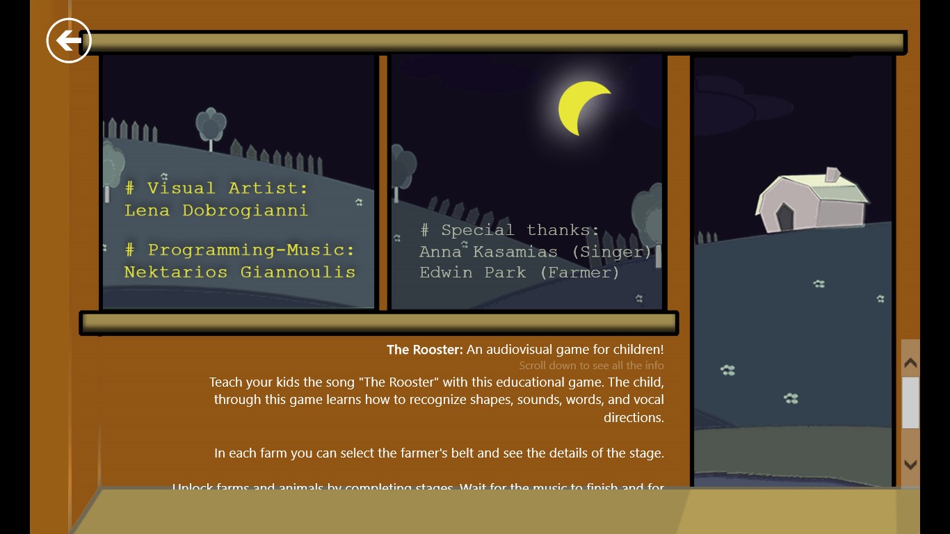 A unique audio-visual game for children with lovely sounds and unique design! Play the game and listen to the adorable song "The Rooster" (like old macdonald song) selecting each time a different animal.