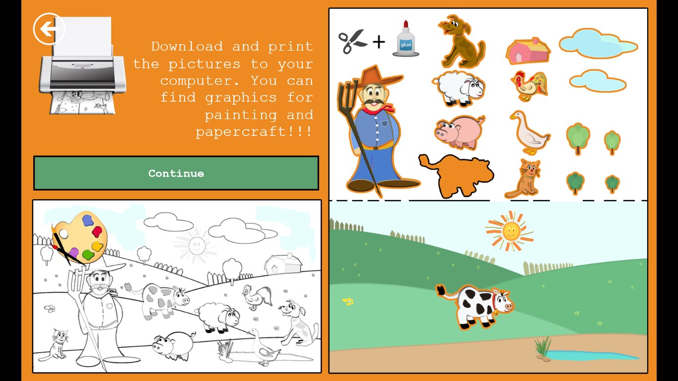 Lovely animal sounds and music!Farmer speeches and explanation texts!Puzzle and Maching Pairs games!Paint and papercraft!