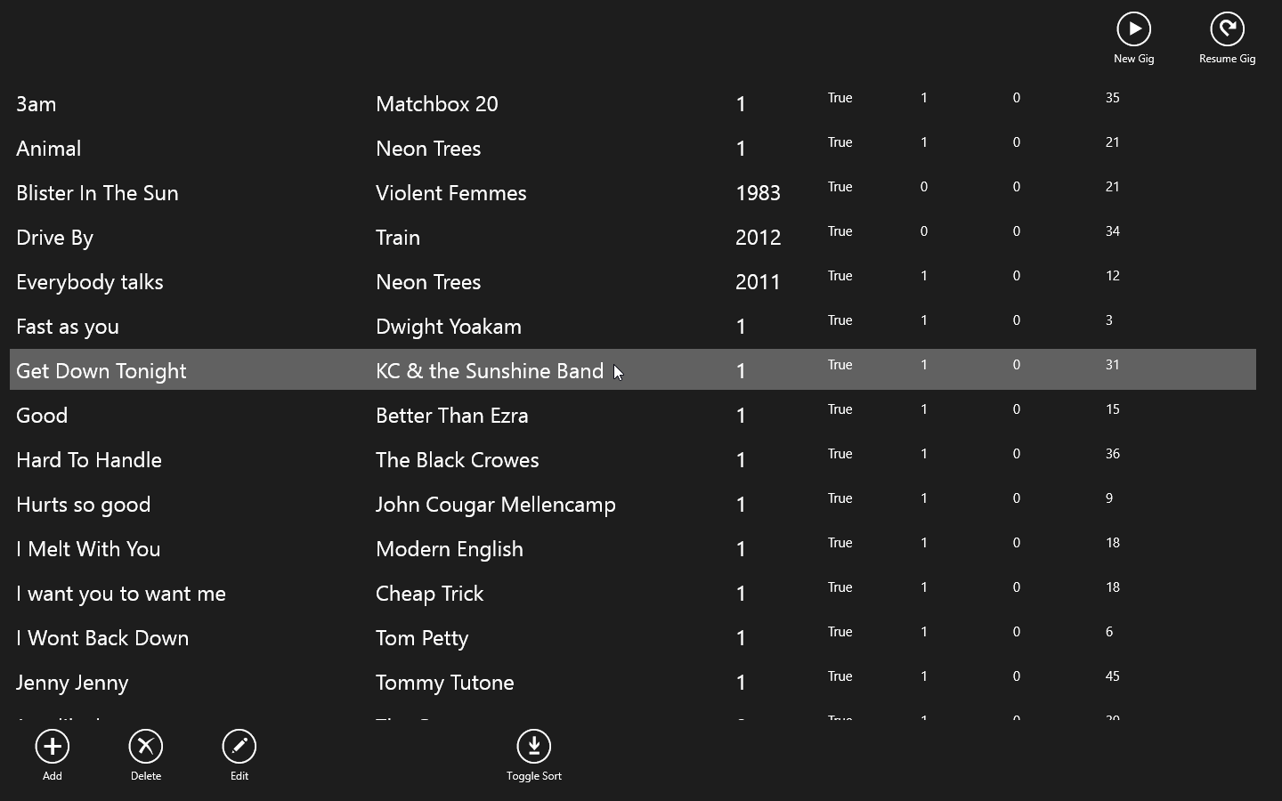 The list of songs can be sorted alphabetically, by year, or by "number of times played". Once a song has been played, tap "complete" and the song will be removed from the list for the rest of the gig. When starting a new gig, all songs are loaded back into the list.