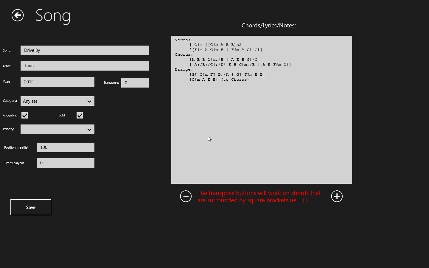 One other very handy feature is that it can easily transpose the chords of a song on the fly...just tap the + or - buttons to go up or down. (chords must be surrounded by square braces).