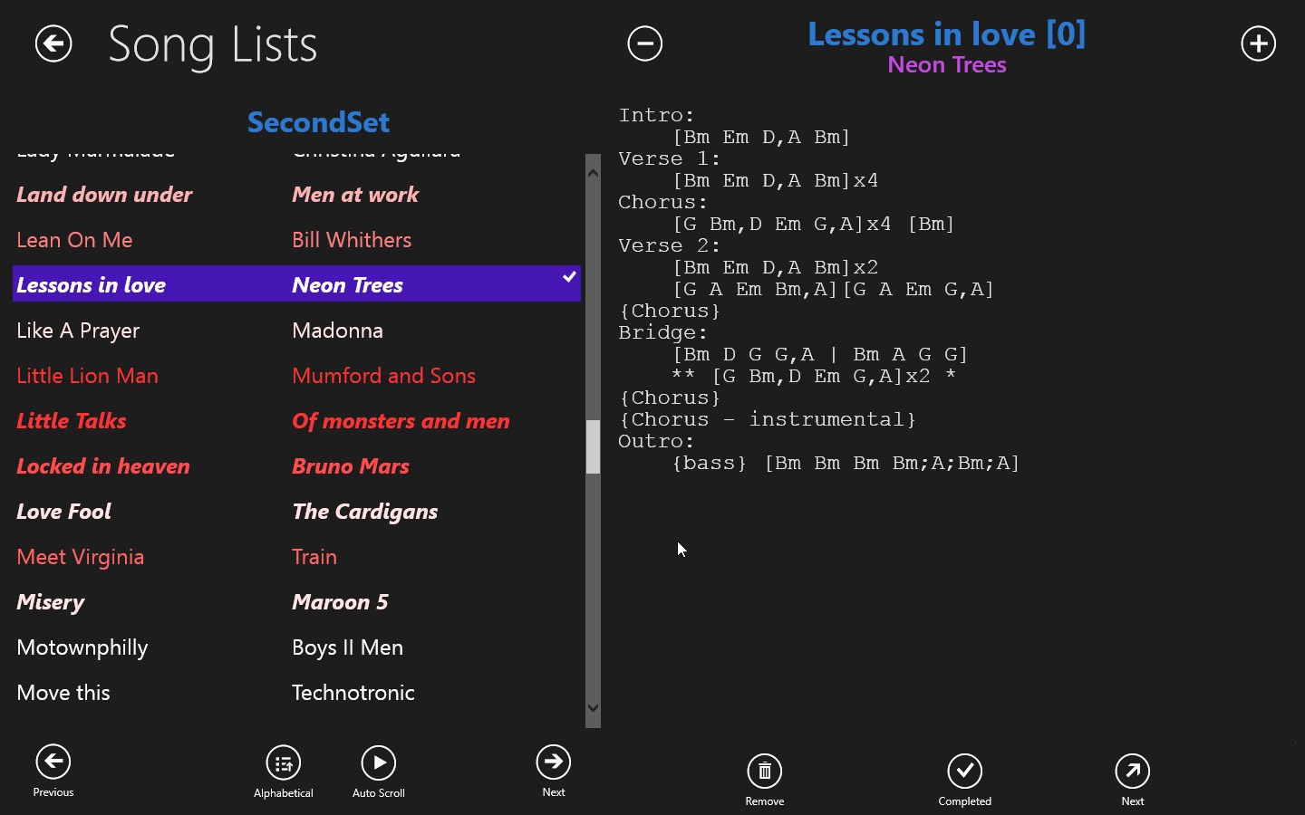 At a high level, the purpose of this app is to be used as a "cheat sheet" during a music gig. It can be used to replace many paper sheets that can hard to sift through during a performance and get blown around or fall off the stand.