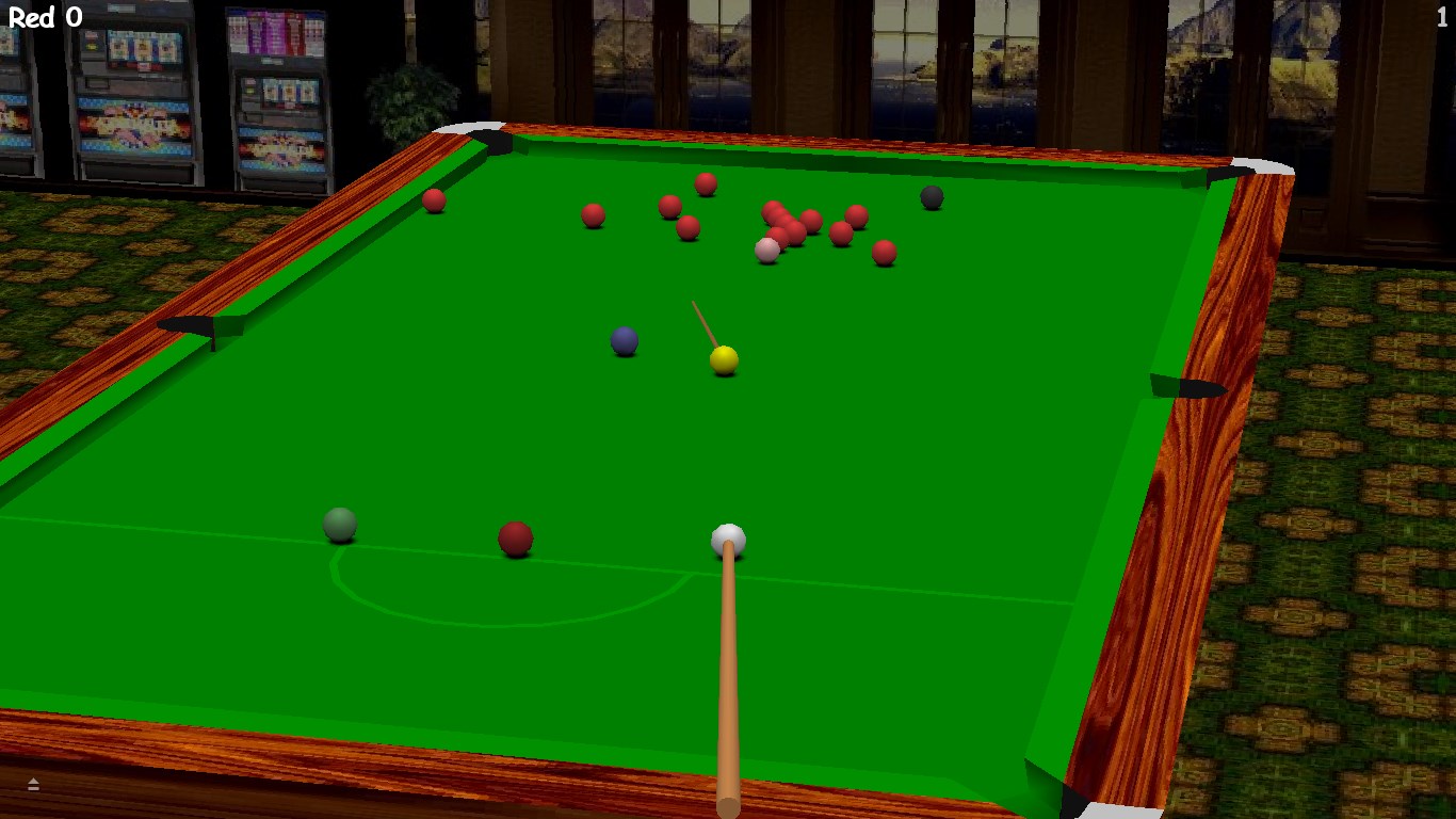 During practice games or when playing the lowest rated opponent an aiming assist pointer appears showing the direction the target ball will move when hit by the cueball.
