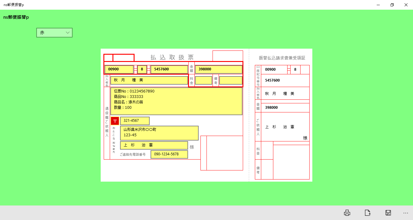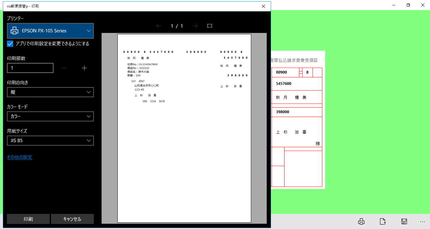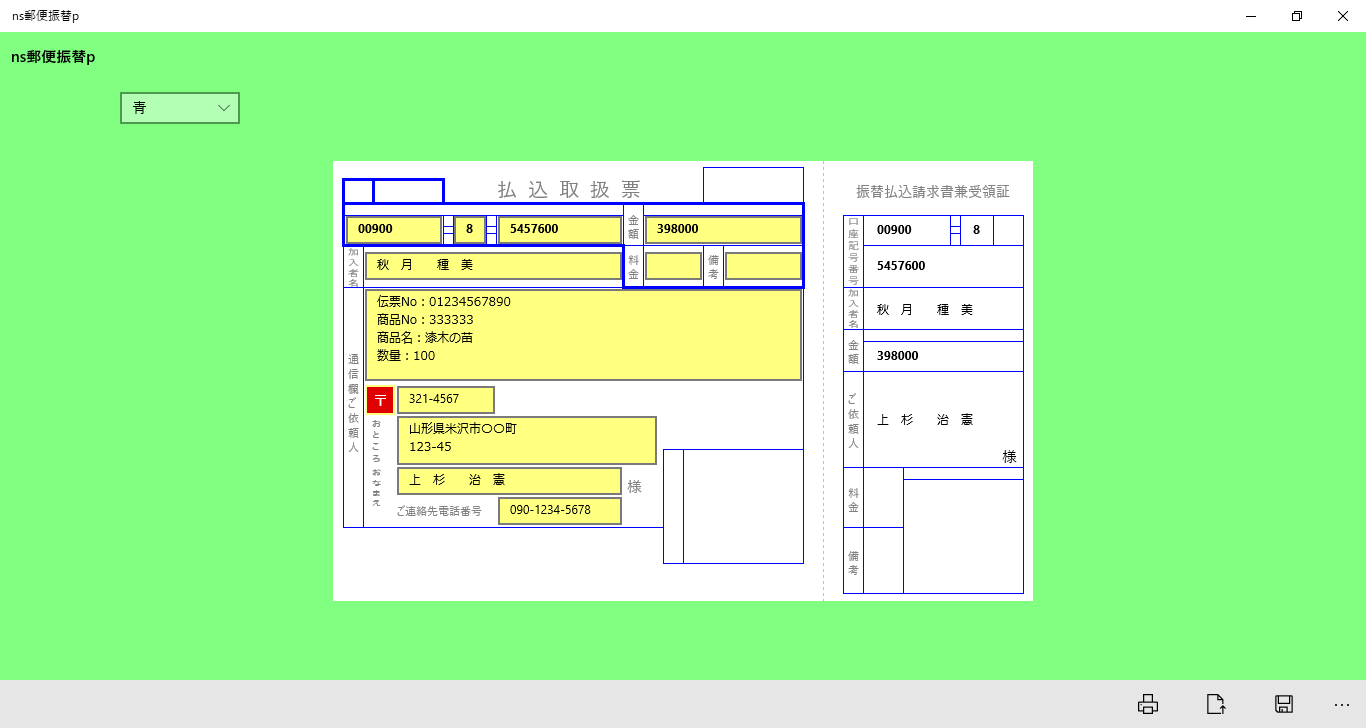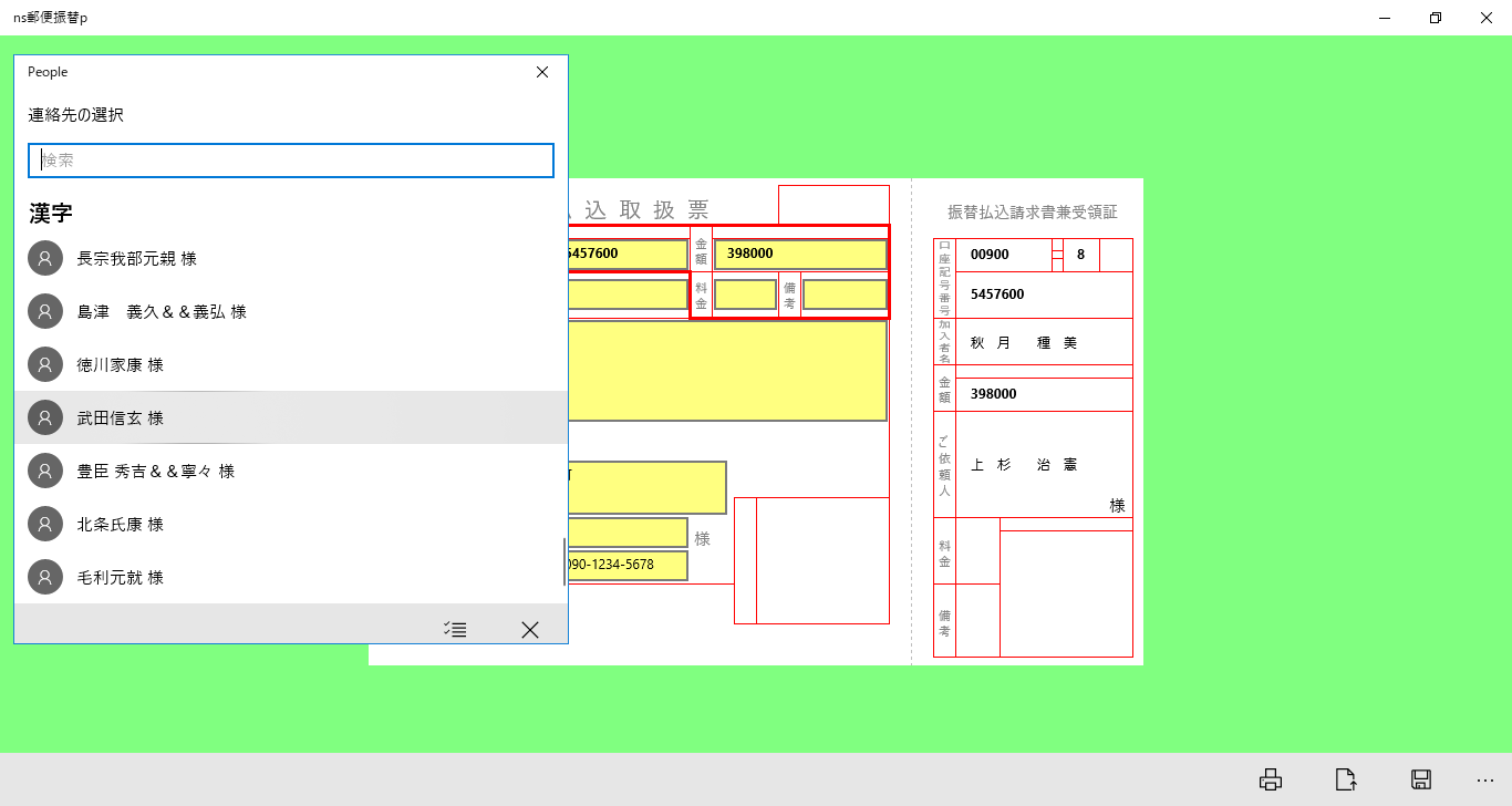 郵便振替用紙(払込取扱票・受領証)へ簡単に入力・印刷できるアプリです