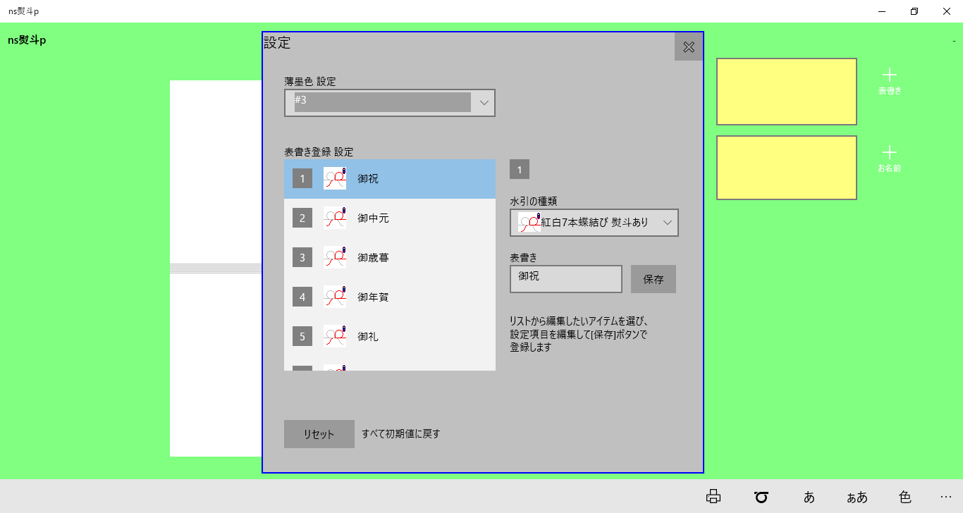 表書き登録(40種)はお名前パッド(クリックまたはタッチで約6000種の苗字から簡単絞り込み)水引も印刷する薄墨色設定設定リセット