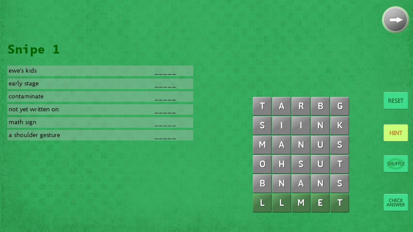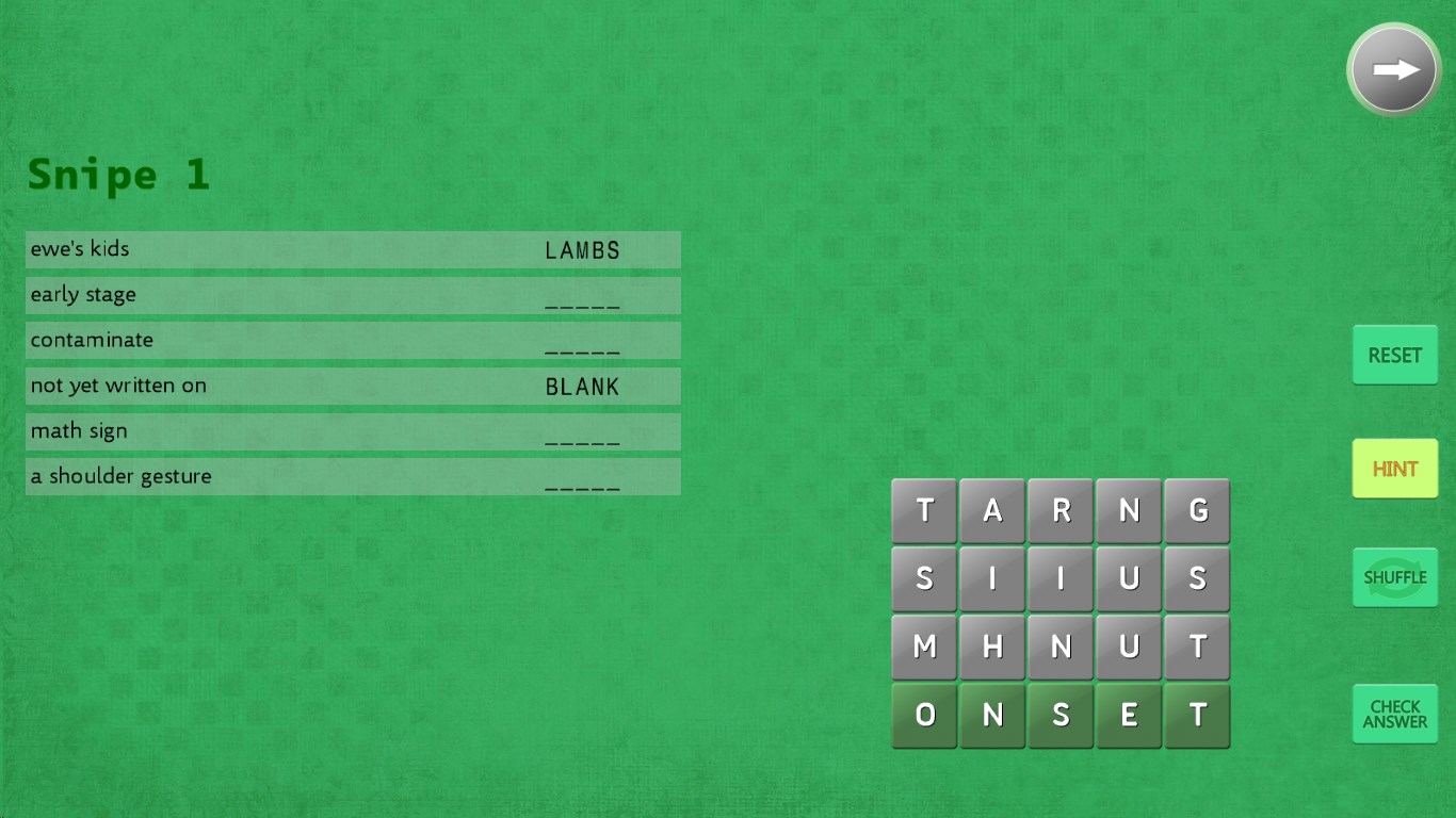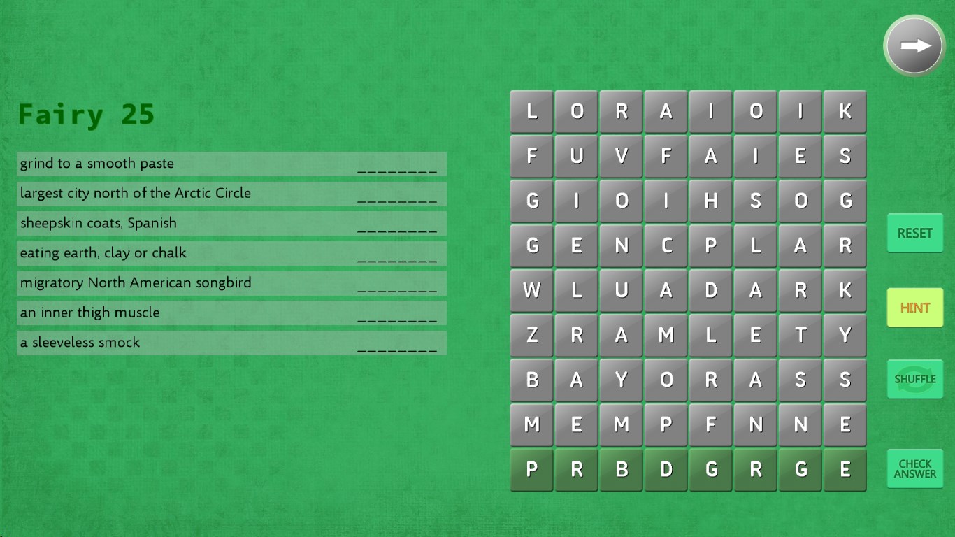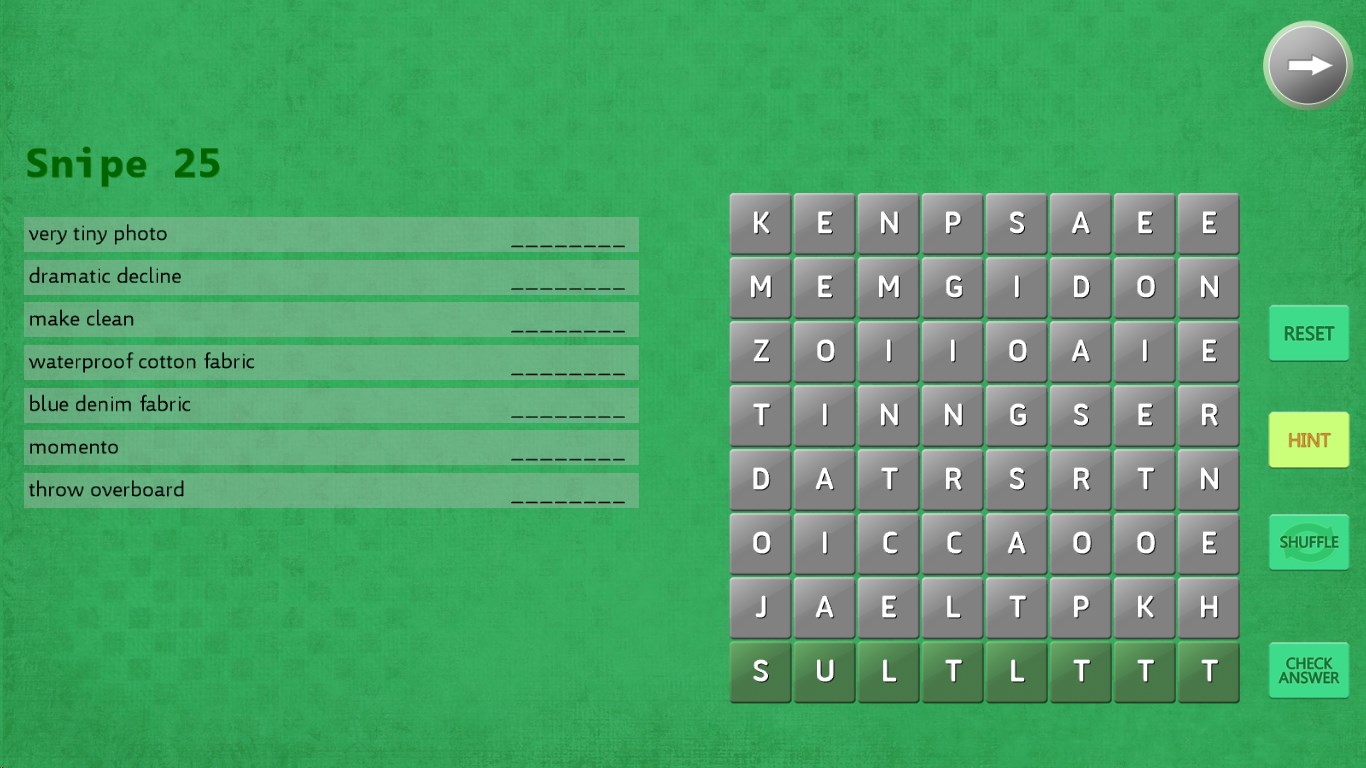 To solve a clue, move the letters that make up that word to the bottom of the screen where they turn green. Then check your answer.