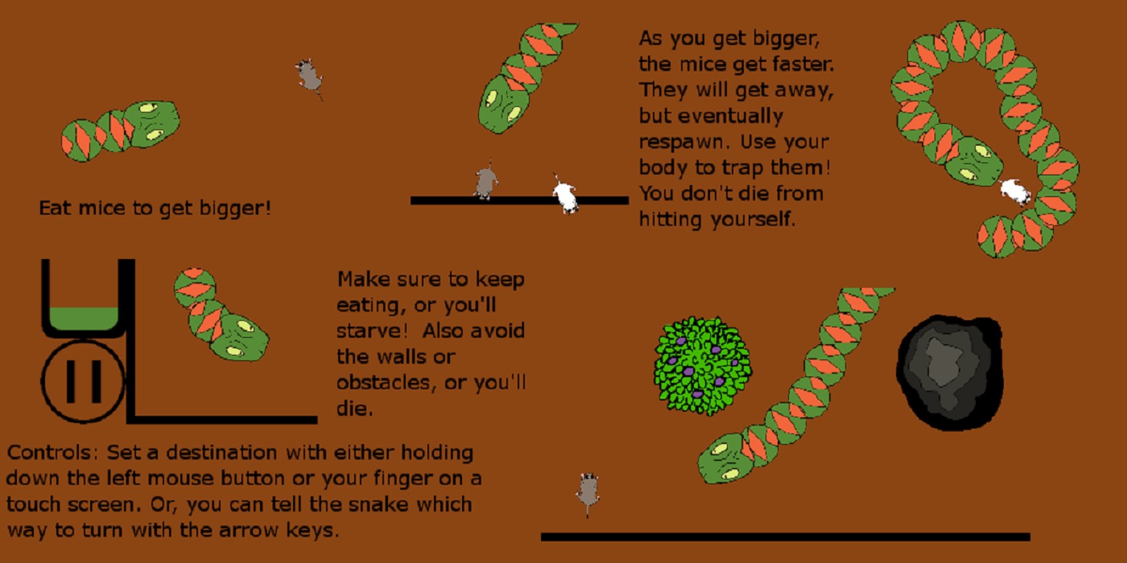 Moving Food!Ability to wrap around yourself to trap the miceSaves your High Scores to all devicesThree levels of difficultySupport for mouse, keyboard, and touch input