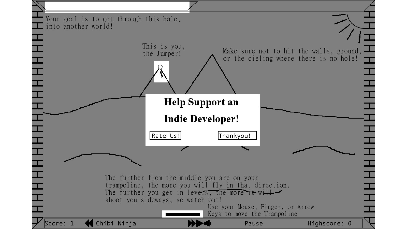 Spend endless hours helping this poor stickman reach his destiny! In an odd take of the Breakout game, use the trampoline to propel the stickman through the holes in the ceiling. As the game progresses, accuracy decreases, so be careful!