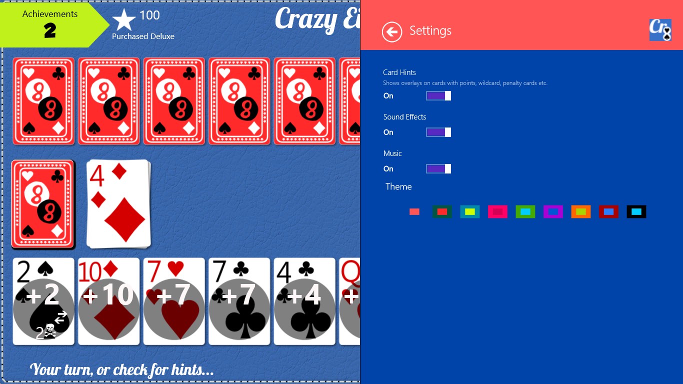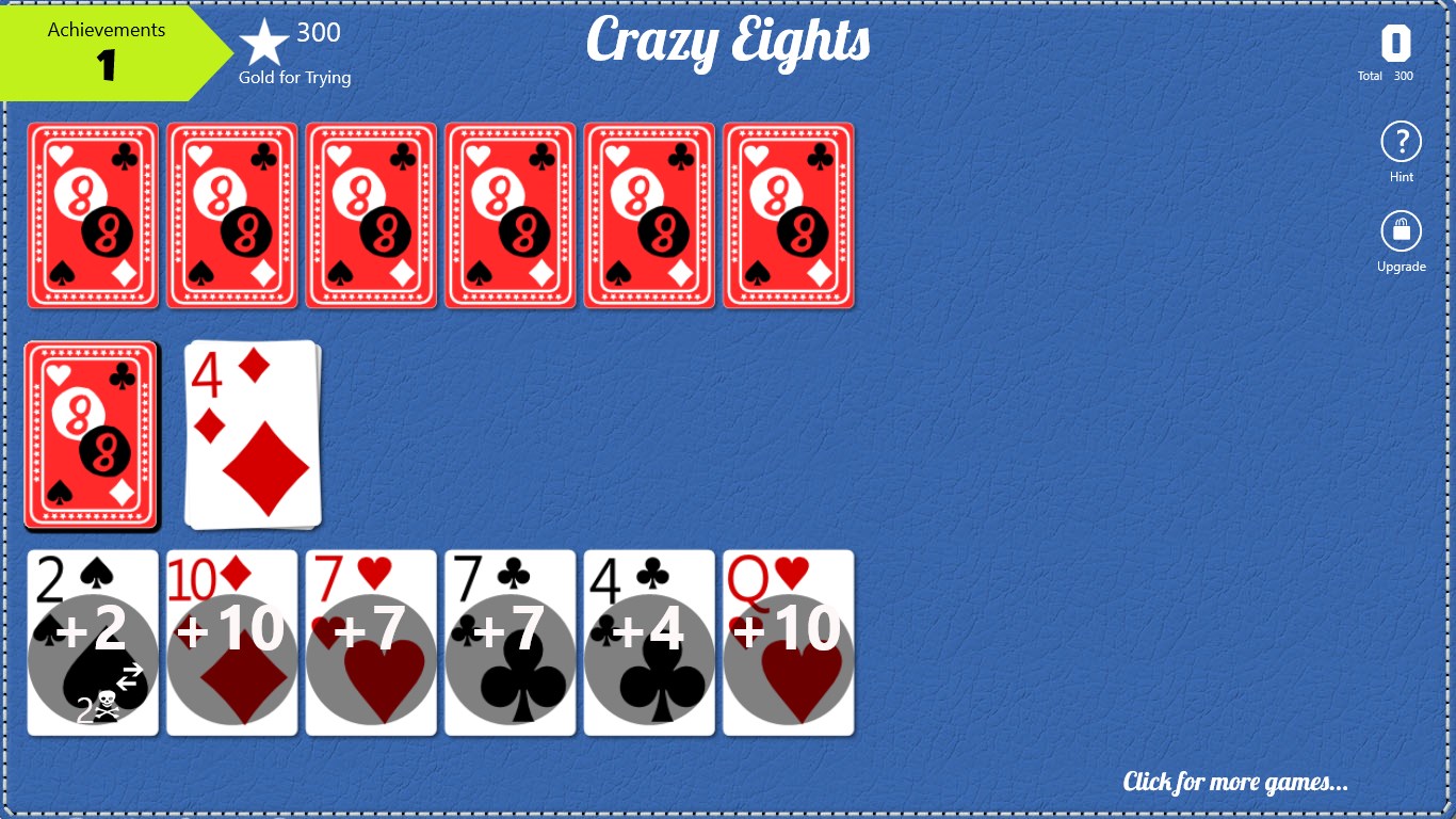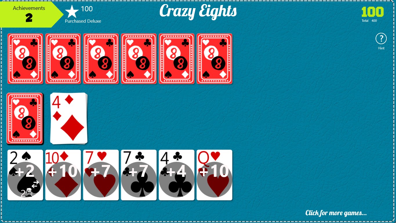 Play America's favorite card game: Crazy Eights. Very easy to learn: the game has a tutorial, suggestions and hints. Extremely addictive! Play and earn your gold: the game includes pretty pins and achievements. Beautiful graphics and animation, sleek interface is designed to make you enjoy every move of the game!