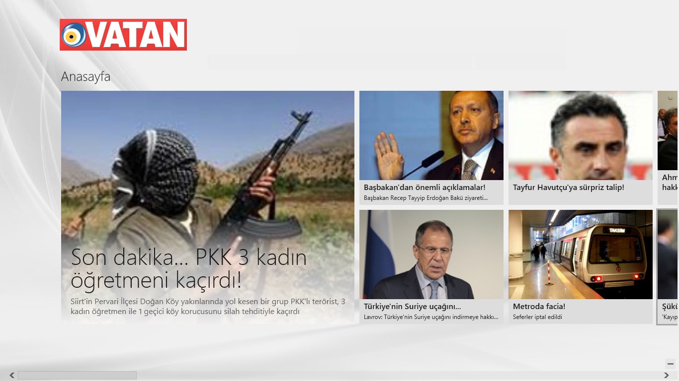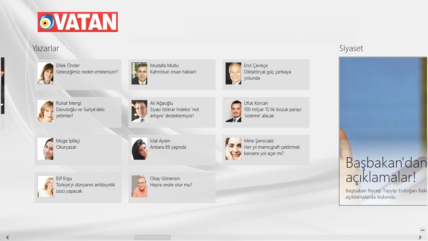 Üstelik, Vatan’ın deneyimli yazar kadrosu, geniş haberleri ve eğlence bölümleri Vatan Windows 8 uygulaması ile ücretsiz olarak sizinle. Uygulama ile güncel haberleri okuyarak gündemi takip edebilirsiniz.