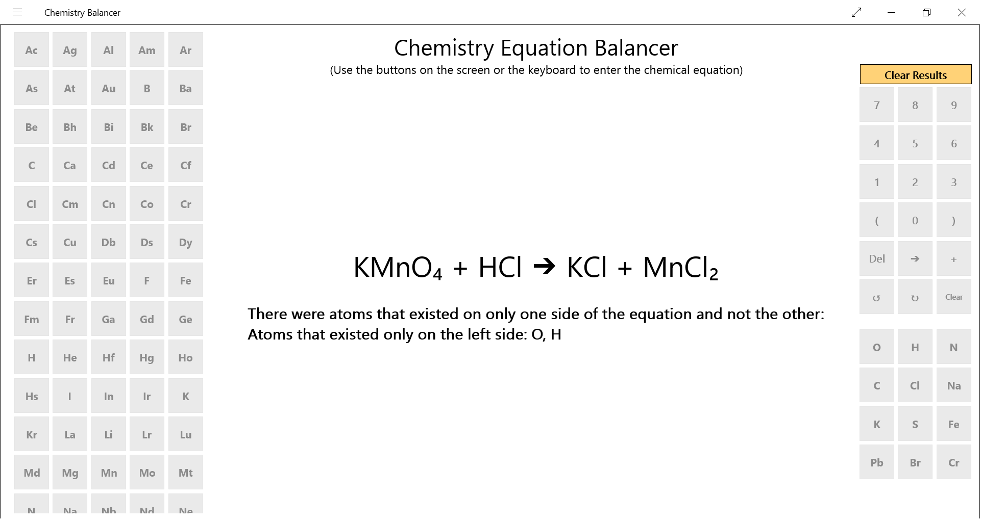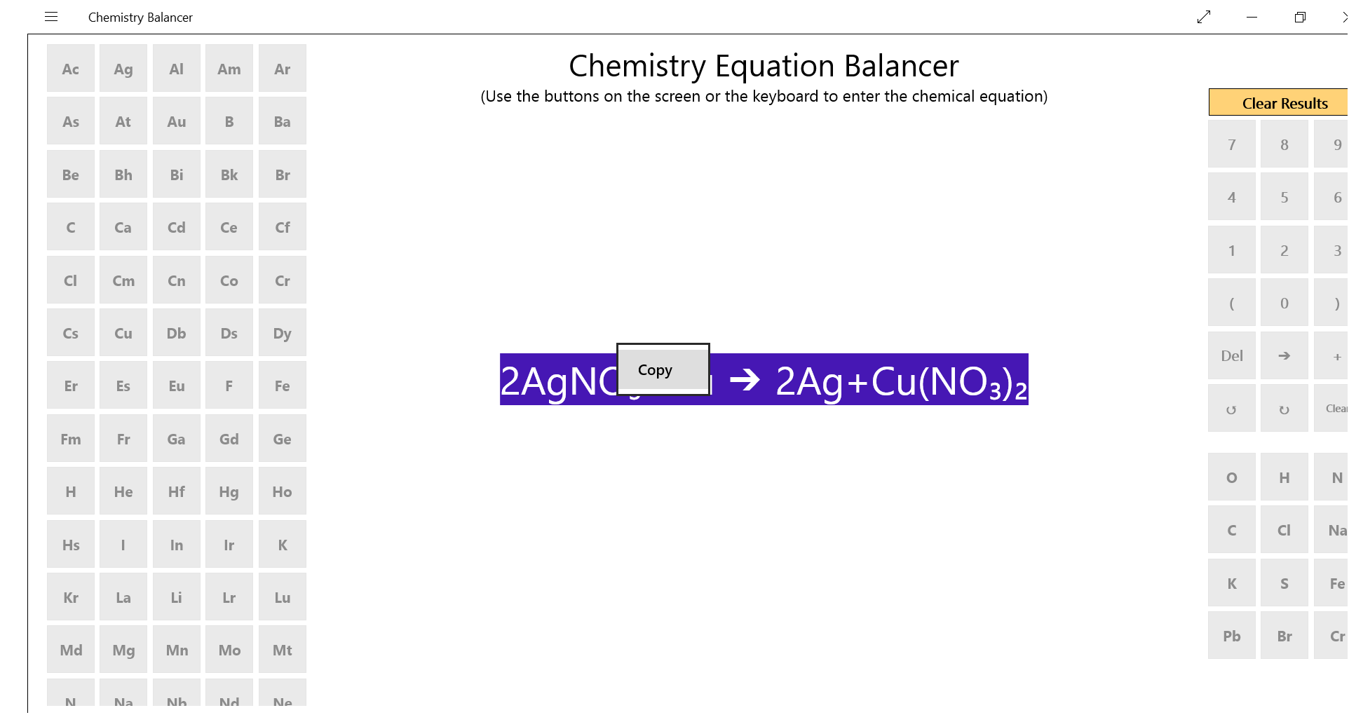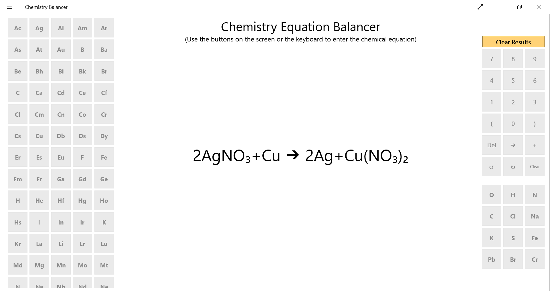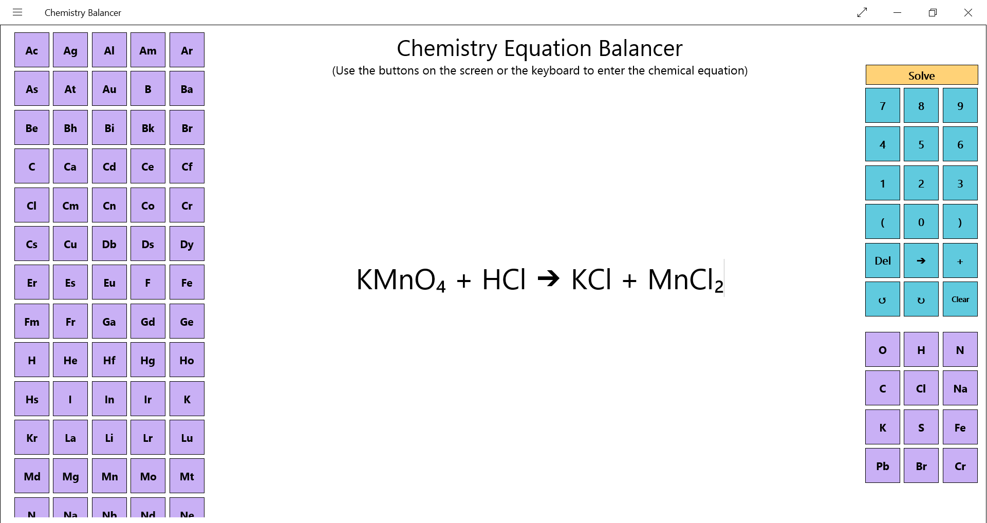 Balances chemical equations. The app is fully interactive with the keyboard (arrow keys move the cursor, enter creates/removes the solution, equals creates the arrow, etc). The final solution can be copied. Errors with the inputted chemical equations are displayed to the user in as helpful a way as possible.