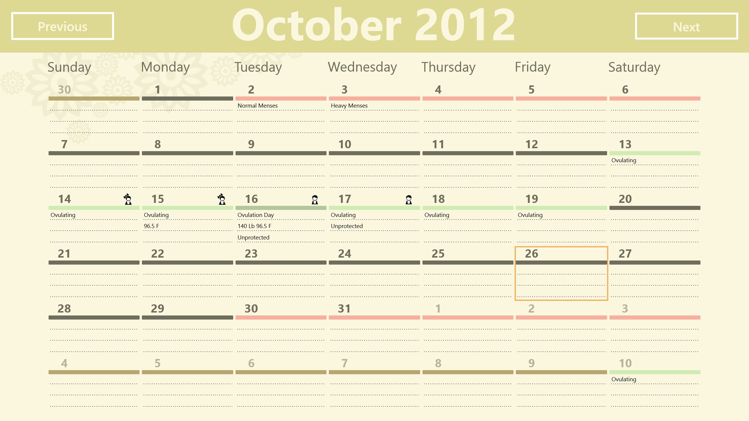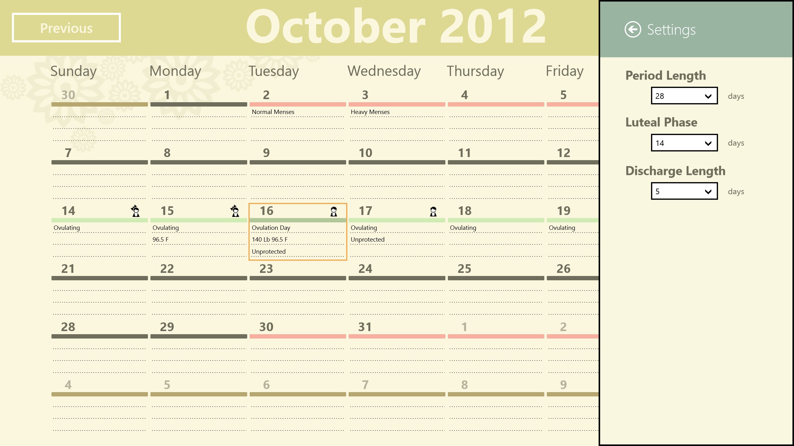 The Ovulation Calendar helps you determine your fertile days of the month, so you can either achieve or avoid pregnancy. The calendar is based on the date of your last period, the average Period Length and the Luteal Phase. With this information a chart is generated for each month, including details such as the next period date, the best days to conceive a boy or a girl, your ovulation day and when you should abstain to avoid a pregnancy.