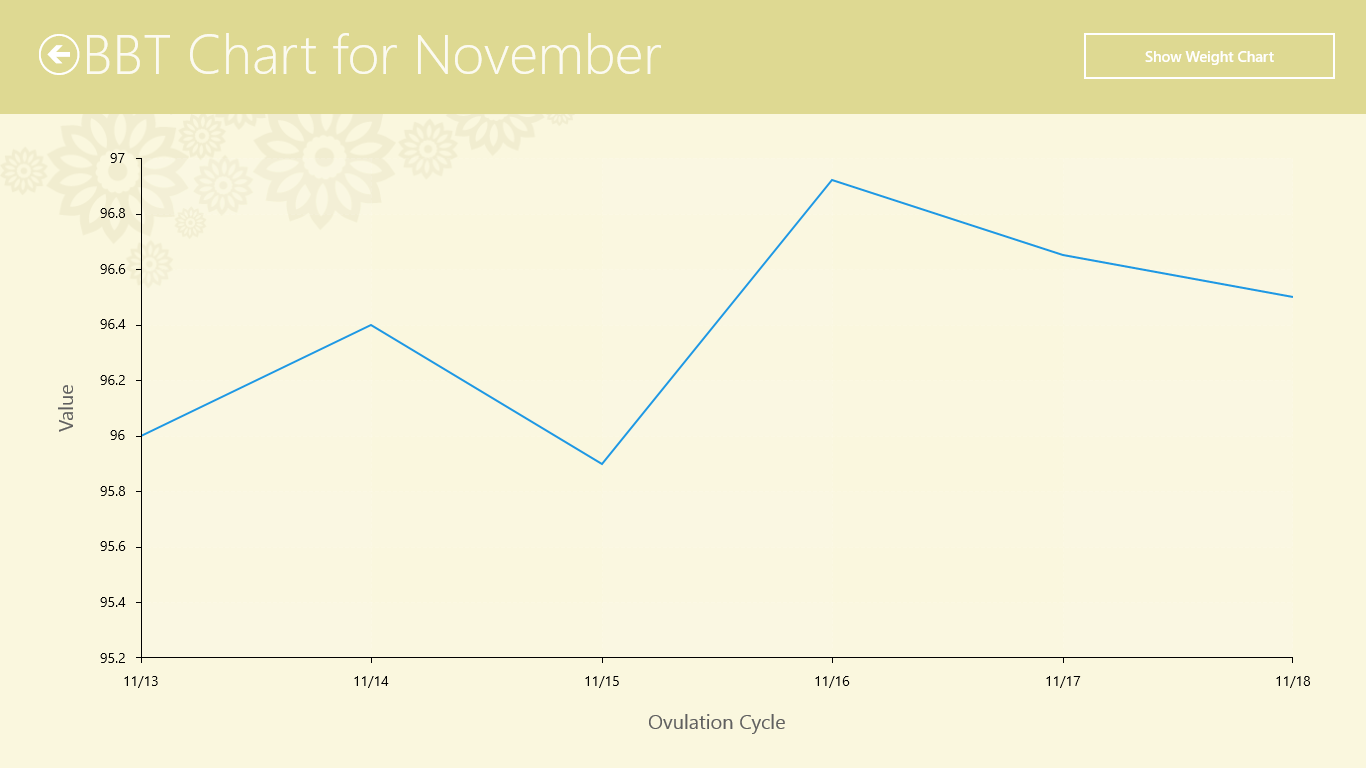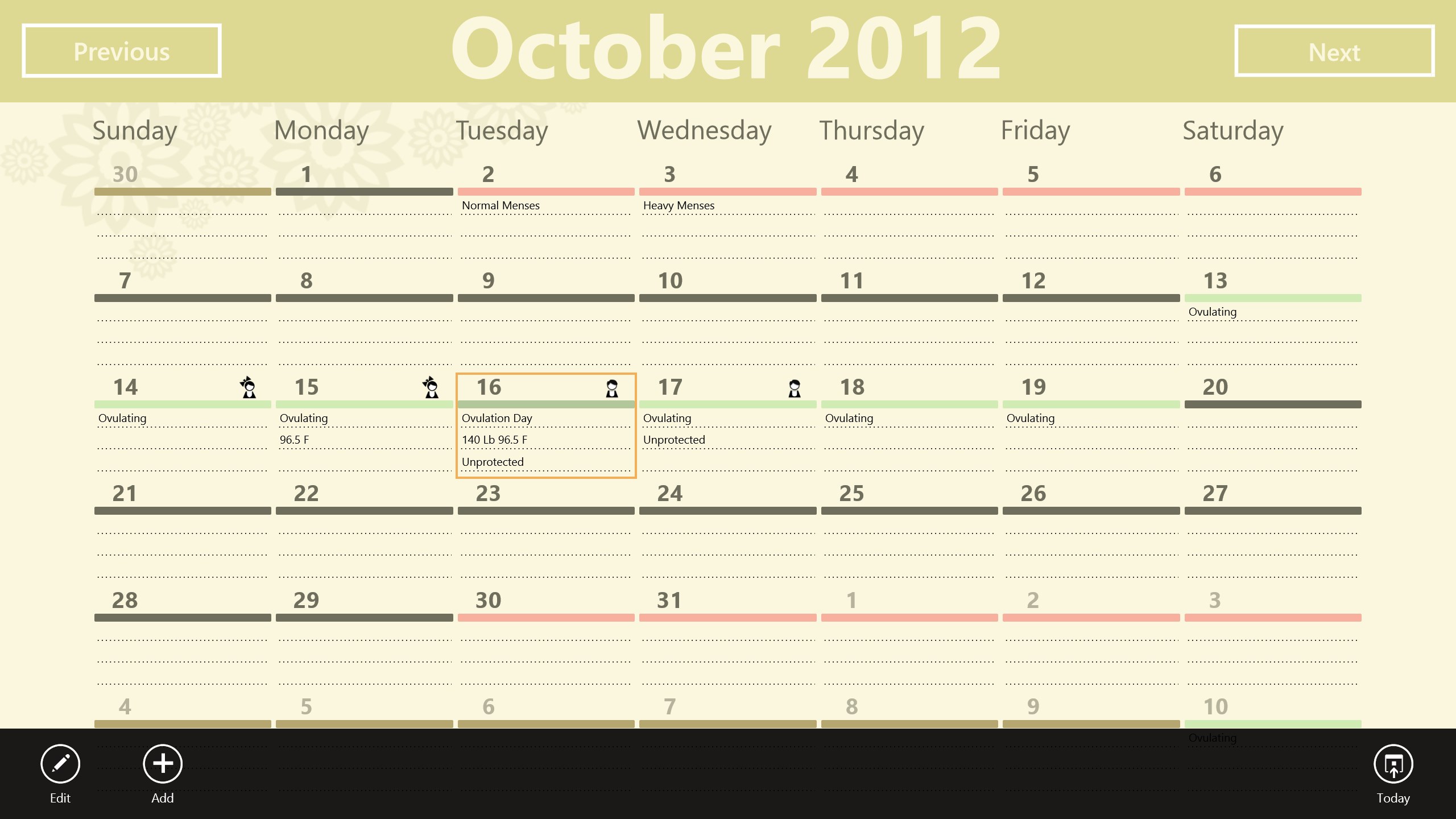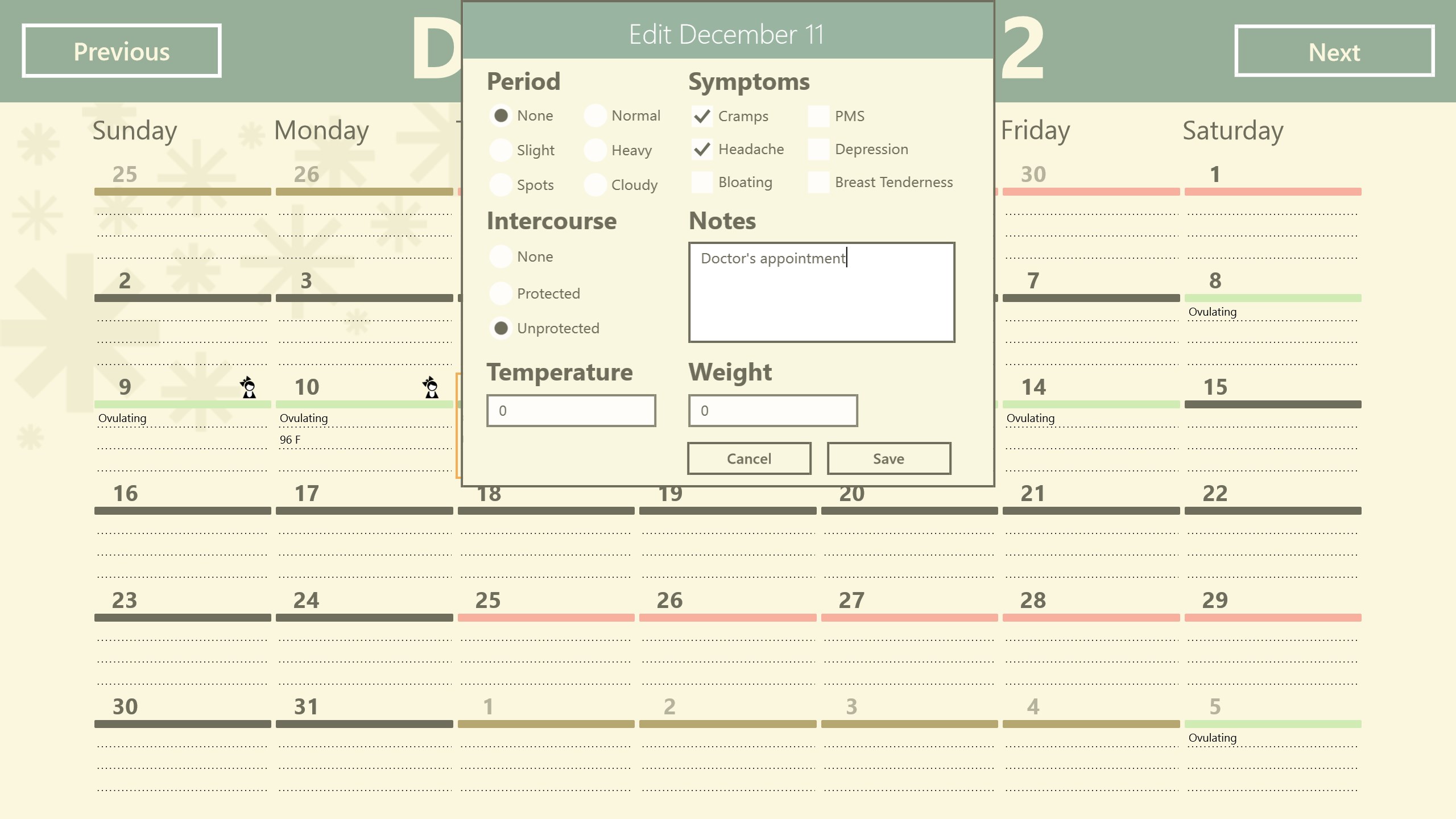 Saves up to 5 different menses types.Predicts fertile and low fertile days of the month.Predicts future ovulation and periods.Saves Basal Body Temperature measurements.Saves symptoms related to the menstrual period.Able to add special notes to every day.Highly customizable.
