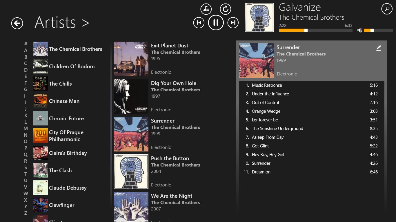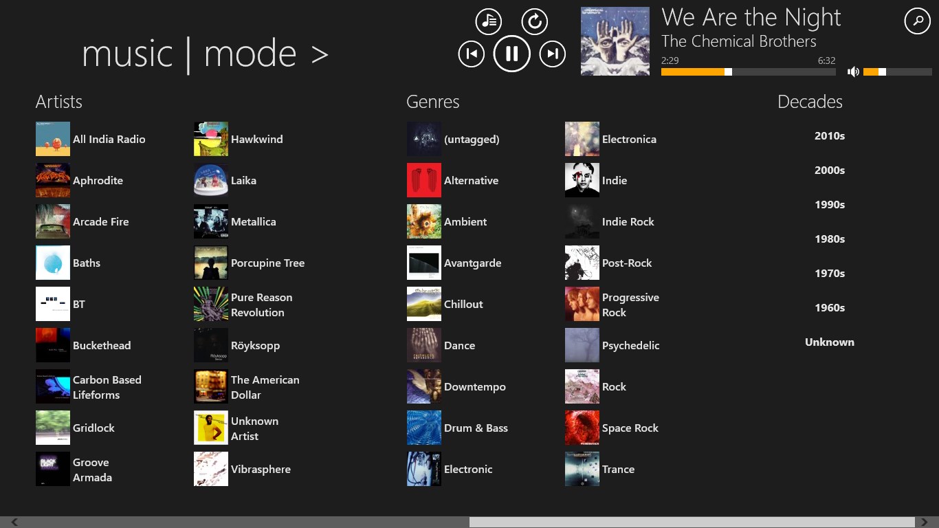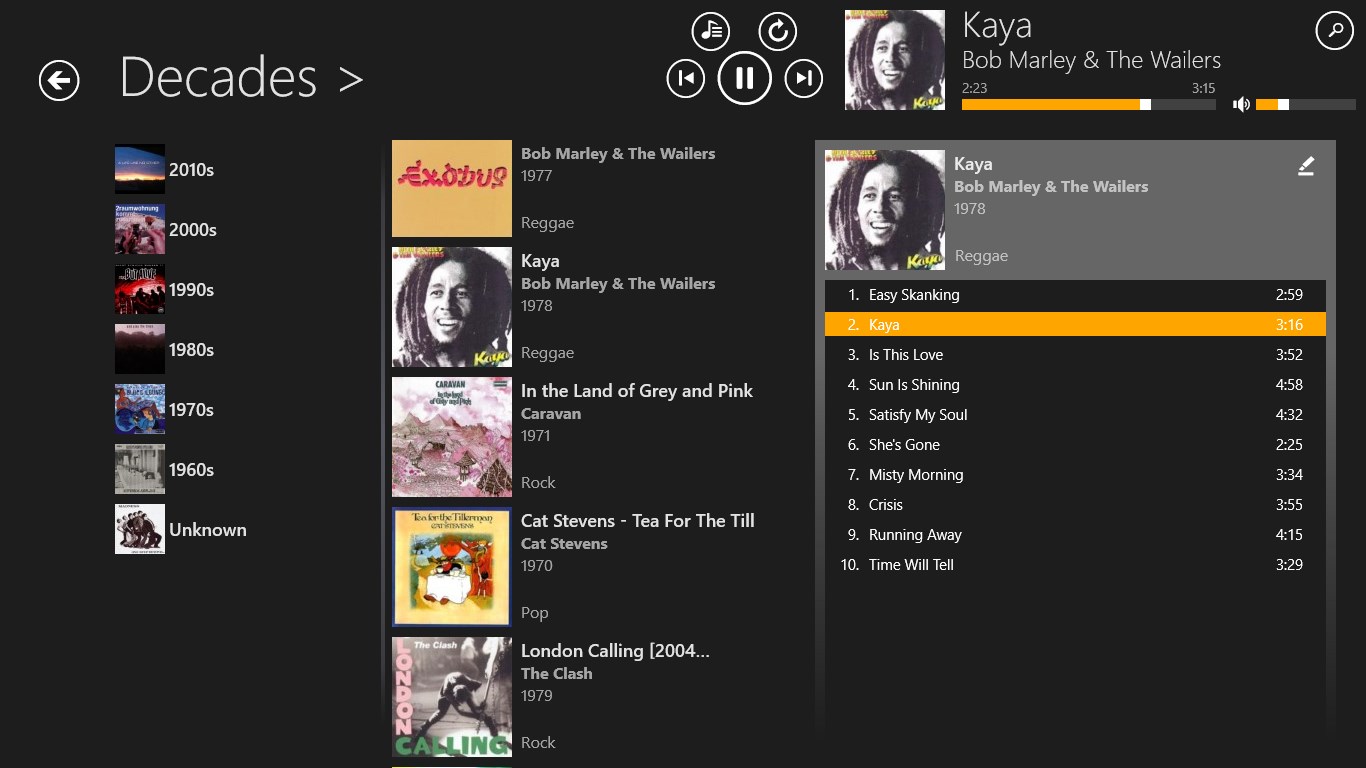 Fast and intuitive navigation through your local music collectionWorks very well even with very large music collectionsSleek user interface with smooth animations - freely scalable to any size!Different "auto pilot" modes will keep your music runningCrossfade support for smooth song transitions (PC only)Uses online databases to retrieve missing music metadataBuild and edit playlists using drag+drop (PC only)Manage and cleanup your music library using drag+drop (PC only)Play FLAC, ALAC (Apple lossless), Ogg Vorbis, Opus and APE audio files (free for one month, then requires \'Pro Version\', Ogg Vorbis, Opus and APE are not available on Windows 8.0)Fully functional even when snapped to the screen side (PC only)Stream music to a DLNA device with "PlayTo" (free for one month, then requires \'Pro Version\')Connect to your last.fm account for playback statistics (free for one month, then requires \'Pro Version\')Add music from other folders, e.g. from your SD-CardEnqueue files to be played next (limited in free version)Import playlists from m3u, m3u8 and pls files (PC only)