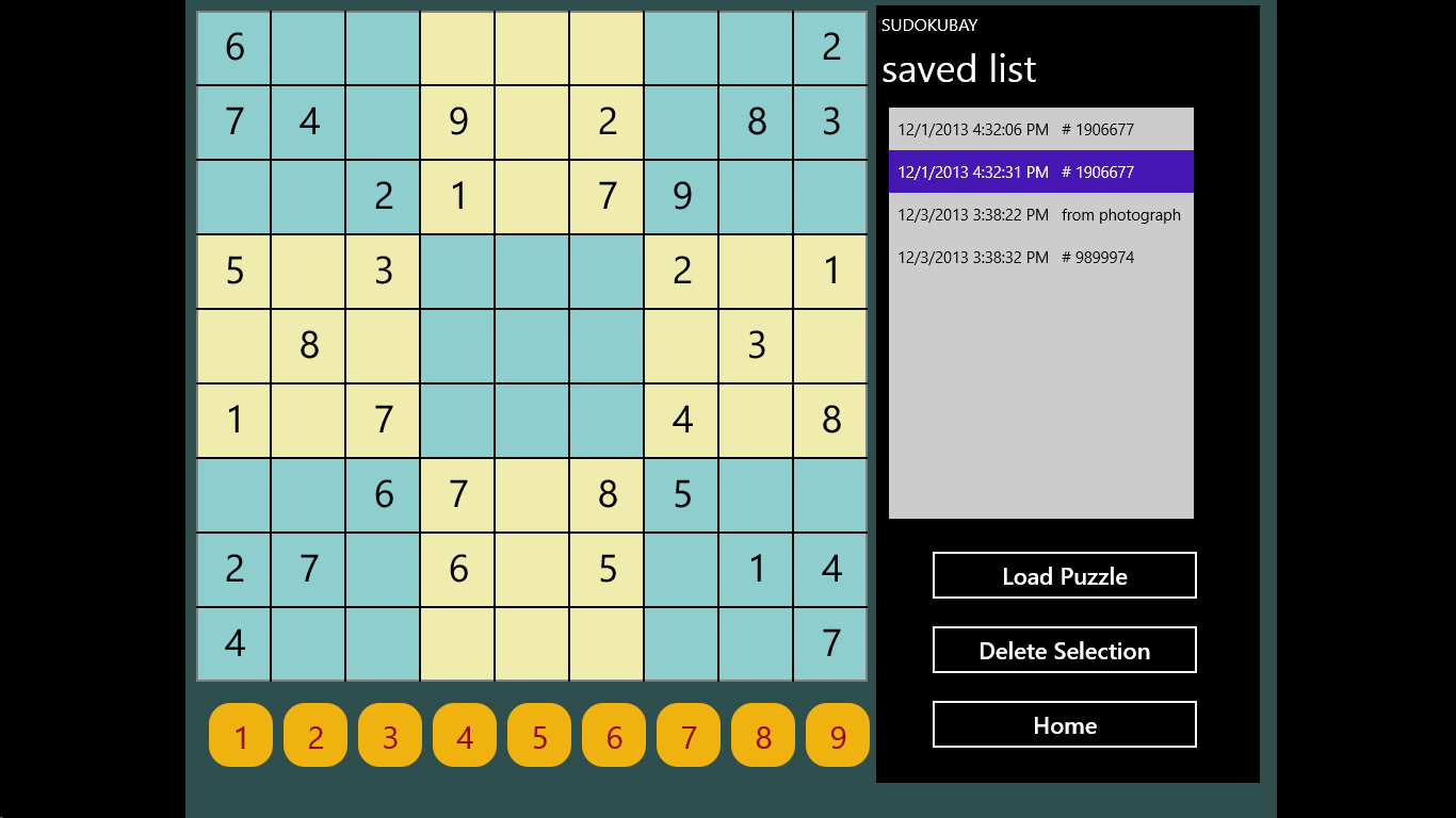 SudokuBay assigns a number to each puzzle it generates. You can share a puzzle number with your friends and all work on the same puzzle at once. An entry on the Home page lets users generate a puzzle from the puzzle number you send them. The puzzle number also generates the same puzzle on the Windows Phone App Sudoku Capture.
