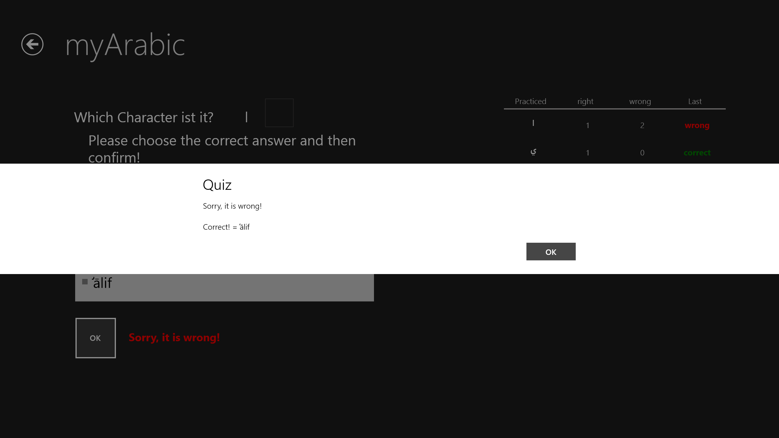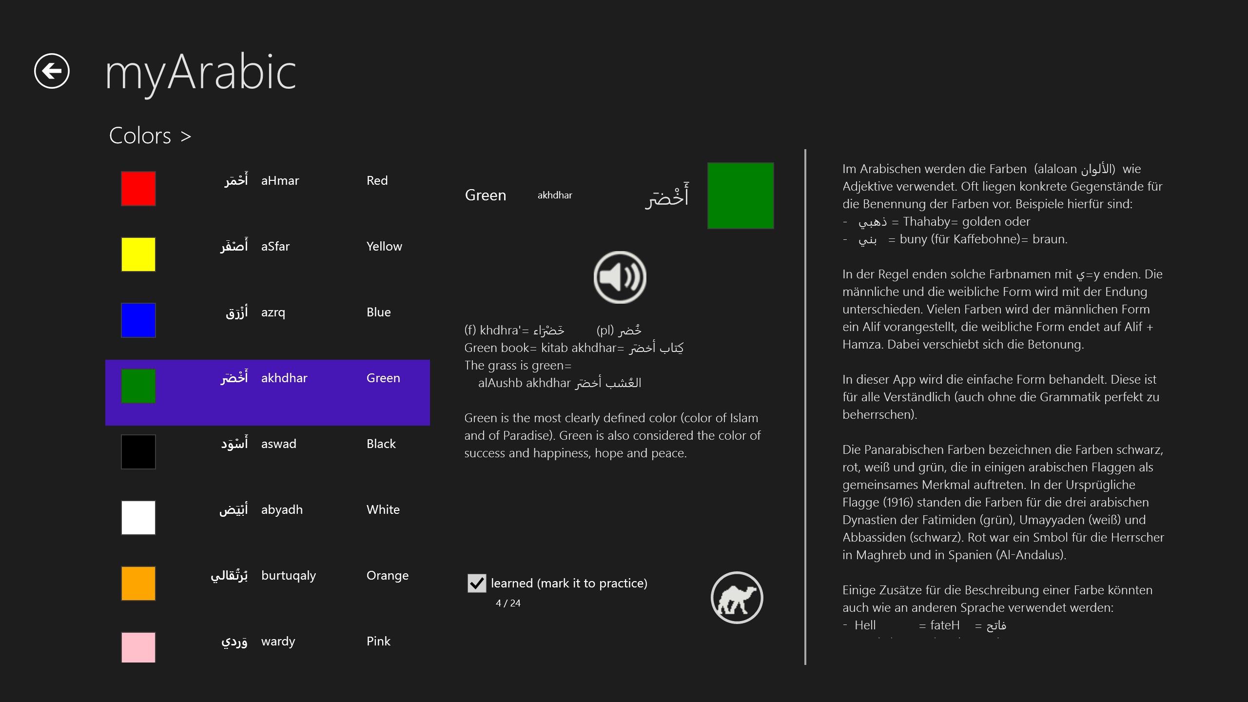 The app addresses people want to learn Arabic. It is gives a brief introduction to Arabic. The Alphabet, Colors, Numbers and Words can be viewed and learned. The individual letters, colors, numbers and Words can be selectively learned. Learned and selected elements can be practiced (quiz). Statistics on trained elements can be viewed or reset (Options). The App series myArabic deals with: numbers, colors, words and phrases. The app can be used with an English or German user interface and content.