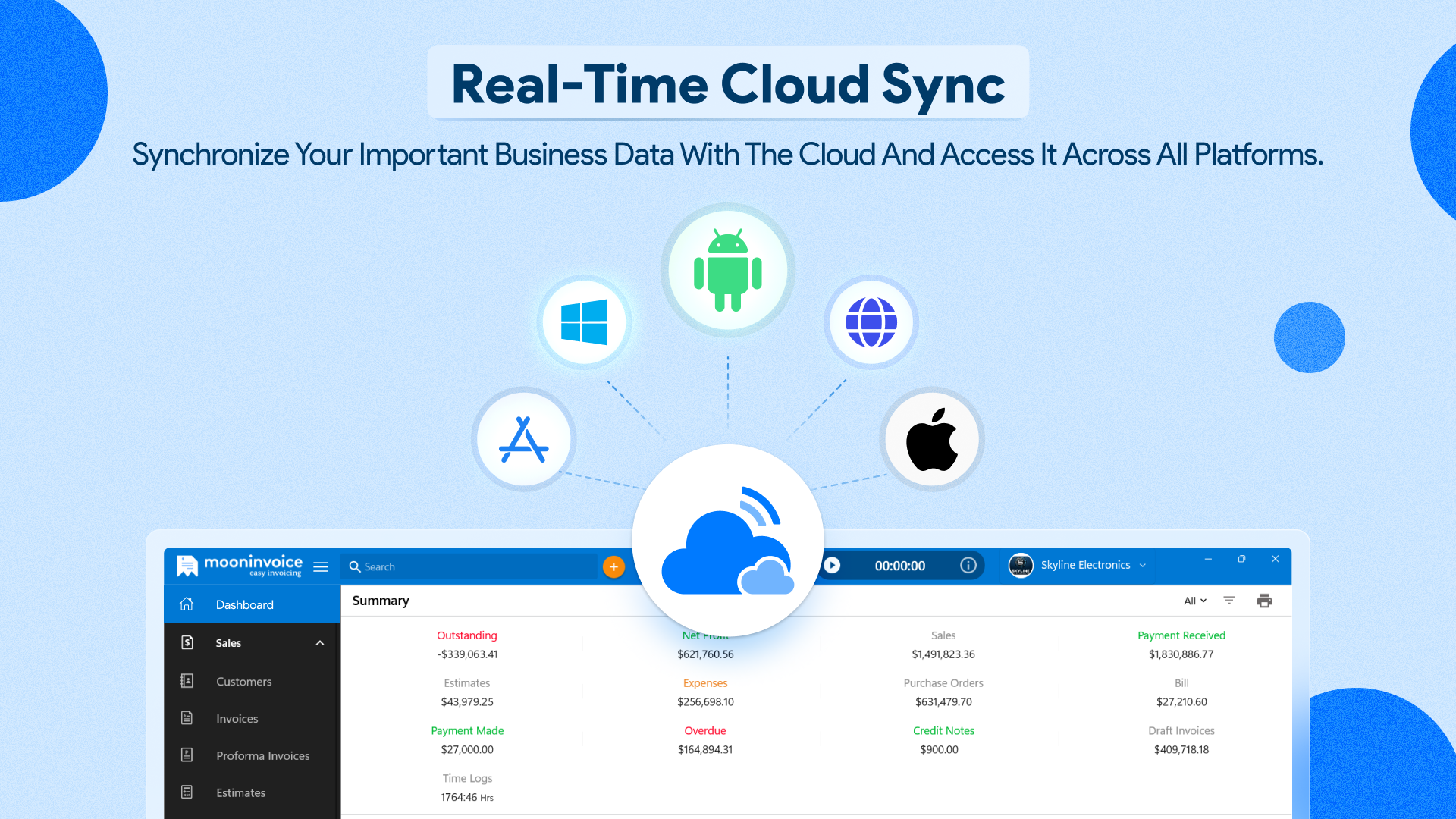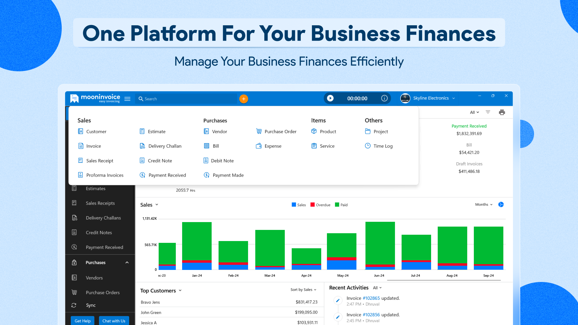 We have got an interactive dashboard to help our users get a complete idea of the business insights, including outstanding, total sales, net profit, proforma invoices, payments, overdue, draft invoices, credit notes, time logs, top customers and vendors, top products, and other recent activities.