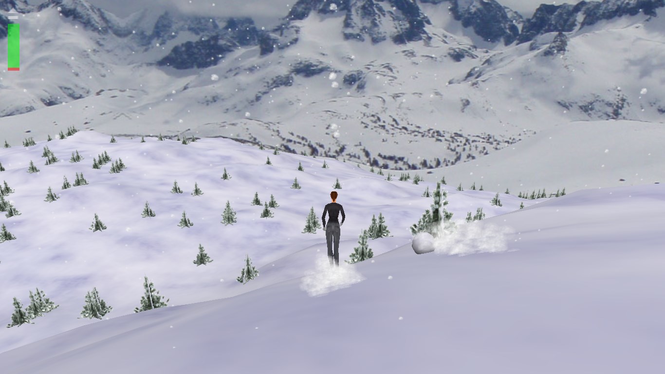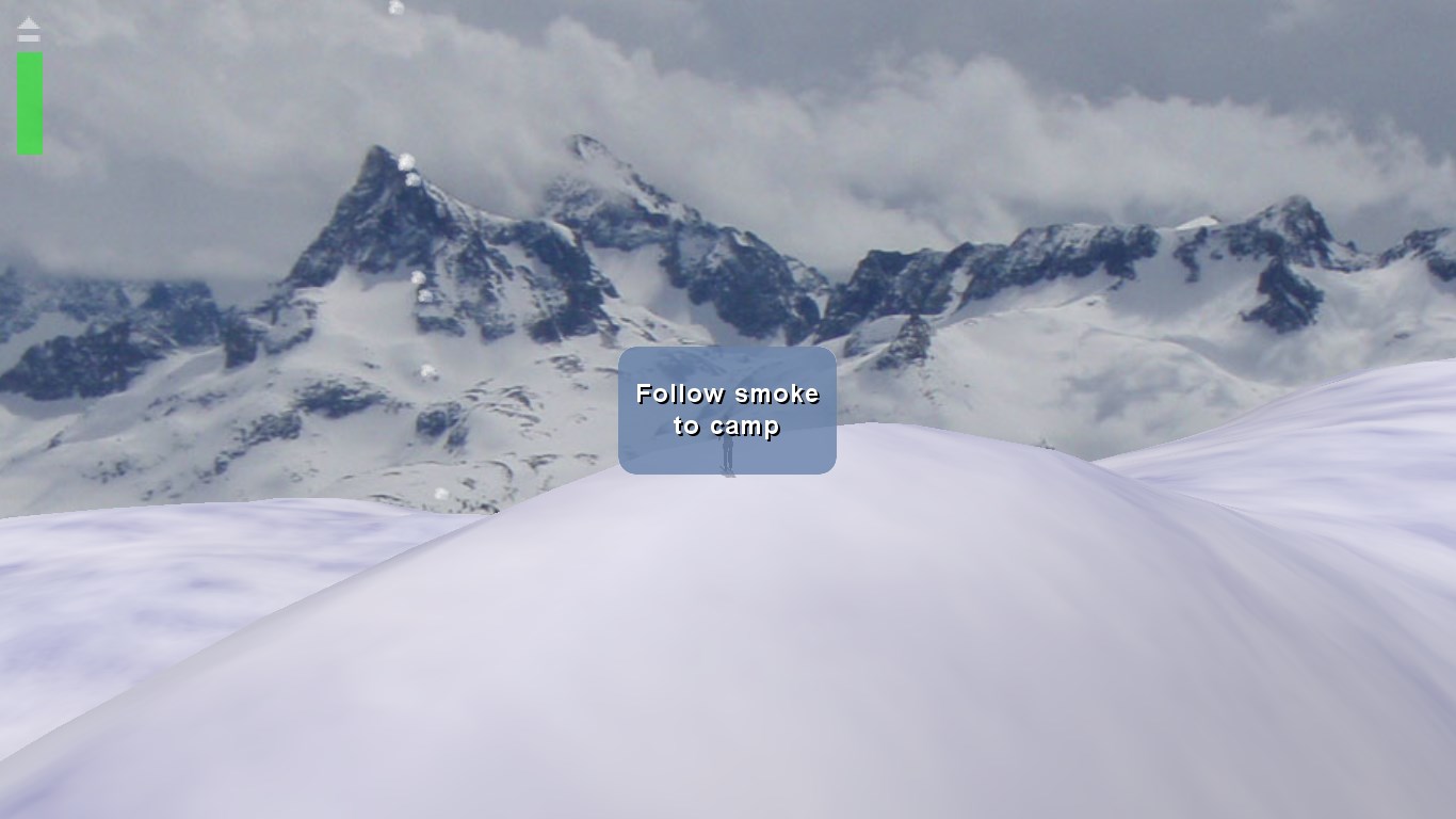 Ski down the mountain following smoke to your camp. Watch out for trees, cliffs, avalanches, and exhaustion. Your health goes down with each crash and with passing time. If the bar at upper left turns completely red the game is over.