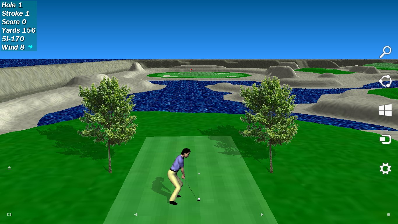 Hills, water, undulating fairways, sand traps, and tiered greens.Male or female player choice.Choice of two computer opponents or solo play.Top scores leaderboard.