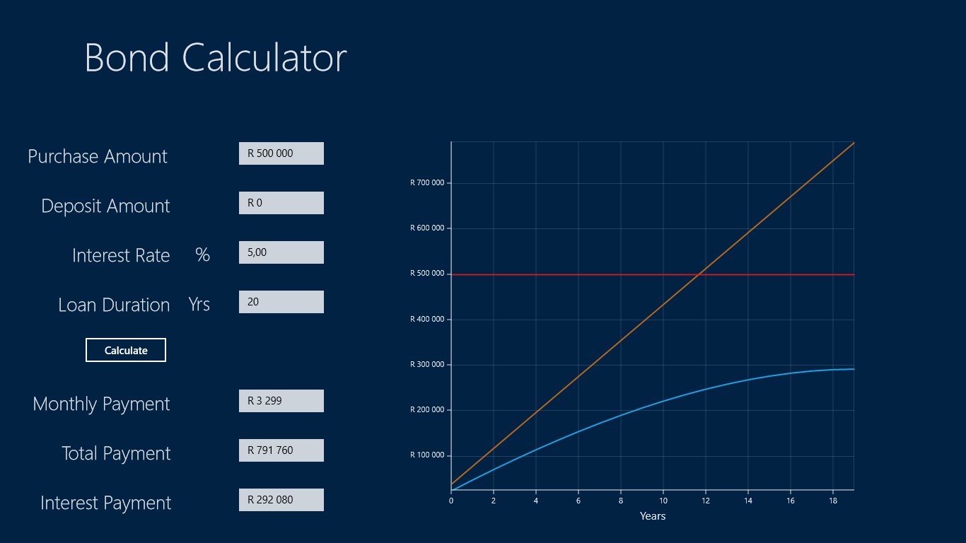 Easy to use Home Loan / Bond calculator. Display Monthly Payback, Total Payment and Interest Payment numerically and graphically.