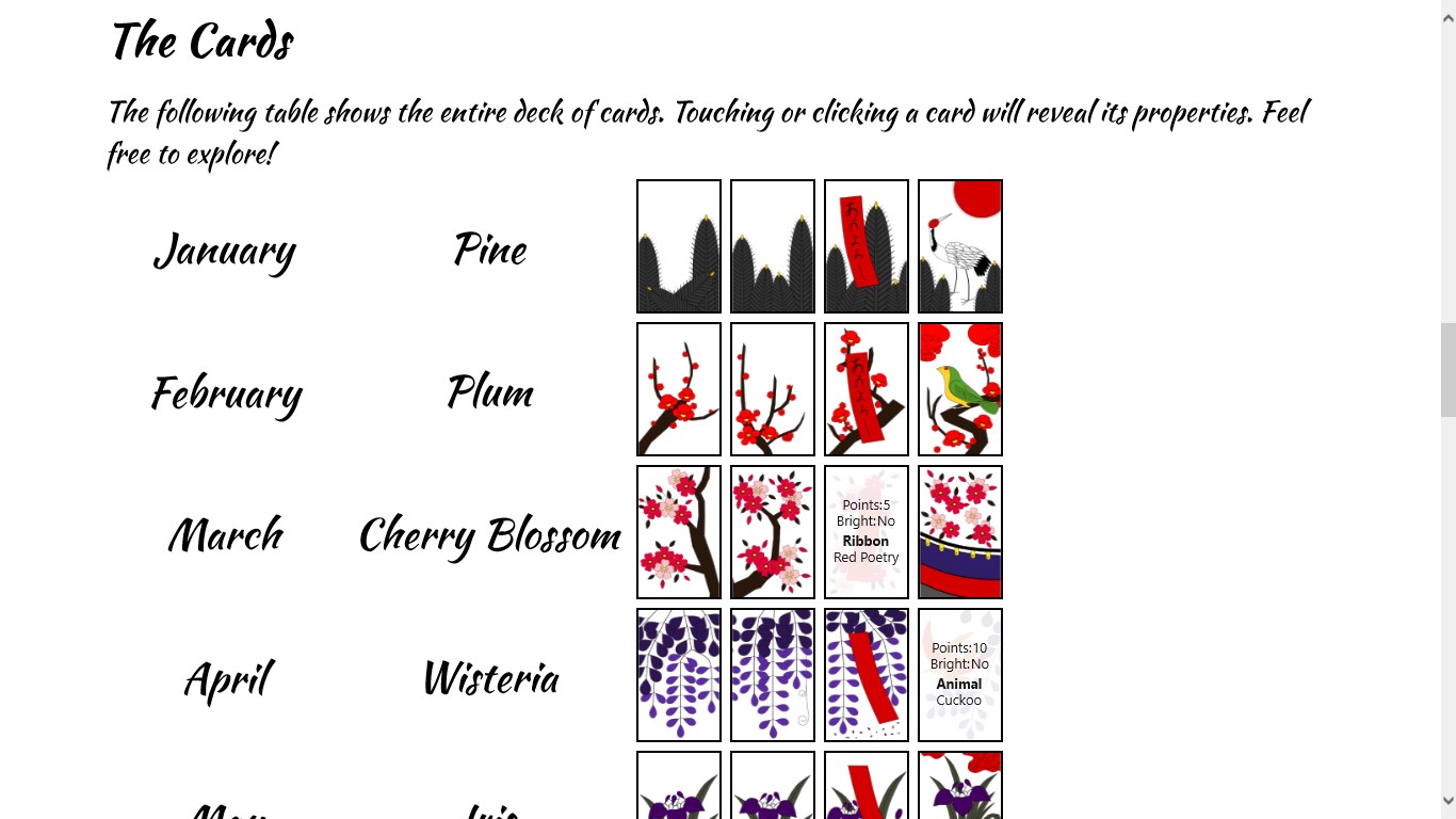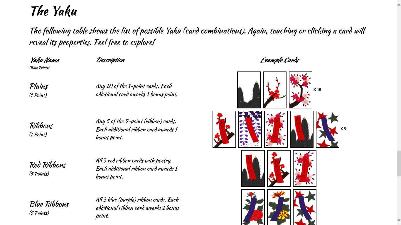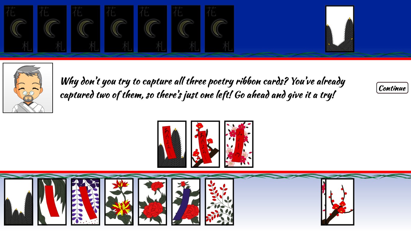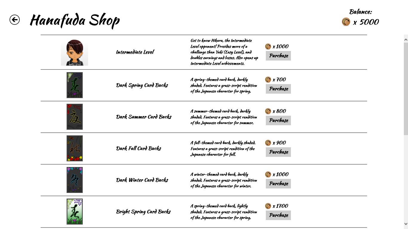 Integrated tutorial and hints help to learn the game.Includes a detailed explanation of rules.Choose the length and difficulty of each game.Illustrated lists of all cards and combinations.Japanese Matsuri (festival) music sets the mood.Master Hanafuda with a full set of achievements.