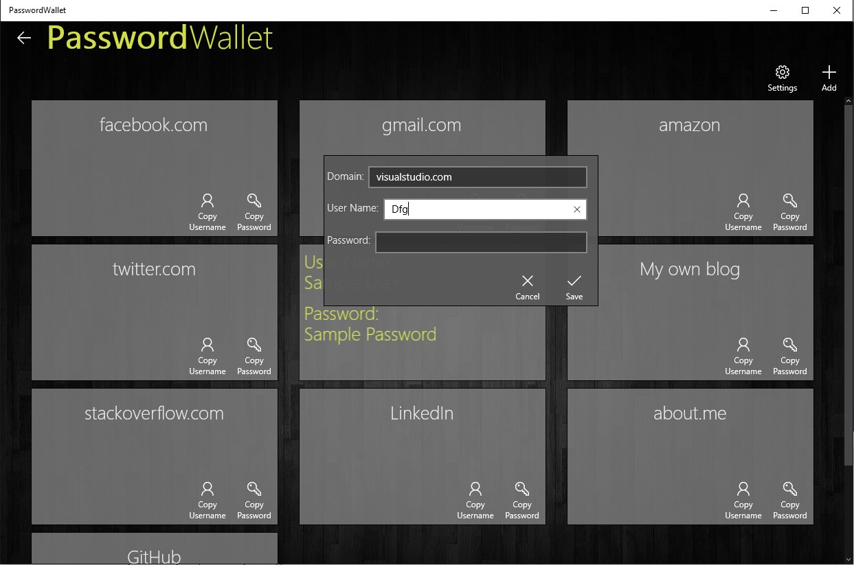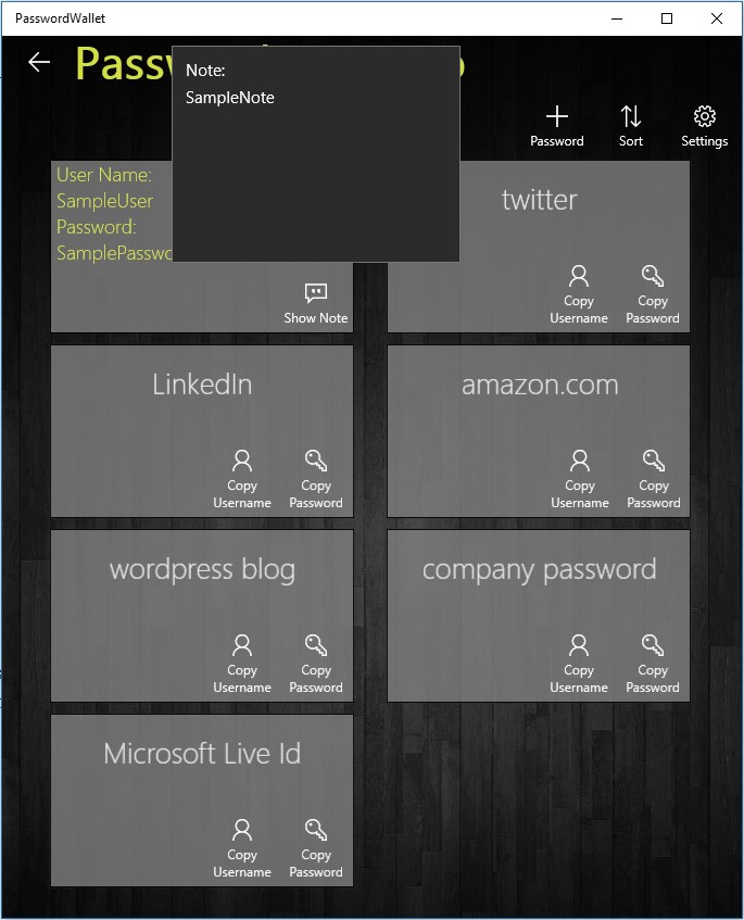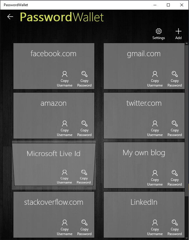 PasswordWallet is a tool to store your passwords and usernames for different domains. You can easily copy and paste the stored items with the buttons on the tiles.