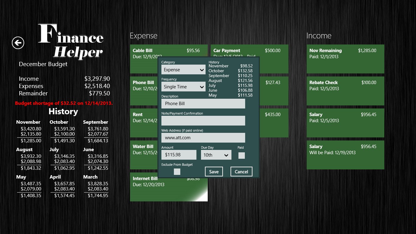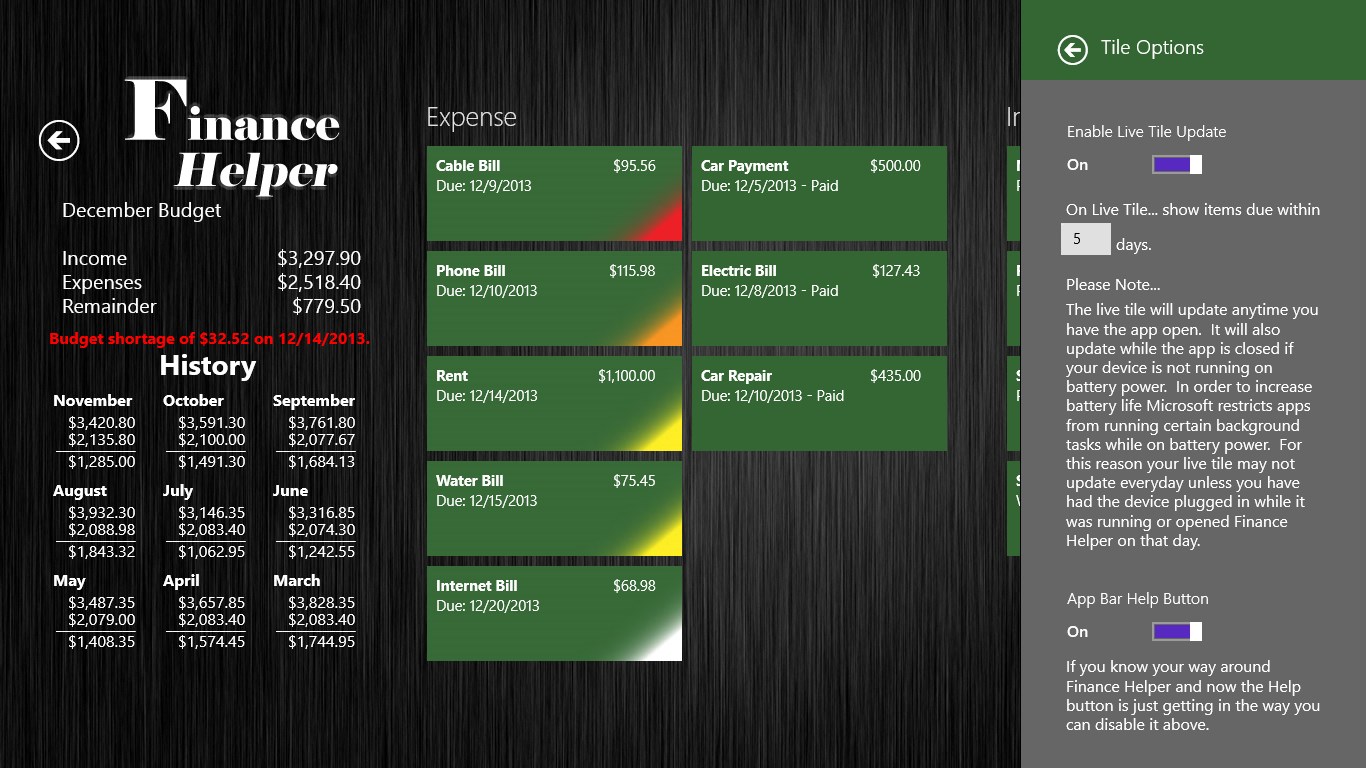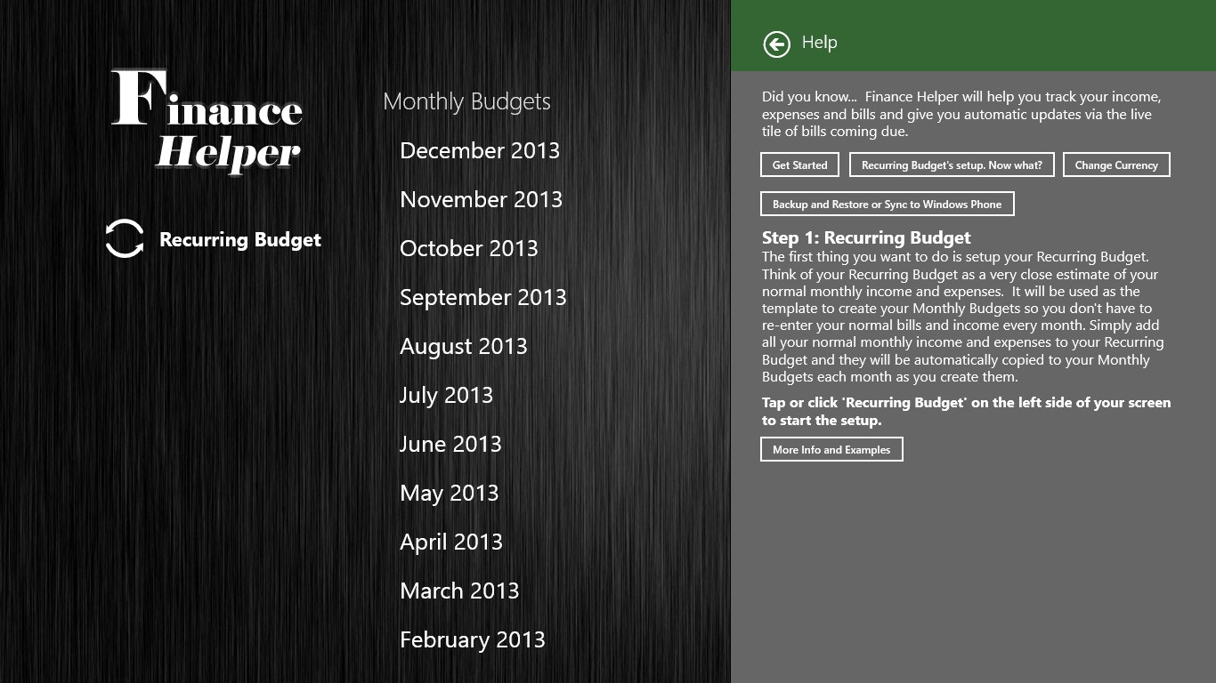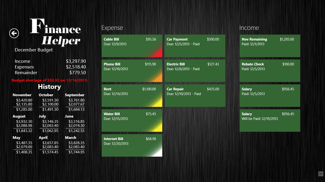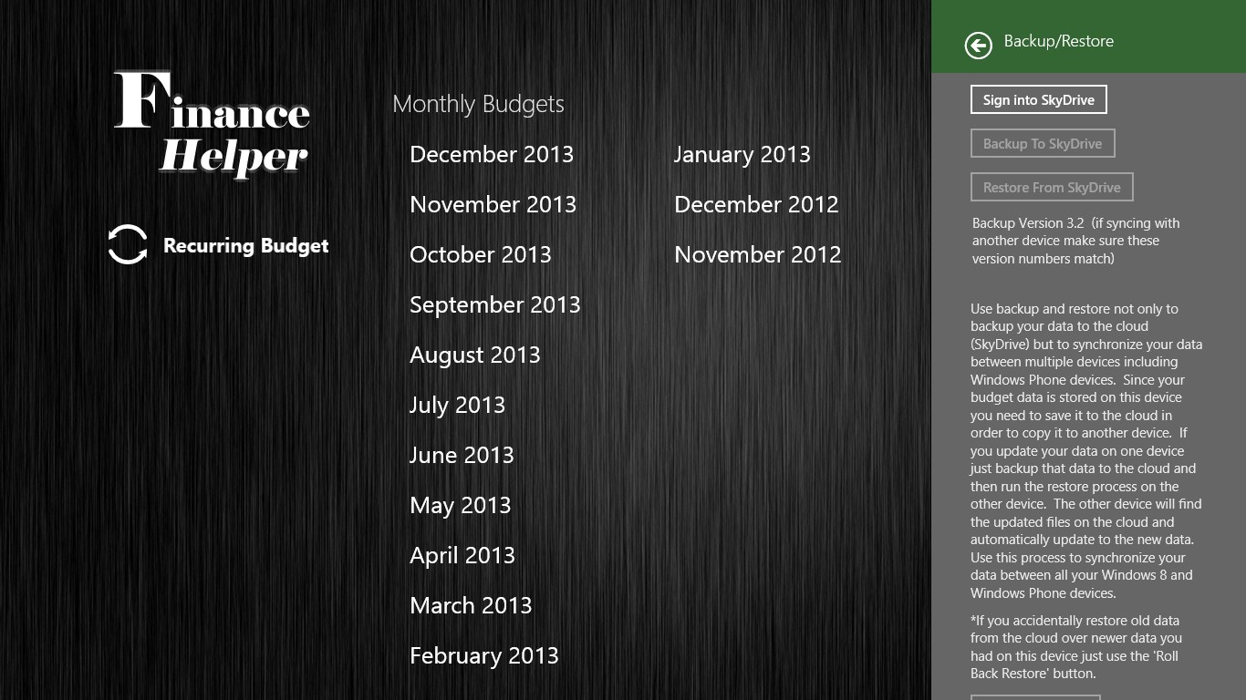 Supports all global currency and date formats.Optional Live tile that shows you what bills are coming due and what bills are past due.Track your income and expenses month to month and carry your monthly remaining balance forward. Or negative balance… it happens, we know.Store all your recurring income and expenses like salary, rent, electric bill, etc. in one \“Recurring Budget\”Enter your non-recurring items and, if needed, edit the amounts of recurring items on your monthly budgets.Enter due dates on your expense items and track them until they have been marked paid. They\’re even color coded based on due date.Save your budget data to the cloud and synchronize it with all your Windows 8 or Windows Phone devices.Easy to understand interface with built-in helpView the payment history of the items in your monthly budgets to see how a particular bill is trending.Schedule items to occur Weekly, Bi-Weekly, Monthly, Quarterly, Semiannually or Annually