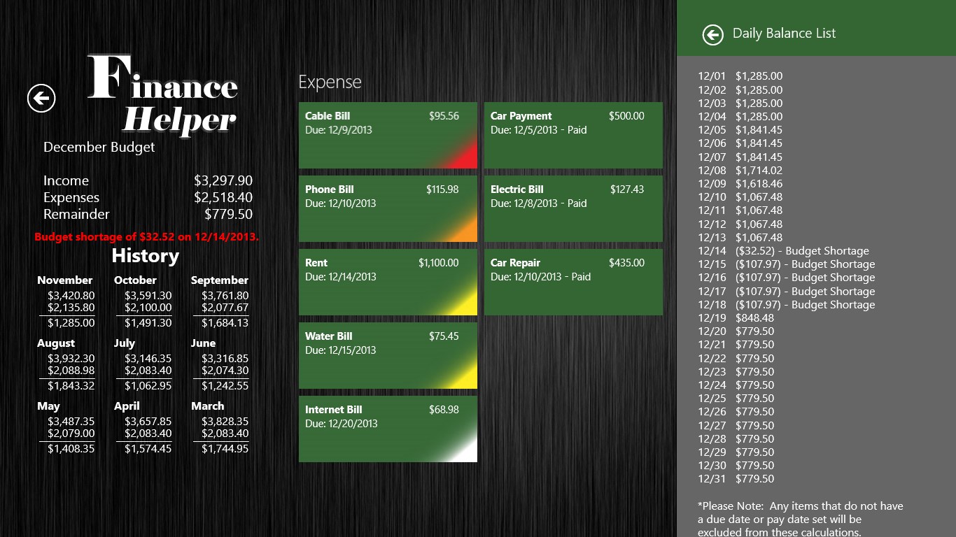 **Now with unlimited free use.** Easy to use budget and bill tracking tool with the features you need without all the confusion you don’t. Need a live tile showing what’s coming due and what’s past due? We have that. Would you like to enter all your RECURRING income and expenses only once and have your monthly budgets automatically include them and synchronize that same data to any of your Windows 10 or Windows Mobile devices? We have that too. Want to see the payment history on the bills you pay so you know you’re not paying twice as much for electricity as you were this time last year? Have it! Looking for a way to graph how much you spend on cereal compared to the average daily balance of your wallet on Tuesdays? Afraid we can't help you there and you might consider turning off your device and going outside for a bit.