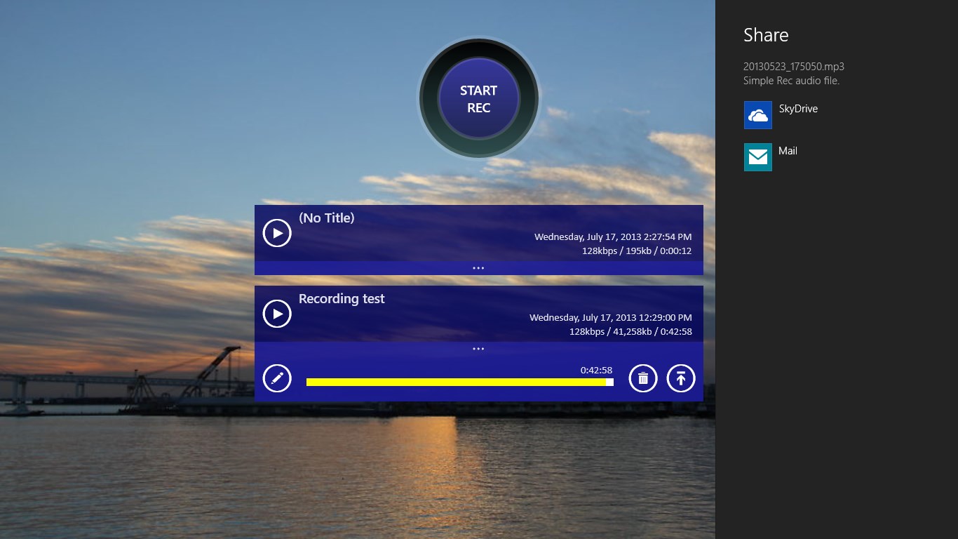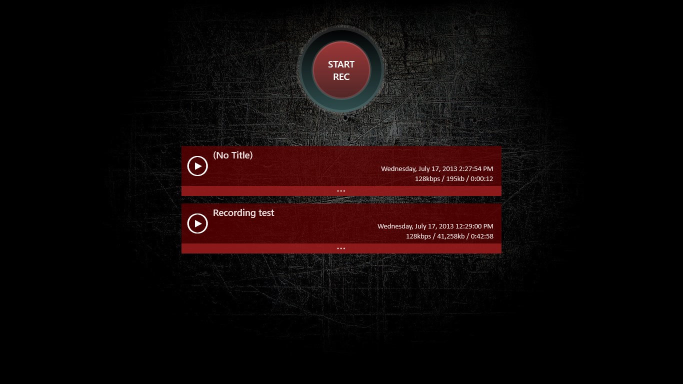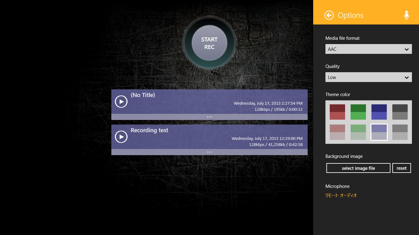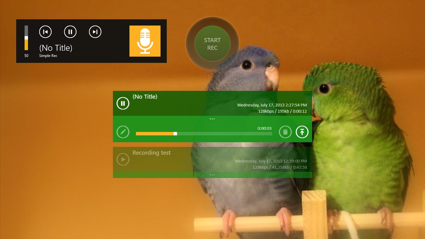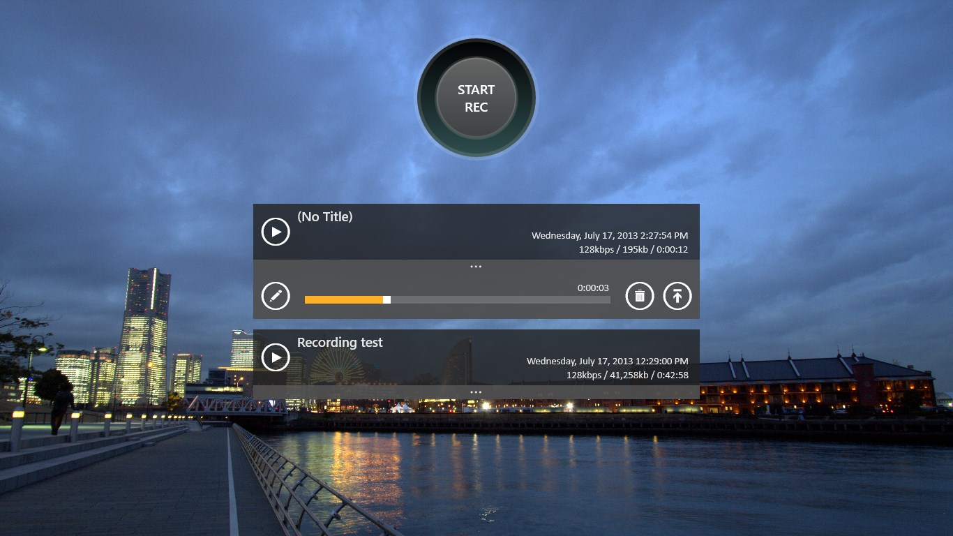 One touch recording, playback.Edit title, Delete file.File sharing, Background playback support.Theme color and background image settings support.