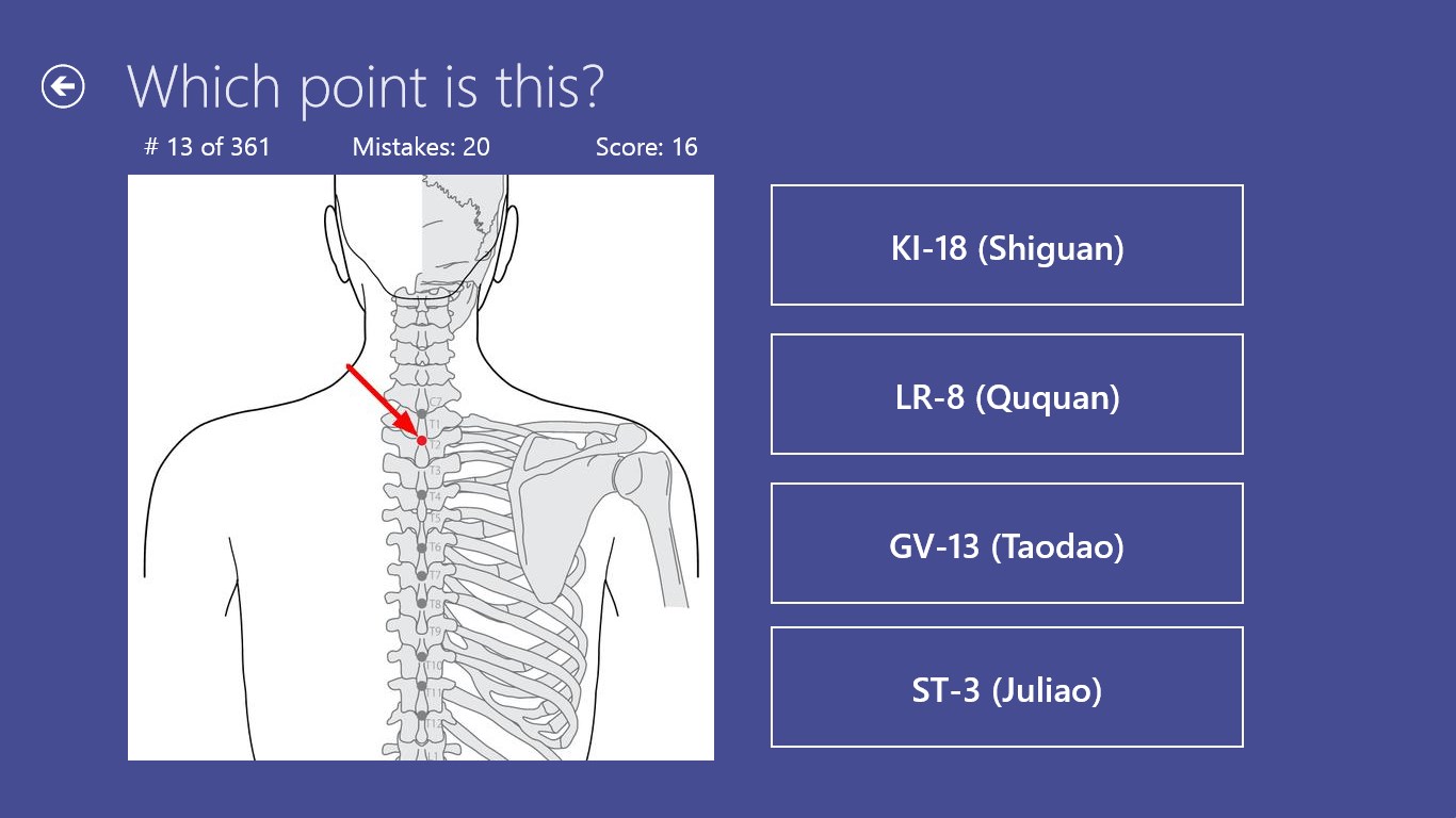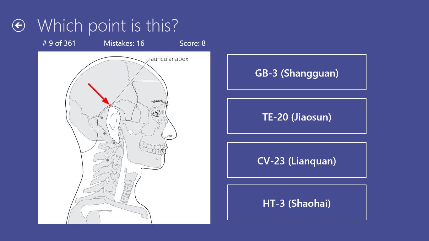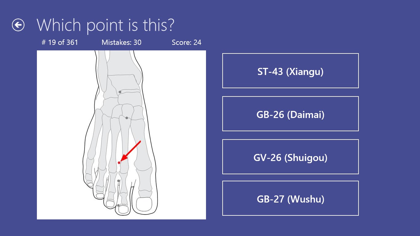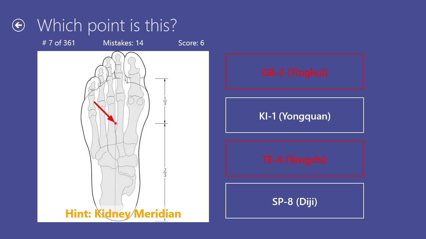Contains all the 361 traditional points.You can select points for game by meridians.App remembers state of the not finished game and allows to continue it.Results are stored in history (total/by meridians), so you can check your progress of learning.Multilingual: supports English, German, and Russian.