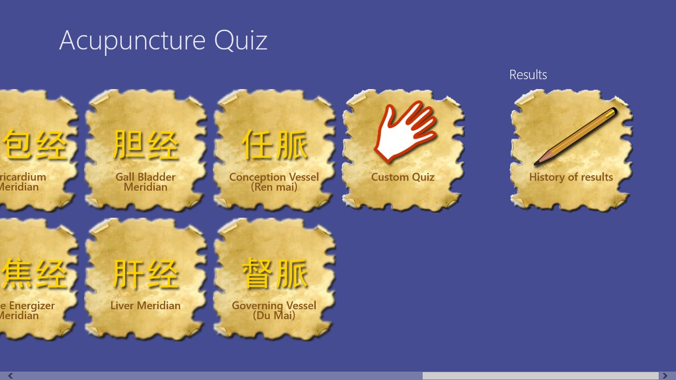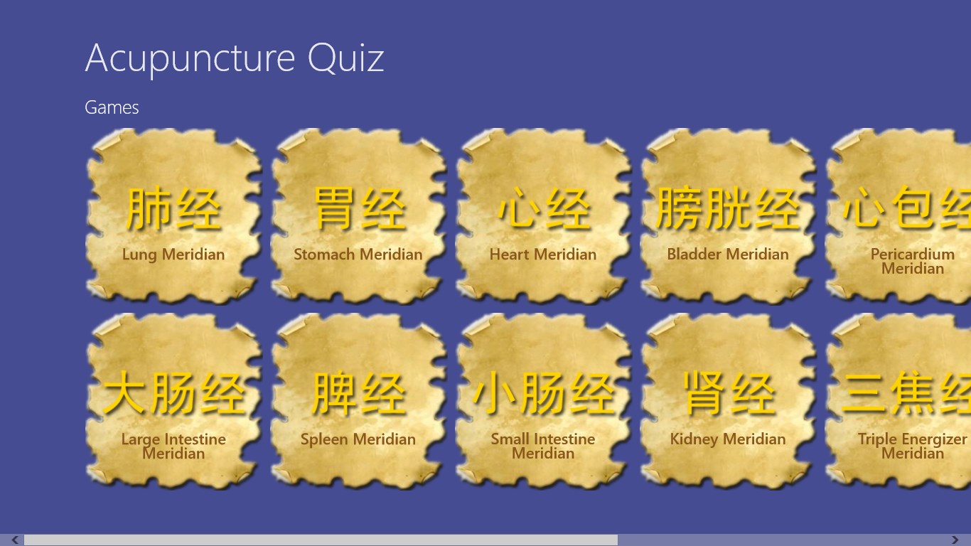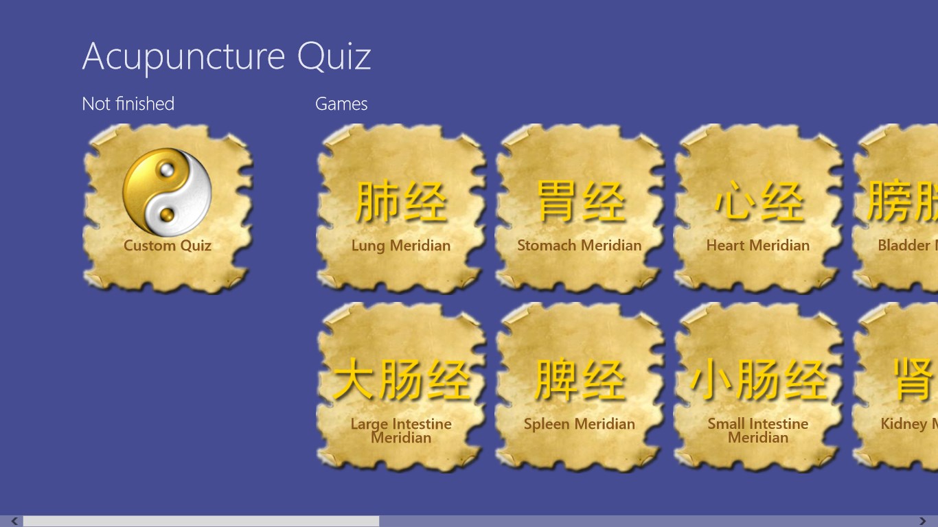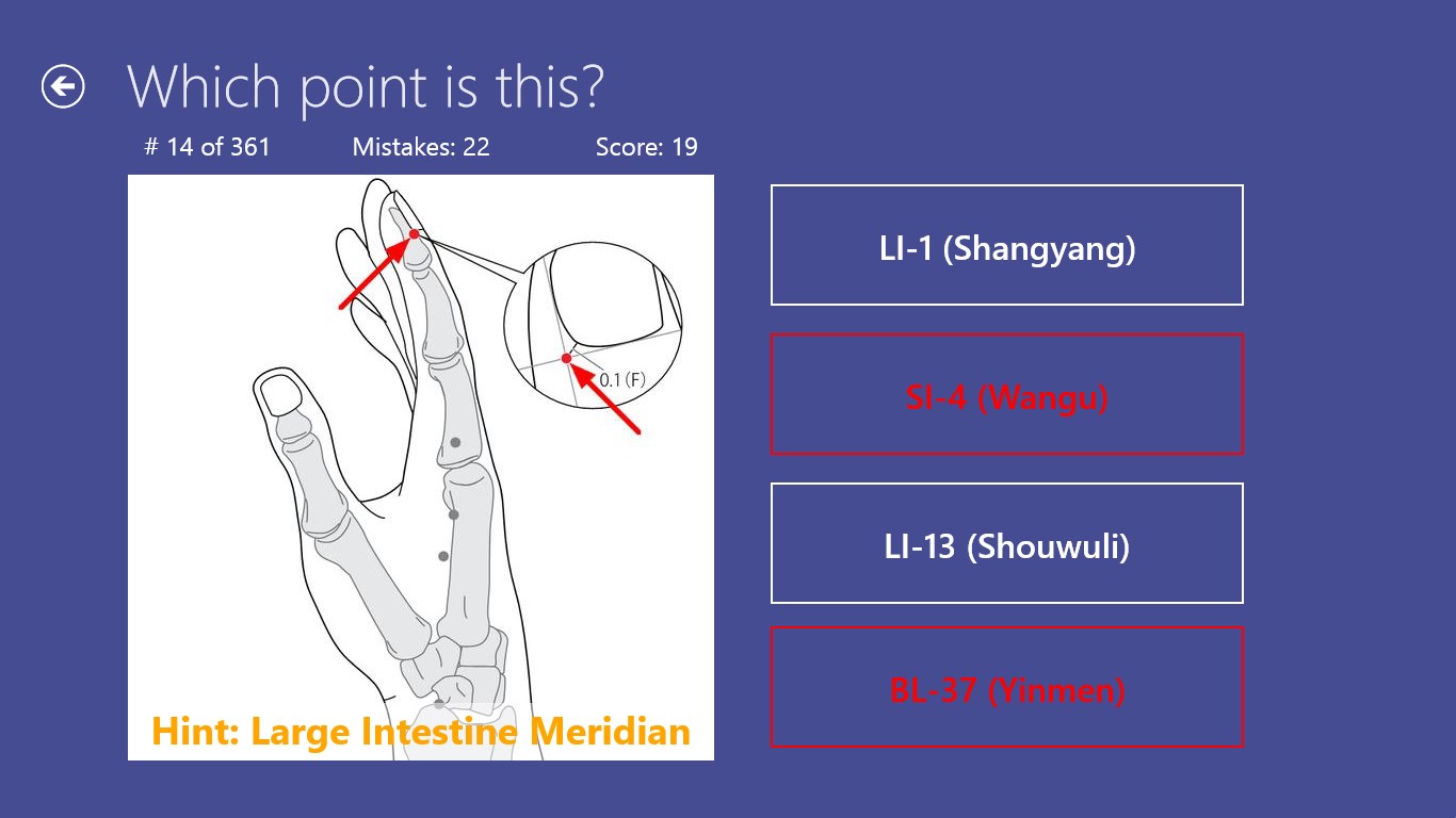 Contains all the 361 traditional points.You can select points for game by meridians.App remembers state of the not finished game and allows to continue it.Results are stored in history (total/by meridians), so you can check your progress of learning.Multilingual: supports English, German, and Russian.