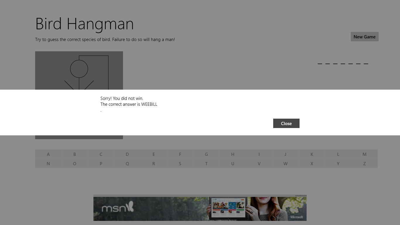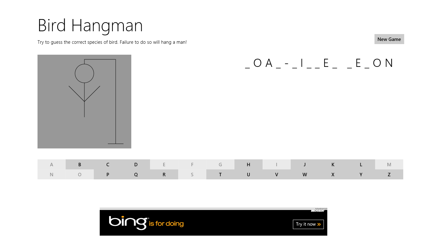 RULES: A series of blanks will show up on the screen. Each blank represents a letter from a random bird name. You will then have to guess a letter. If the letter you chose is in the random bird's name the underscores representing that letter will be replaced with that letter. If the letter you chose is not in the birds name, you will begin hanging the man on the left of the screen. Once you chose a letter you cannot chose it again. If you choose six letters that are not in the random bird's name you will hang the man. Choose "New Game" for a new random bird.