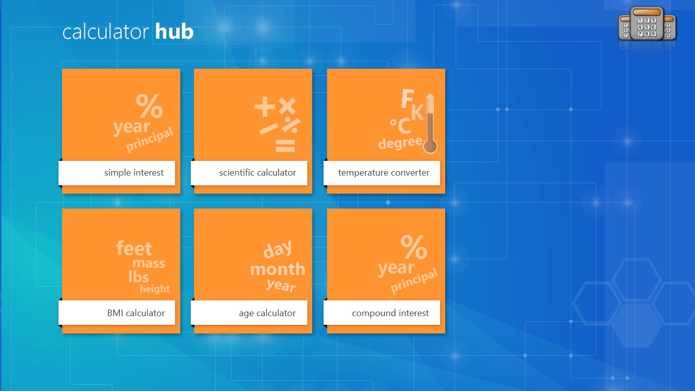 Ever wanted something all in one...where your work becomes hassle free and quick? Then here's presenting you the all new all in one Calculator Hub specially designed for those who need a quick edge in their calculations. It has 6 calculators which can be used for multipurpose and complex calculations. It has a mix of scientific,conversion of temperature,Interest,age,Body Mass Index etc. Fast,quick and simple all in one package!